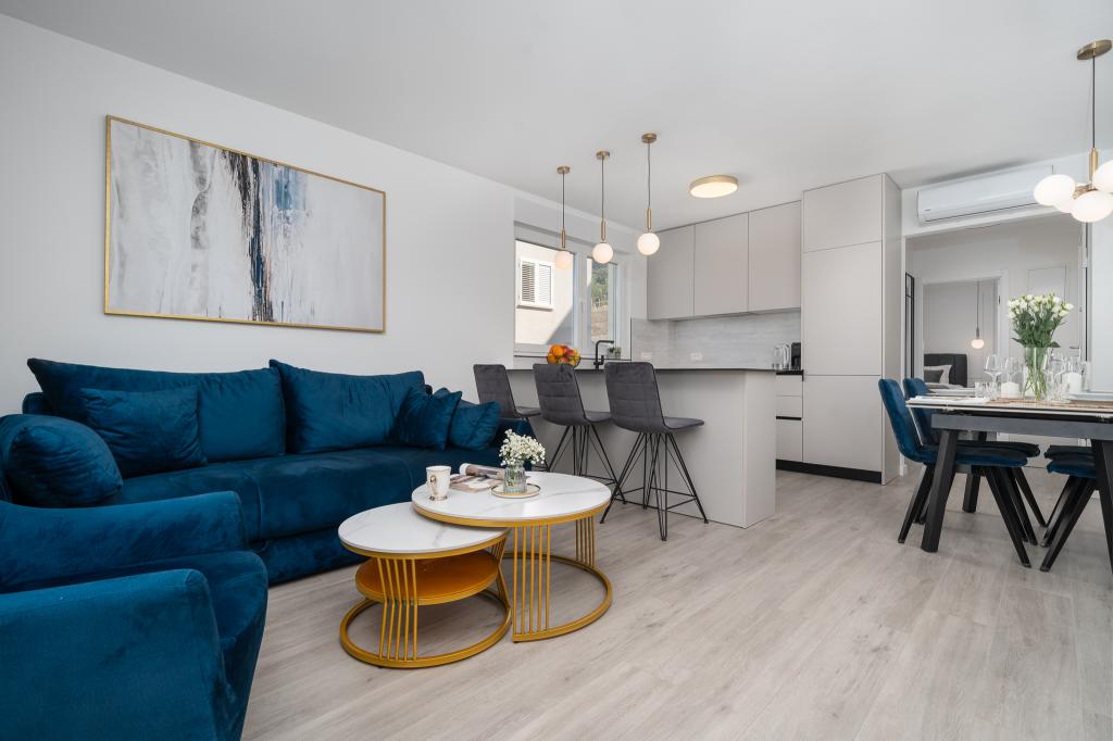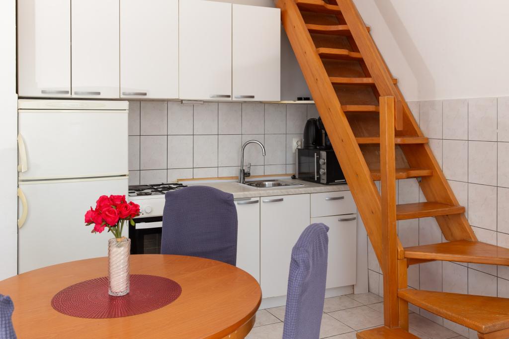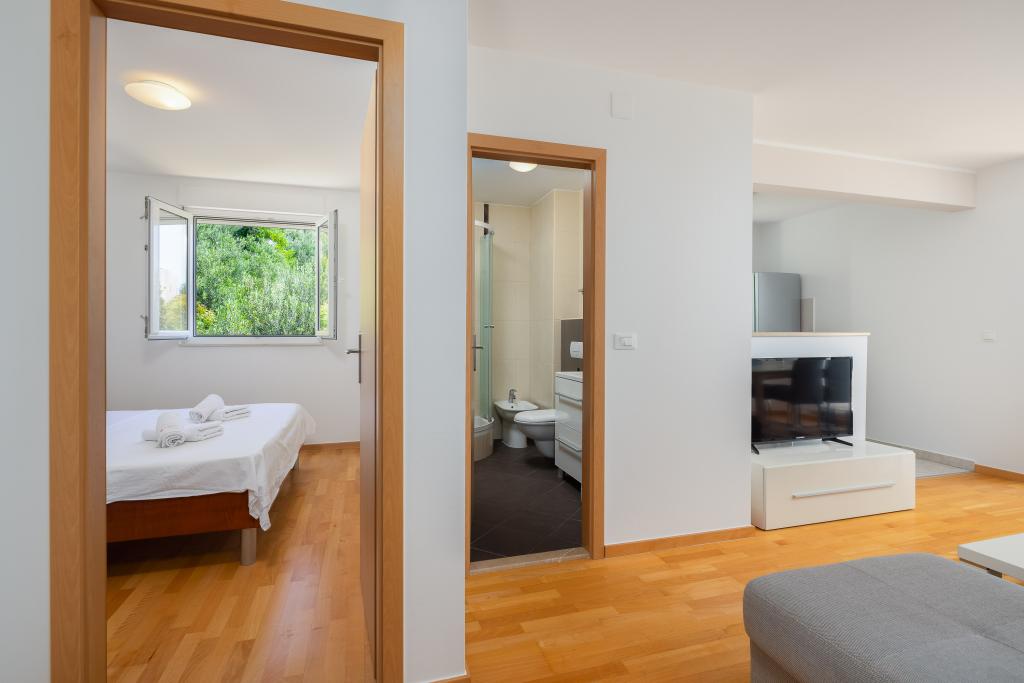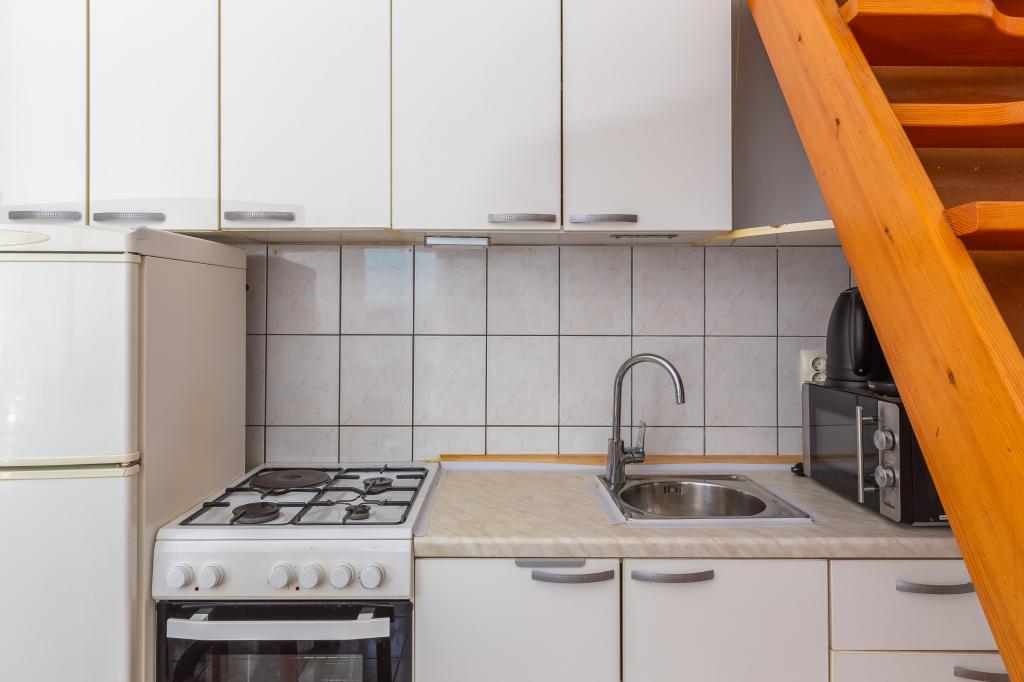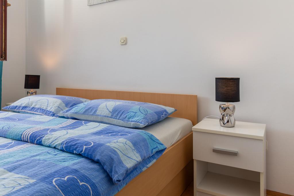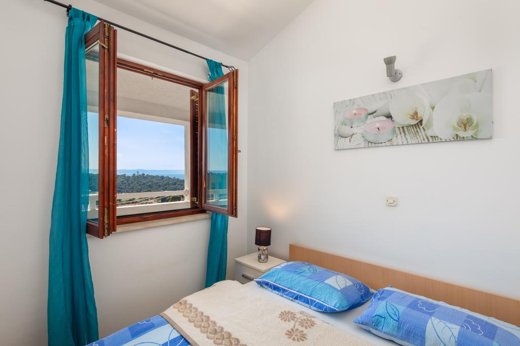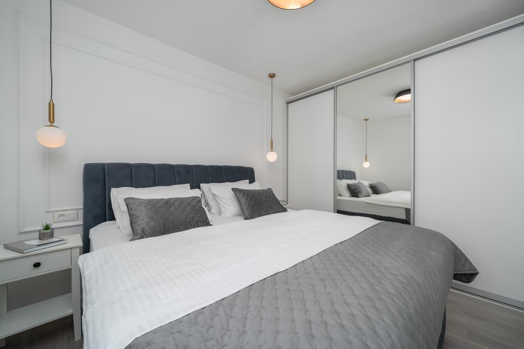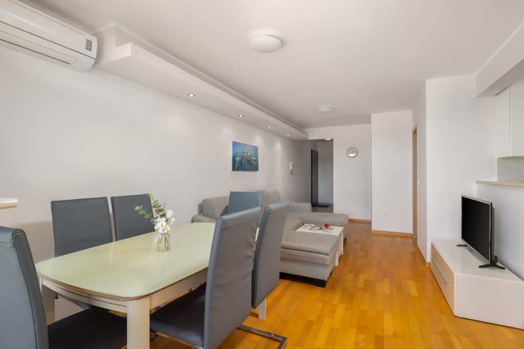Cet appartement comprend une chambre, un salon avec un canapé-lit, une cuisine et un balcon avec vue sur la mer. Il y a un parking gratuit devant le bâtiment.