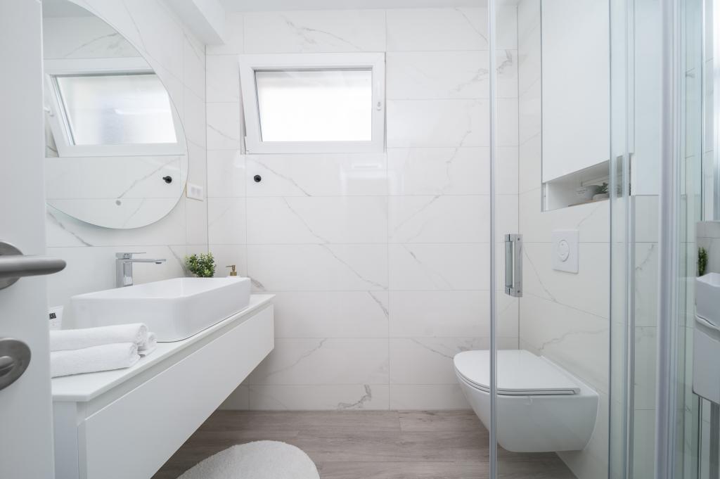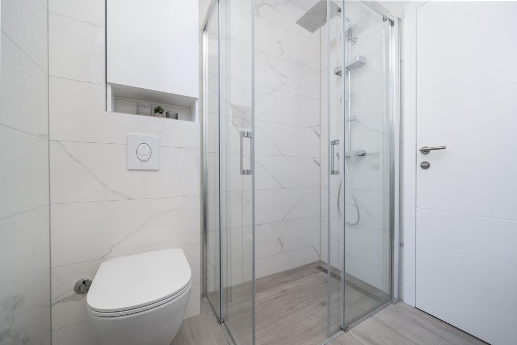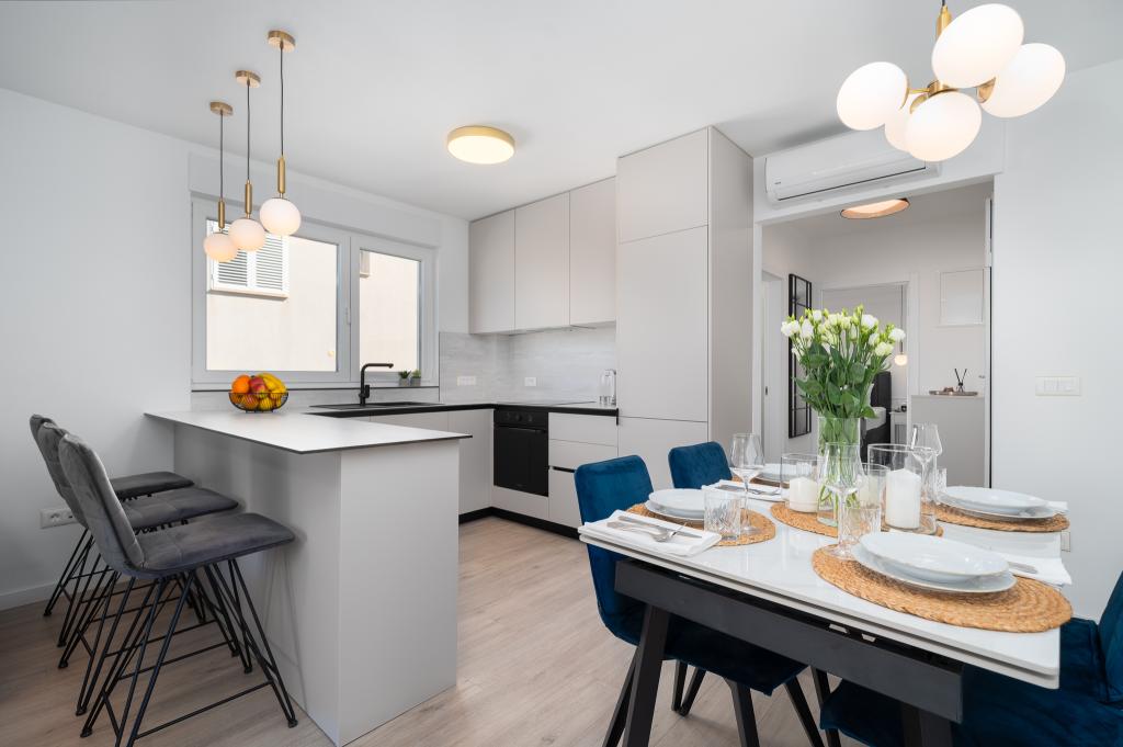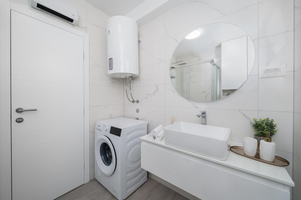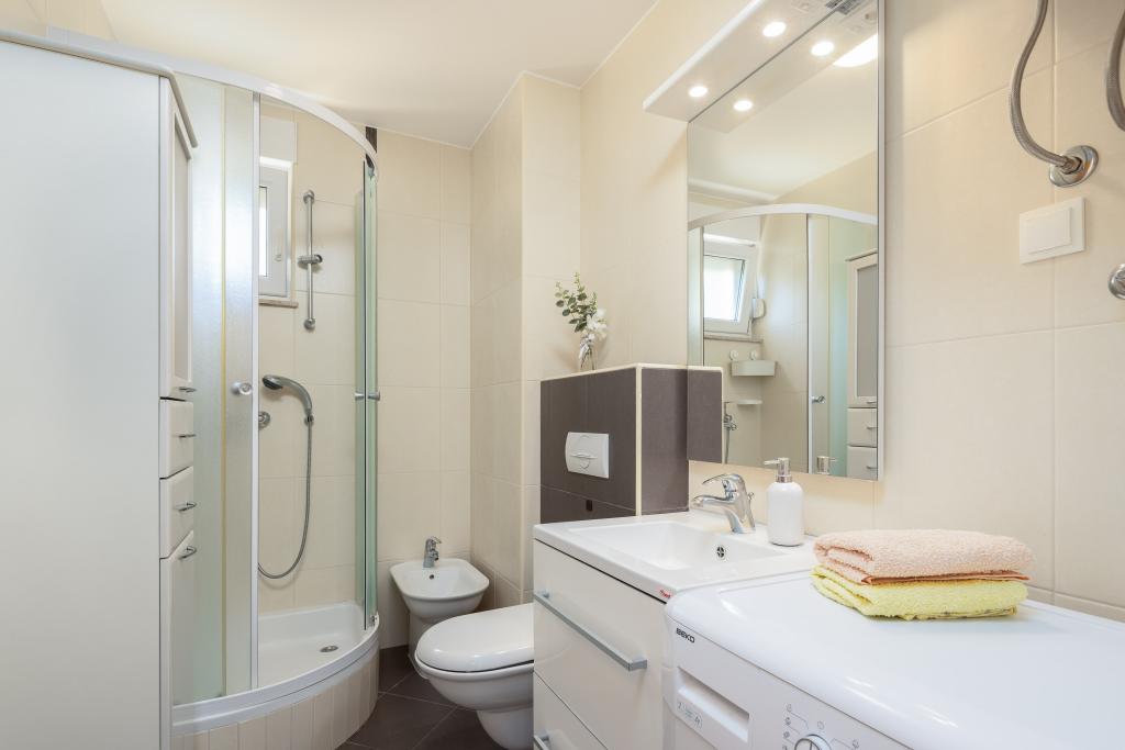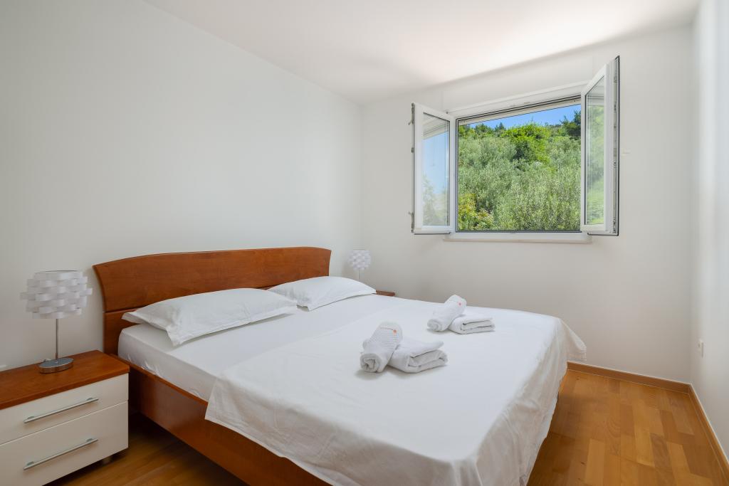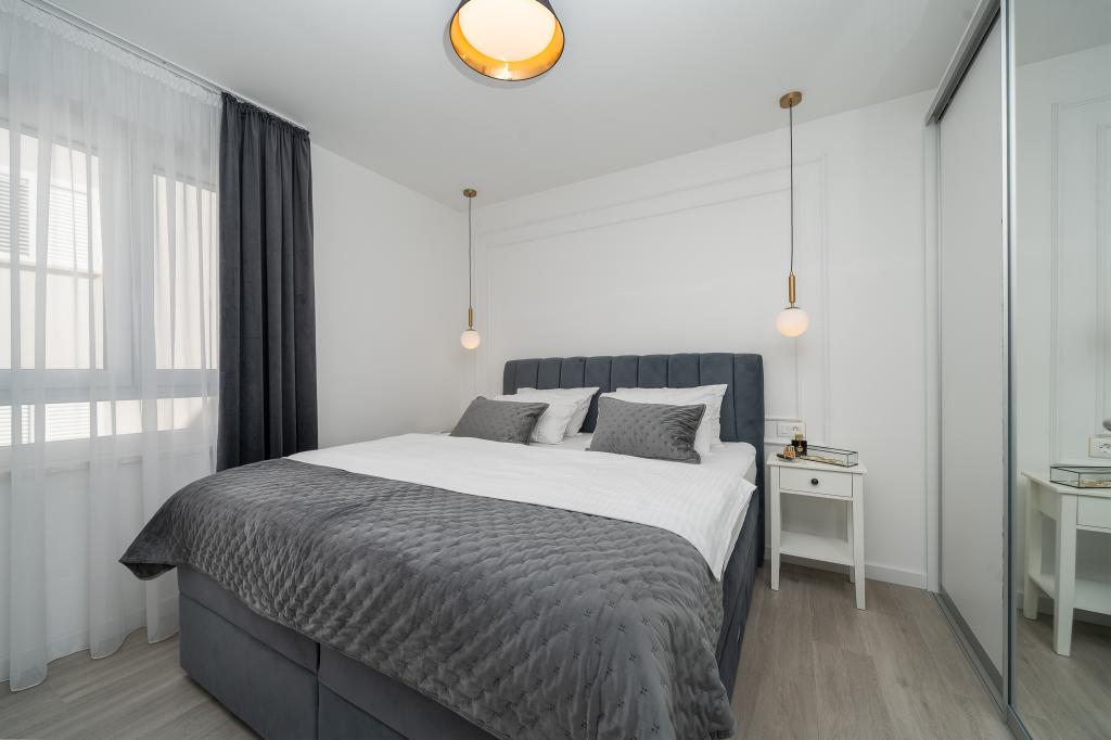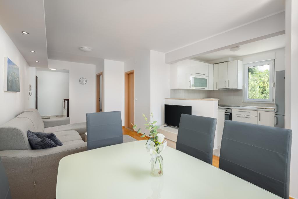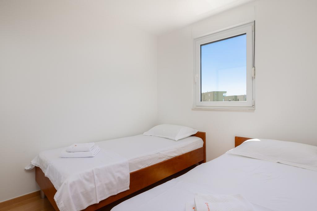 Cet appartement comprend une chambre, un salon avec un canapé-lit, une cuisine et un balcon avec vue sur la mer. Il y a un parking gratuit devant le bâtiment.