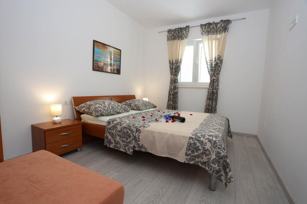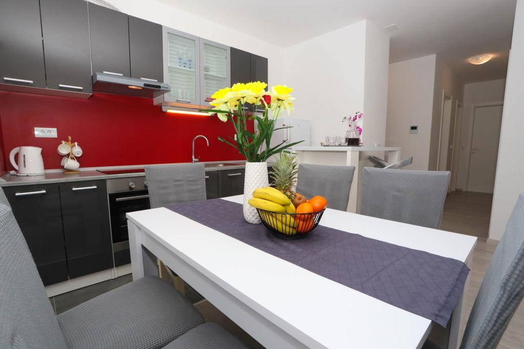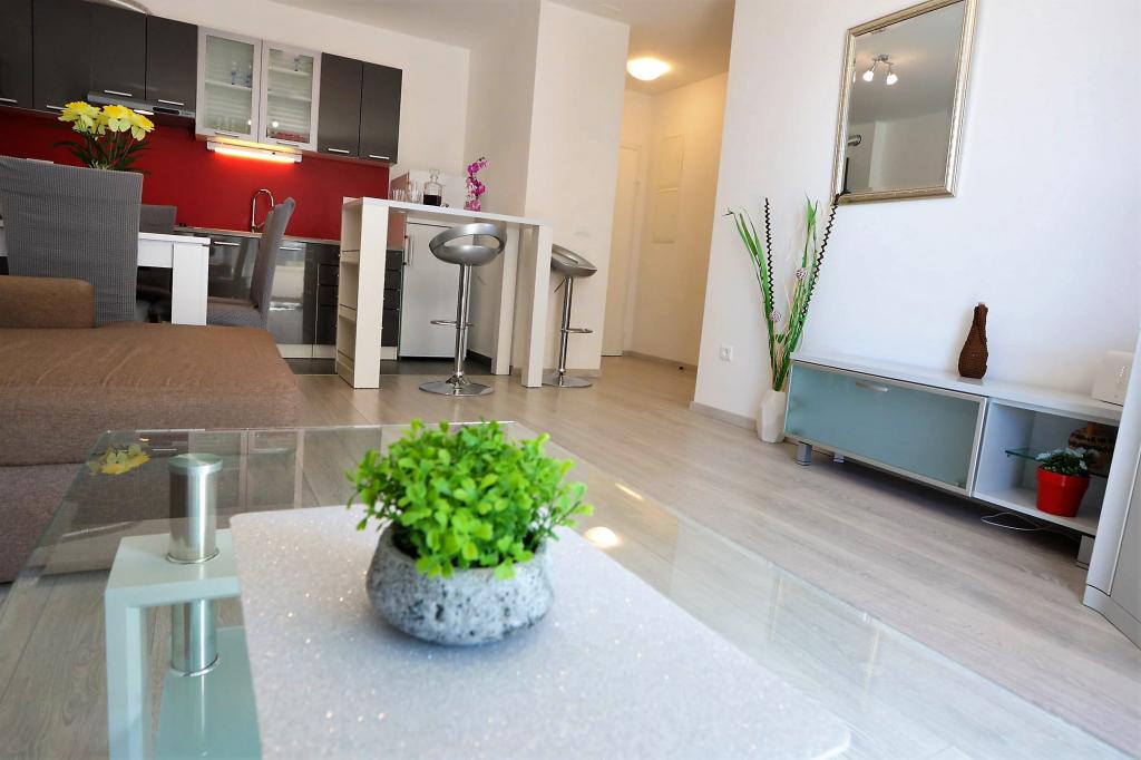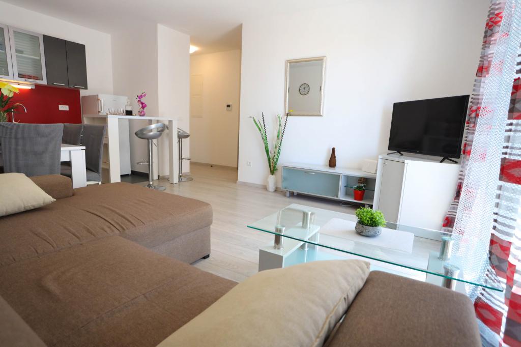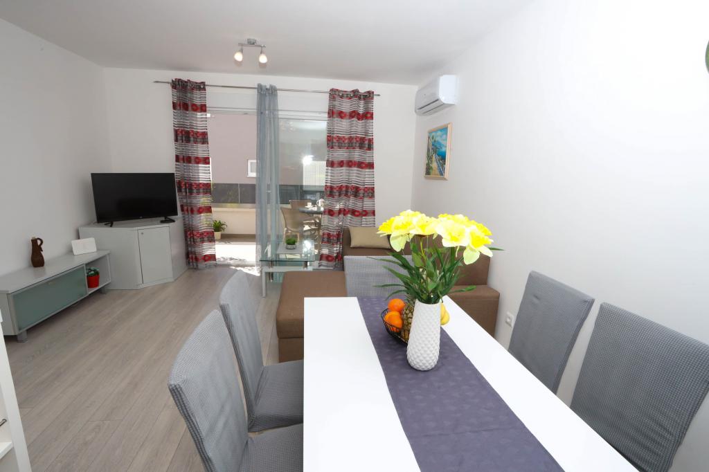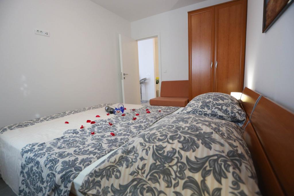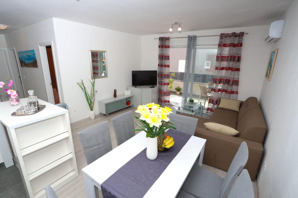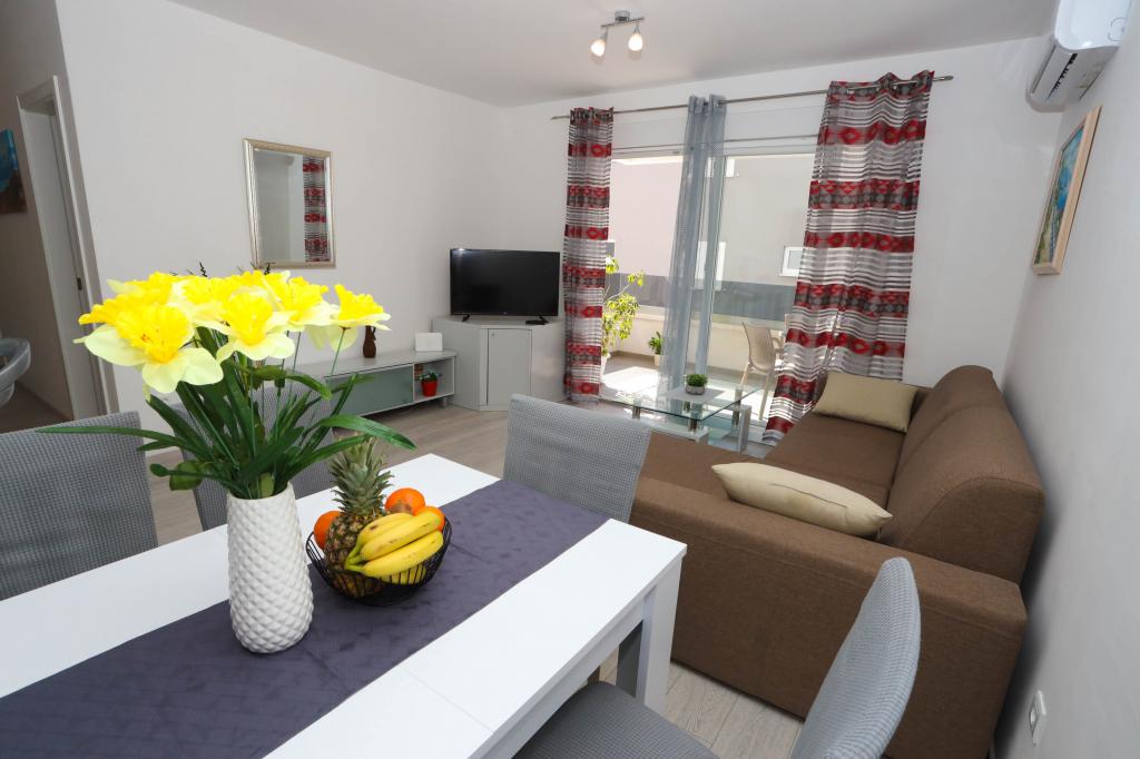 Appartement moderne et équipé situé au premier étage d'un immeuble résidentiel neuf avec ascenseur. Il offre tout le nécessaire pour un séjour agréable. L'appartement Petra comprend une salle à manger avec cuisine équipée, un salon avec un canapé-lit d'appoint, une salle de bains et des toilettes séparées, ainsi que deux chambres. L'une dispose d'un lit double et l'autre de deux lits jumeaux pouvant être séparés si nécessaire. La propriété est située à 5 minutes à pied du centre-ville et de la plage la plus proche. Un commerce et un terrain de sport sont à proximité.