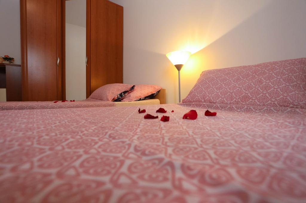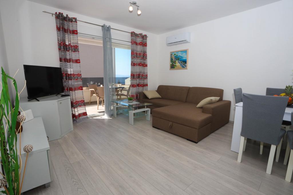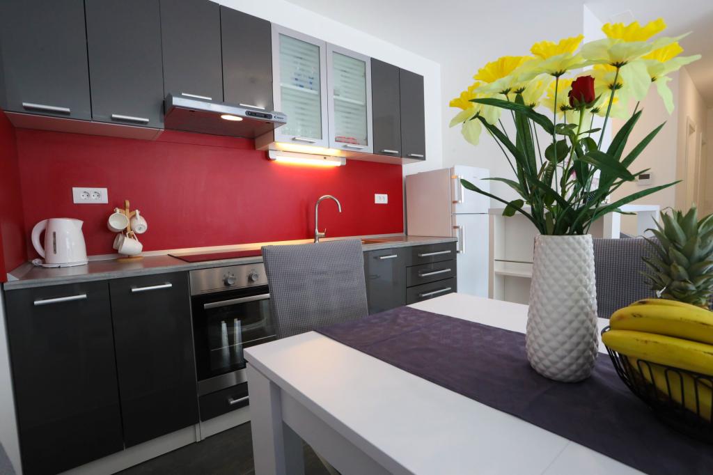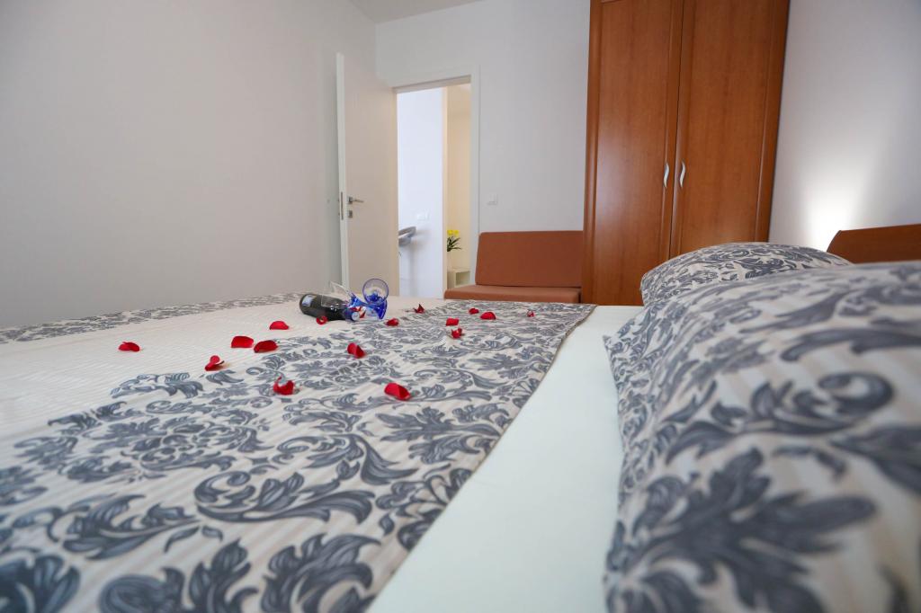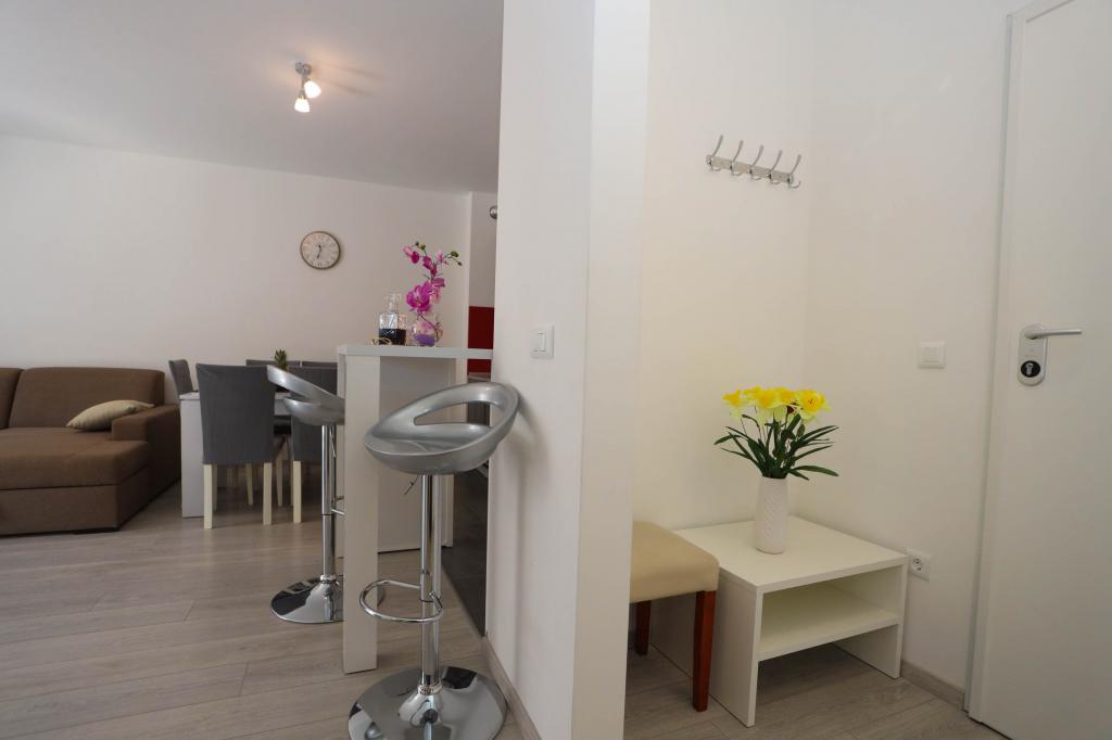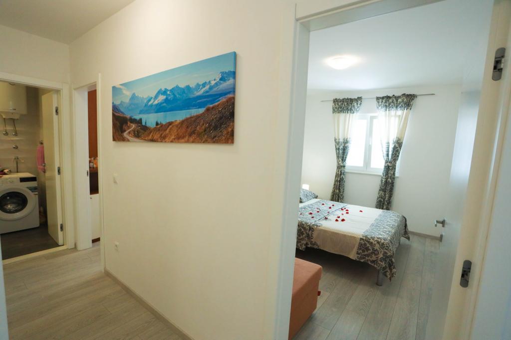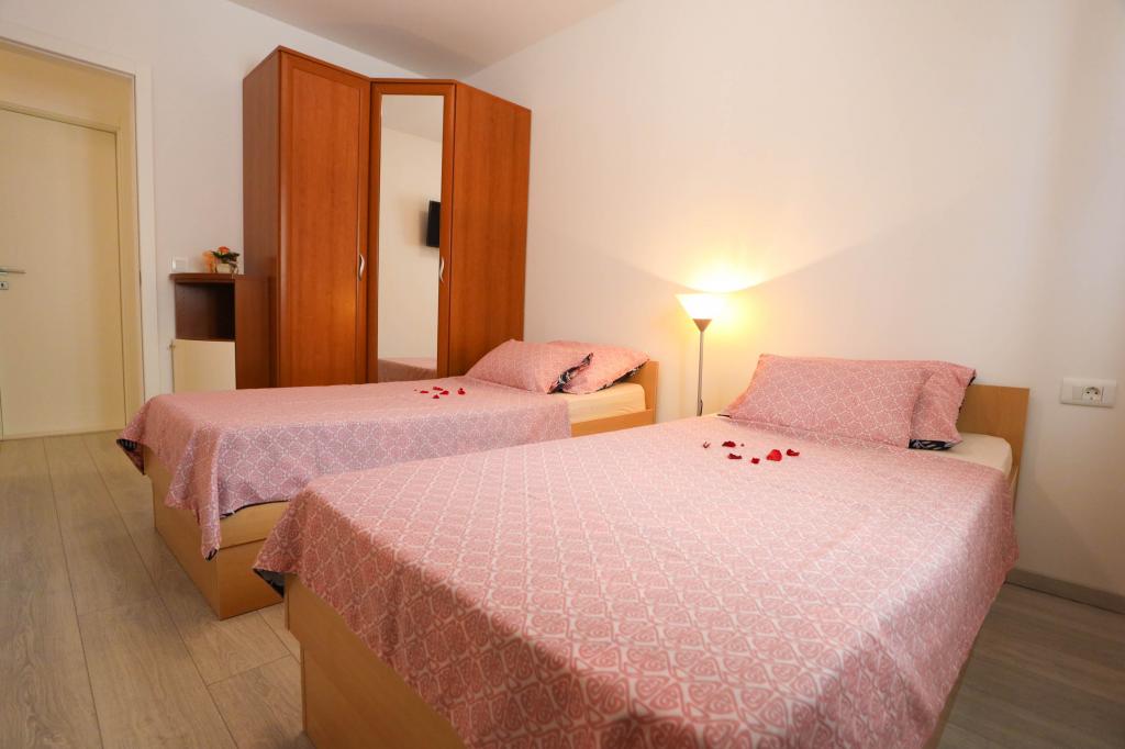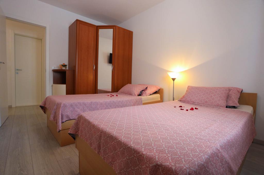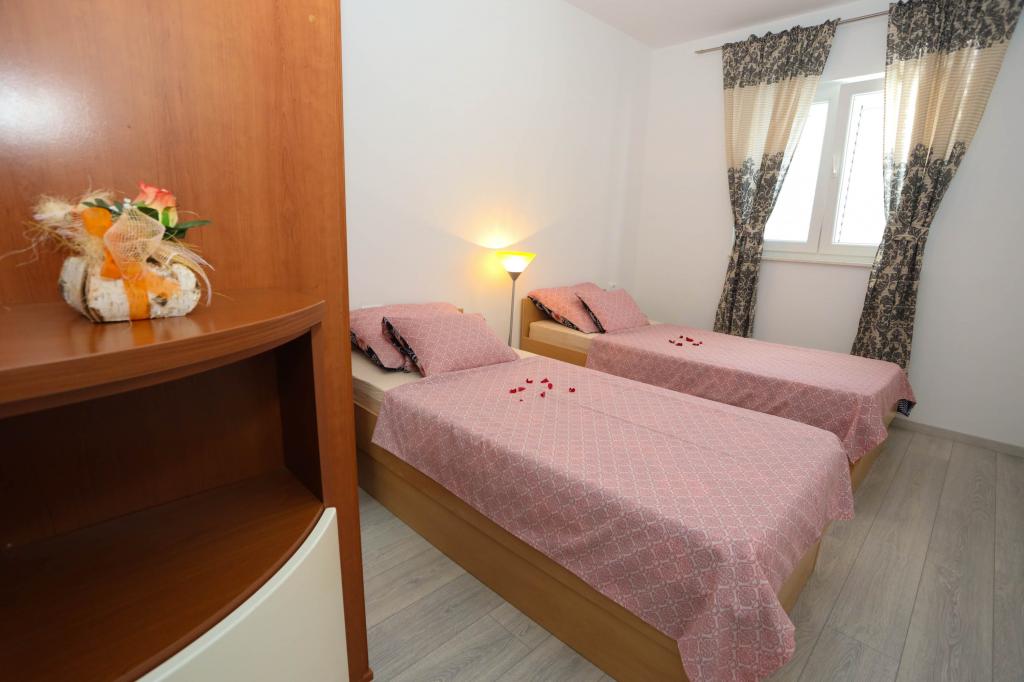 Appartement moderne et équipé situé au premier étage d'un immeuble résidentiel neuf avec ascenseur. Il offre tout le nécessaire pour un séjour agréable. L'appartement Petra comprend une salle à manger avec cuisine équipée, un salon avec un canapé-lit d'appoint, une salle de bains et des toilettes séparées, ainsi que deux chambres. L'une dispose d'un lit double et l'autre de deux lits jumeaux pouvant être séparés si nécessaire. La propriété est située à 5 minutes à pied du centre-ville et de la plage la plus proche. Un commerce et un terrain de sport sont à proximité.