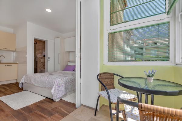 À une minute à pied de la plage ! Le premier appartement, le « 4+2 » (ID : 58865), peut accueillir 4 personnes avec un lit d'appoint pour deux personnes supplémentaires. D'une superficie totale de 85 m², il comprend deux chambres, un grand séjour avec cuisine ouverte, deux salles de bains et un WC séparé. L'appartement dispose d'un balcon privatif avec vue sur la mer. Le deuxième appartement, situé au même étage, est le studio « Up! » (ID : 58866) pour deux personnes et possède une terrasse privative pour deux. Le troisième appartement, le « 3+2 » (ID : 63762), d'une superficie de 65 m², offre un hébergement au rez-de-chaussée pour un maximum de 5 personnes. Enfin, le quatrième, le studio « Olive Tree » (ID : 65589), pour deux personnes, se trouve également au rez-de-chaussée.