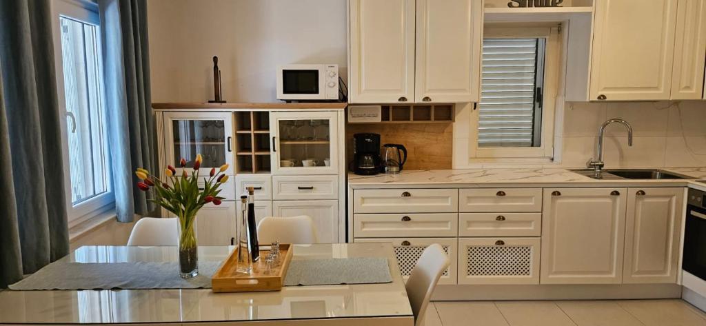 La Villa Branka est une charmante maison composée de cinq logements indépendants, idéale pour des vacances reposantes en pleine nature. Entourée de verdure et bénéficiant d'un emplacement exceptionnel, elle offre une vue imprenable sur la mer Adriatique d'un côté et sur le majestueux massif du Biokovo de l'autre. Située dans un quartier exceptionnellement calme de la Riviera de Makarska, sur une douce colline, à l'écart de l'agitation touristique et du bruit, elle est parfaite pour une détente absolue et une intimité totale. La villa se trouve à seulement 2 minutes en voiture de la plage et à 5 minutes du centre de Makarska, une ville touristique pittoresque proposant de nombreux services, restaurants et de superbes plages. L'alliance parfaite entre calme, nature et proximité des commodités essentielles.