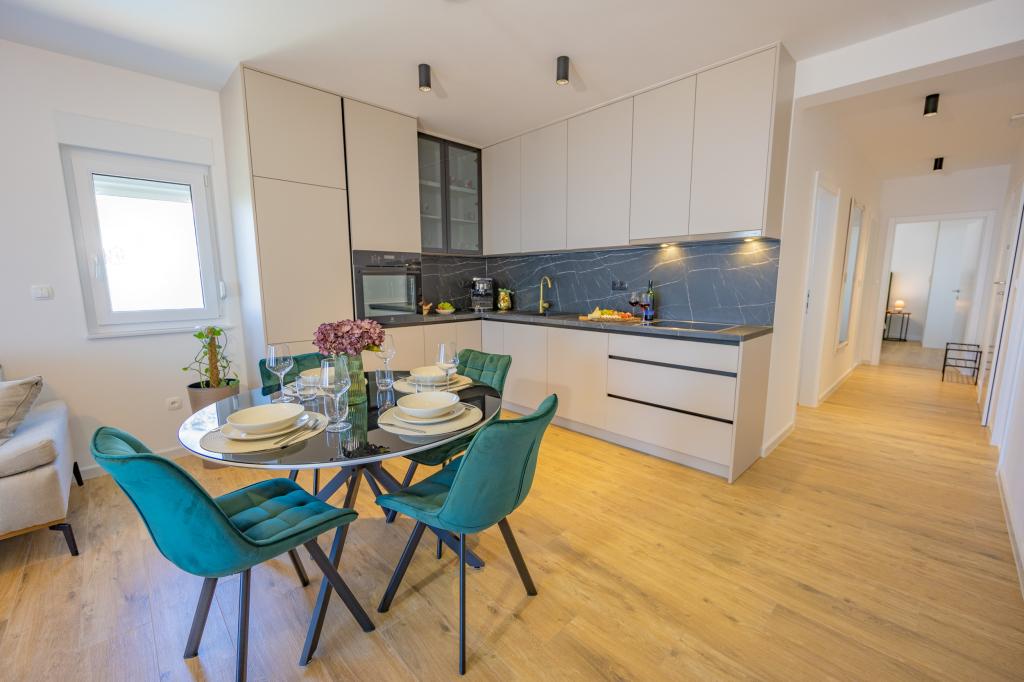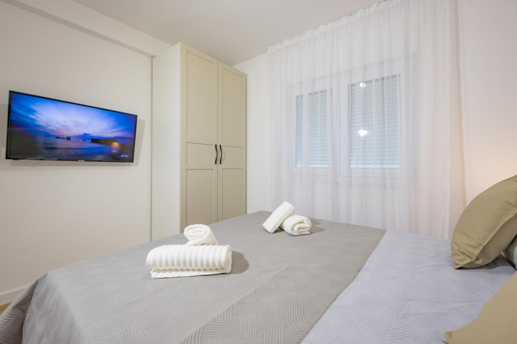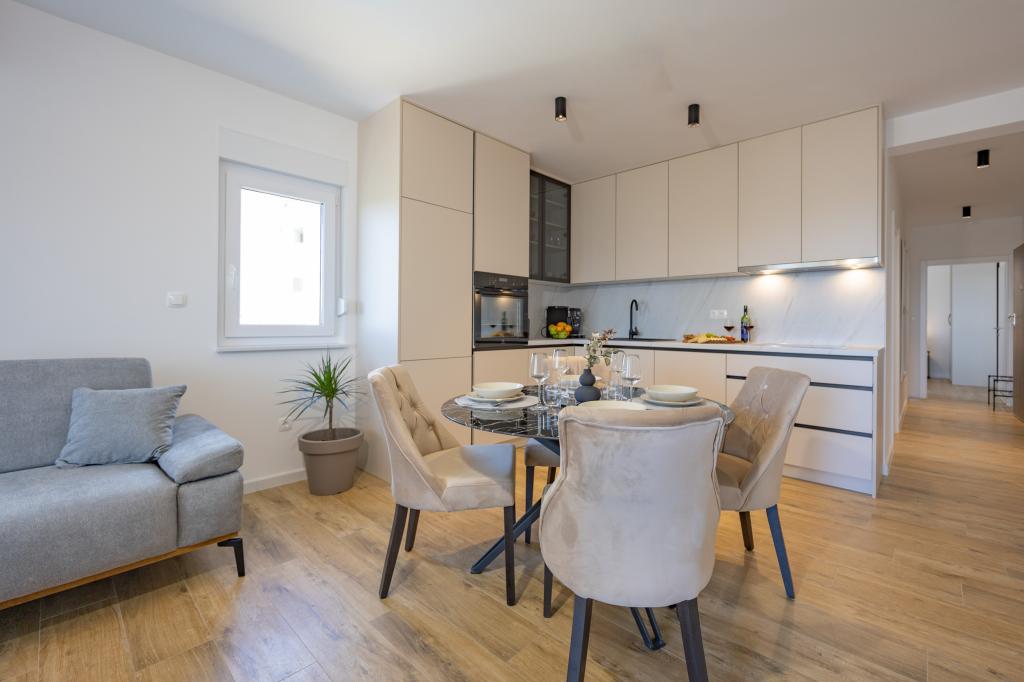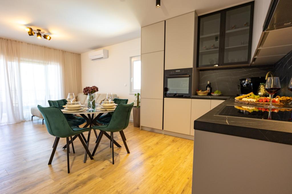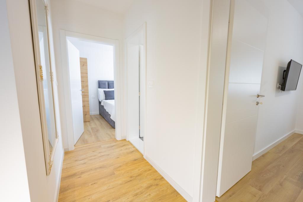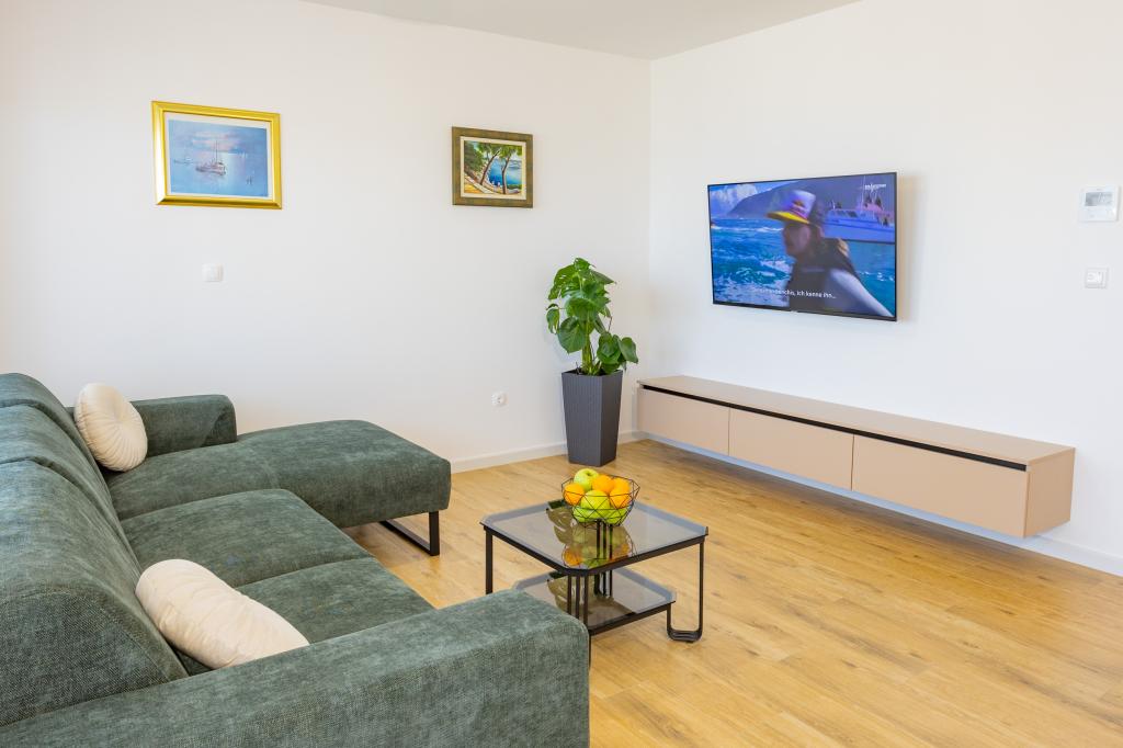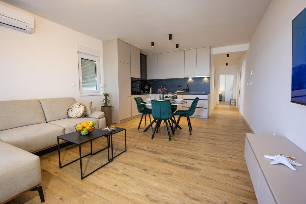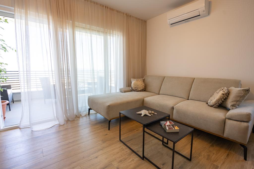Chaque appartement arbore un design moderne et un intérieur récemment rénové. Dans le spacieux séjour, décoré avec goût et agrémenté de détails contemporains, vous vous sentirez comme chez vous. L'espace ouvert relie harmonieusement le séjour à une cuisine entièrement équipée, où vous attendent d'élégants plans de travail, des appareils électroménagers de qualité et tout l'espace nécessaire pour préparer vos plats préférés. Le séjour s'ouvre sur un agréable balcon, lieu idéal pour savourer un café le matin ou se détendre en soirée avec un verre de vin et un coucher de soleil inoubliable sur l'Adriatique. Chaque appartement dispose de deux chambres confortables avec lits doubles, équipées de linge de lit moelleux et de nombreux rangements, d'une salle de bain moderne et de toilettes séparées. Les appartements sont climatisés et entièrement équipés : télévision par satellite, internet, lave-linge, lave-vaisselle, cafetière et tout le nécessaire pour un séjour confortable et sans souci. Le parking gratuit à proximité de la plage est inclus dans le prix de la location !