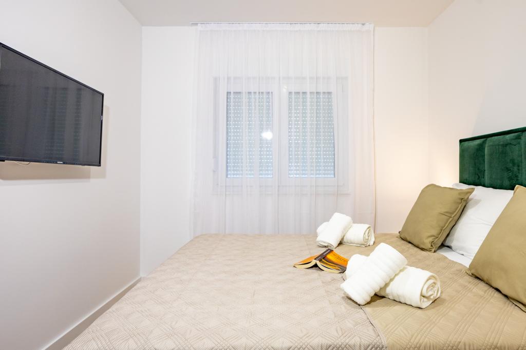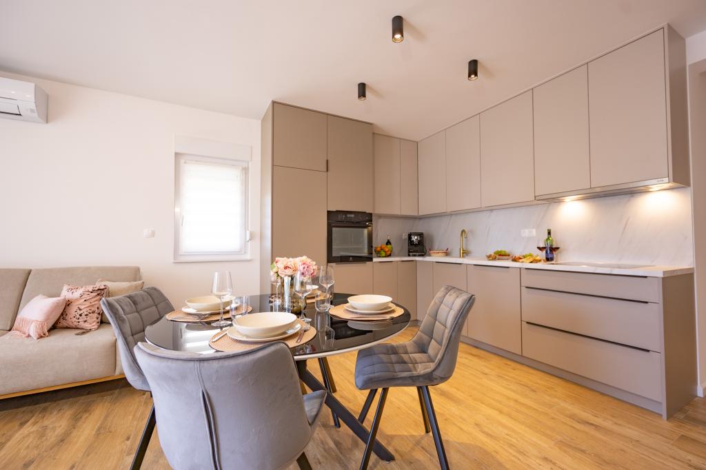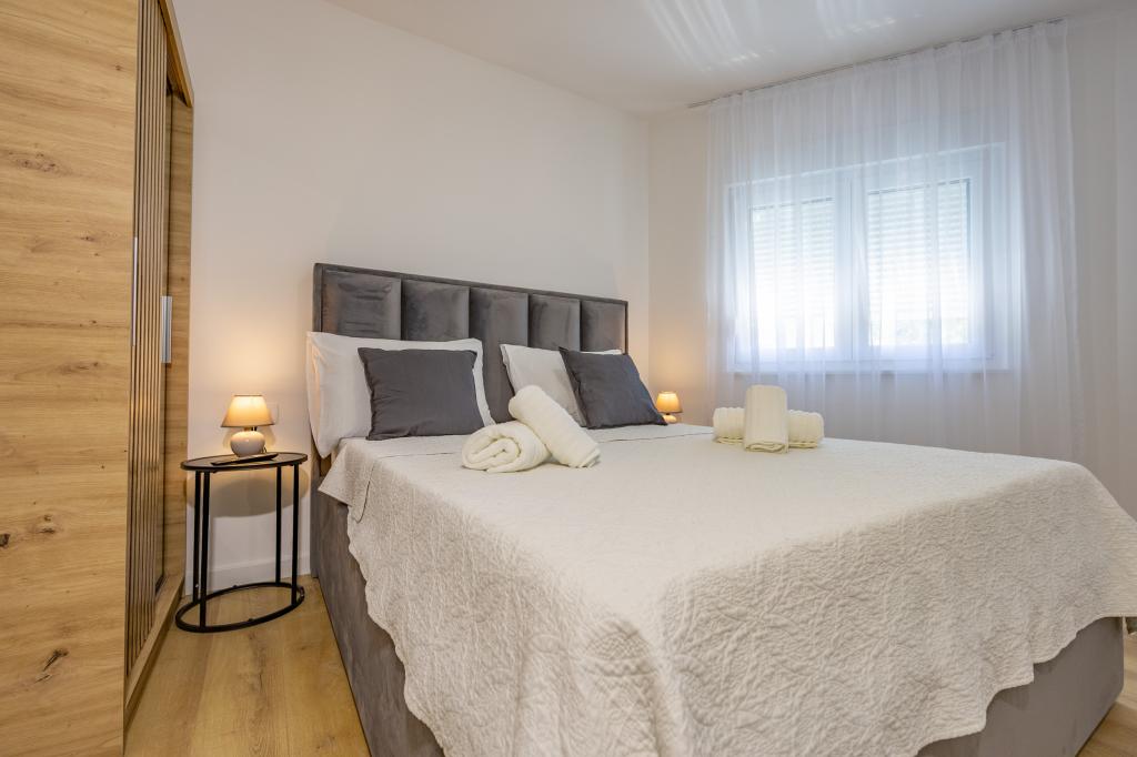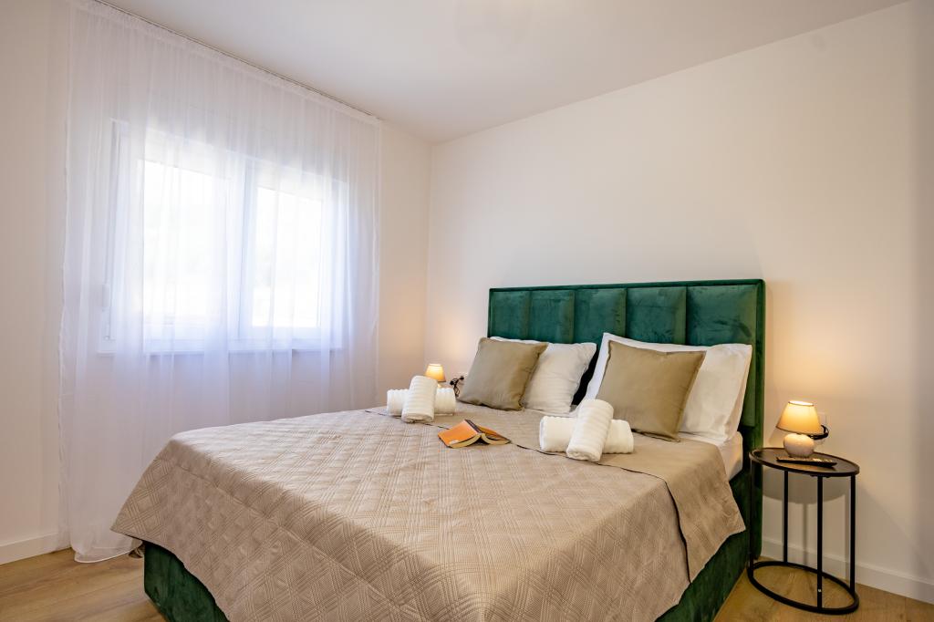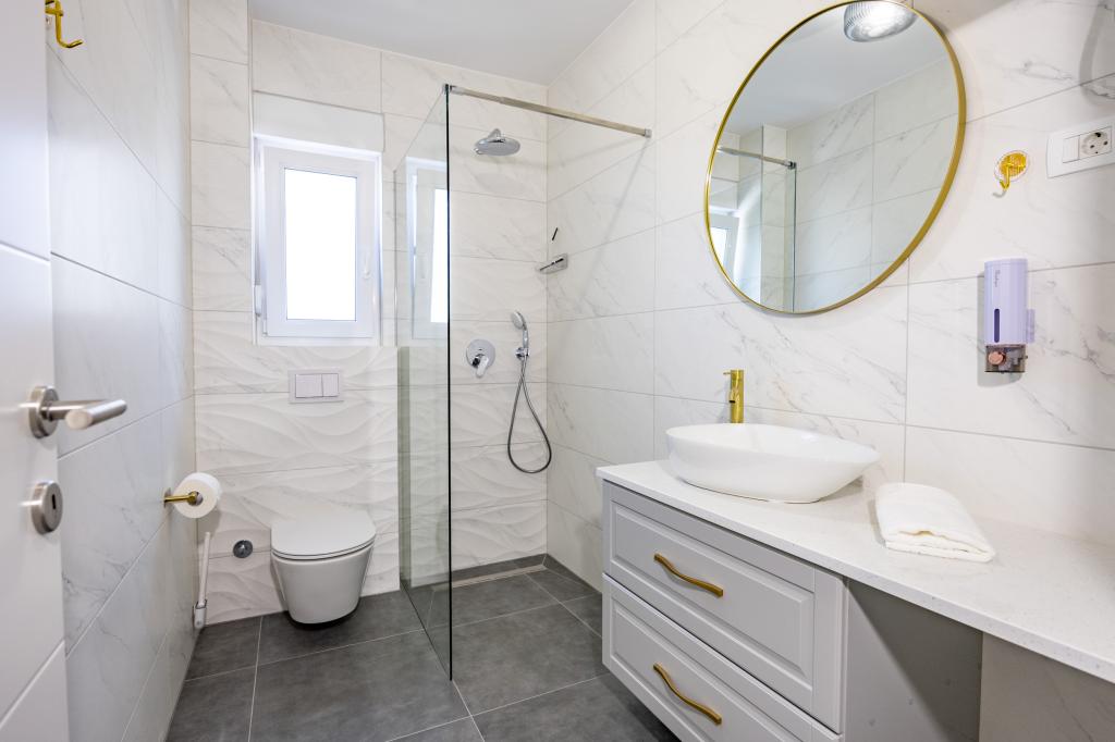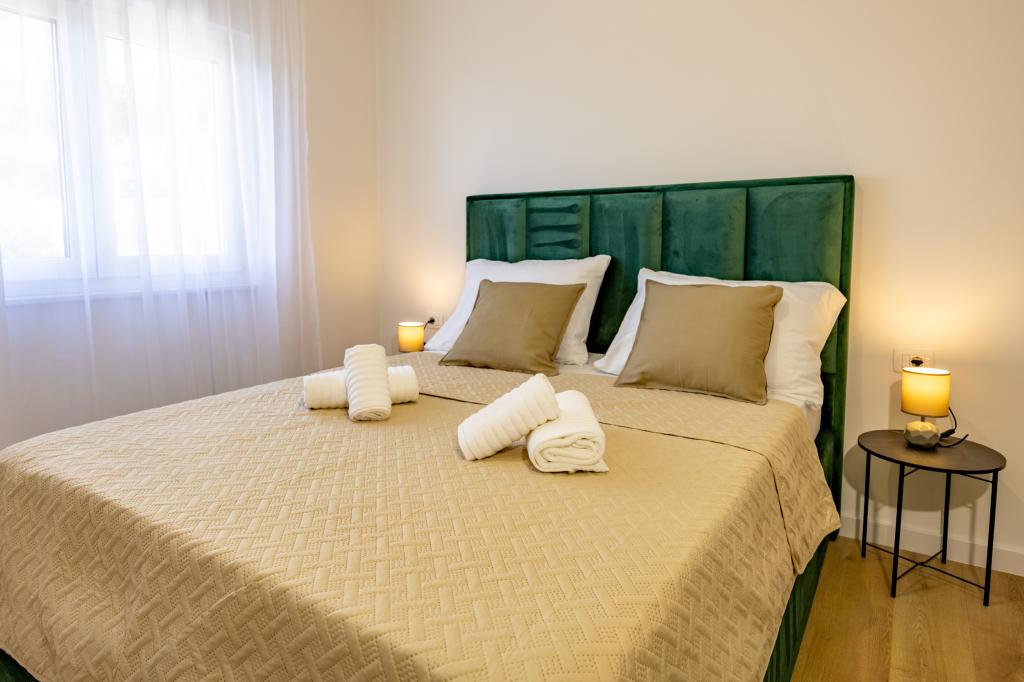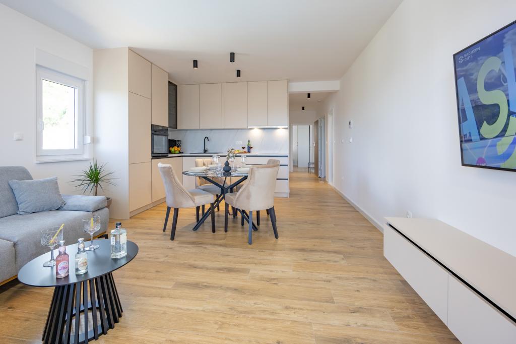 Chaque appartement arbore un design moderne et un intérieur récemment rénové. Dans le spacieux séjour, décoré avec goût et agrémenté de détails contemporains, vous vous sentirez comme chez vous. L'espace ouvert relie harmonieusement le séjour à une cuisine entièrement équipée, où vous attendent d'élégants plans de travail, des appareils électroménagers de qualité et tout l'espace nécessaire pour préparer vos plats préférés. Le séjour s'ouvre sur un agréable balcon, lieu idéal pour savourer un café le matin ou se détendre en soirée avec un verre de vin et un coucher de soleil inoubliable sur l'Adriatique. Chaque appartement dispose de deux chambres confortables avec lits doubles, équipées de linge de lit moelleux et de nombreux rangements, d'une salle de bain moderne et de toilettes séparées. Les appartements sont climatisés et entièrement équipés : télévision par satellite, internet, lave-linge, lave-vaisselle, cafetière et tout le nécessaire pour un séjour confortable et sans souci. Le parking gratuit à proximité de la plage est inclus dans le prix de la location !