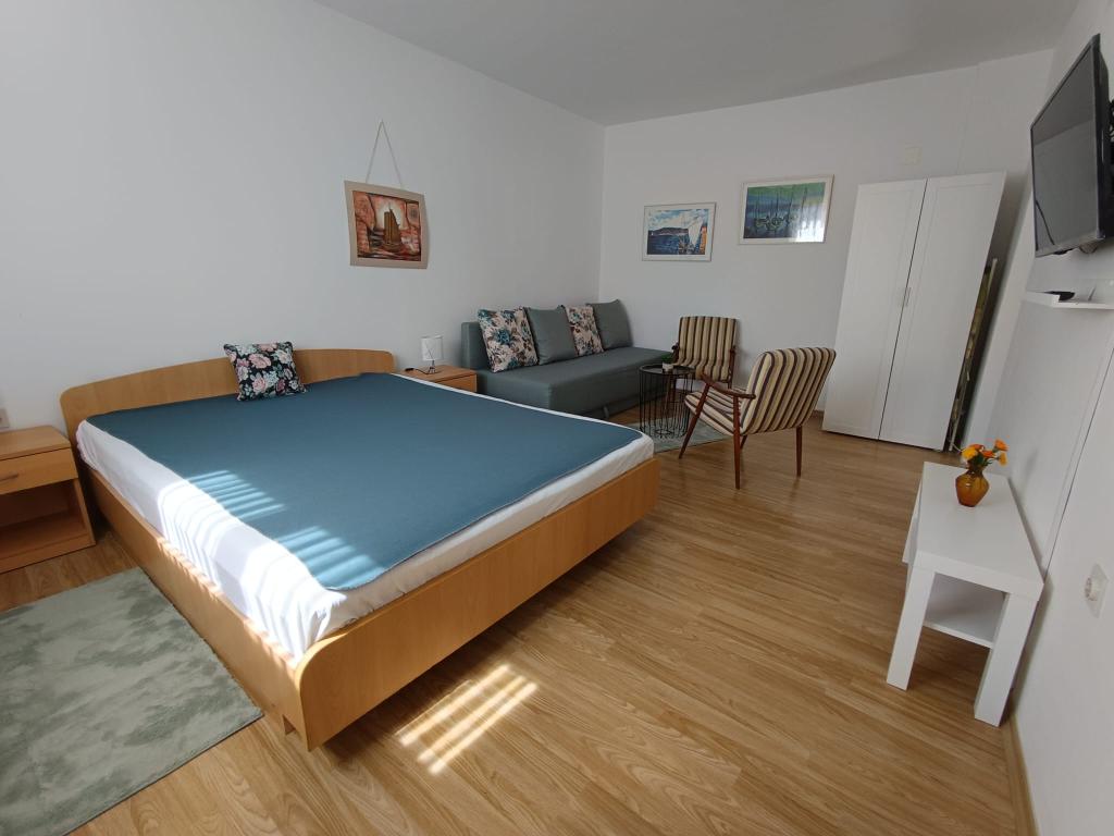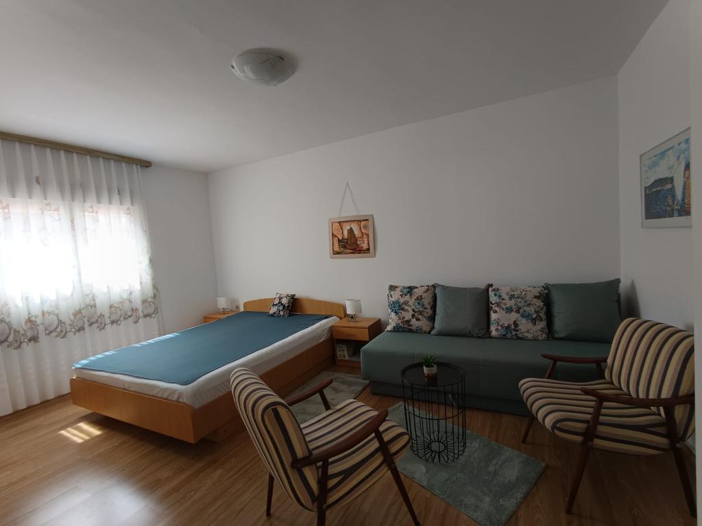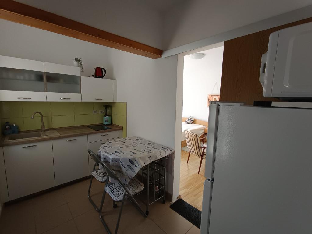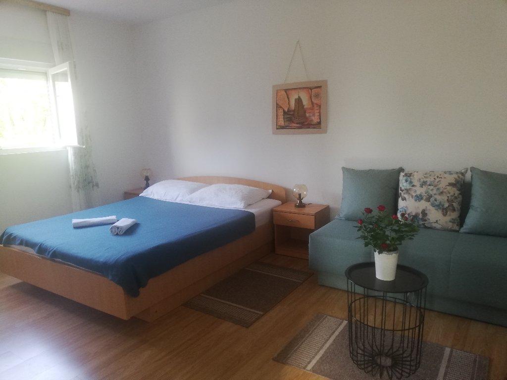 Studio pour 3 personnes maximum, composé d'une chambre avec un lit double et un lit d'appoint, une cuisine, une salle de bain et une terrasse. Le parking pour la voiture est situé dans la cour de la maison. L'appartement est entièrement meublé. Il faut 5-8 minutes à pied pour rejoindre la plage la plus proche, et à proximité il y a des magasins, un marché, un centre, des restaurants, une gare routière... Les plages sont principalement de galets et de béton. Emplacement calme.