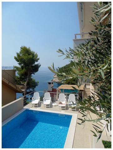 Taxe de sejour est inclus dans le prix.La distance de la mer est d'environ 25 m et de la ville de Milne de 2 km. Appartements avec vue sur la mer. Plage privée et parking privé. Grande terrasse avec barbecue. Piscine avec douche extérieure.