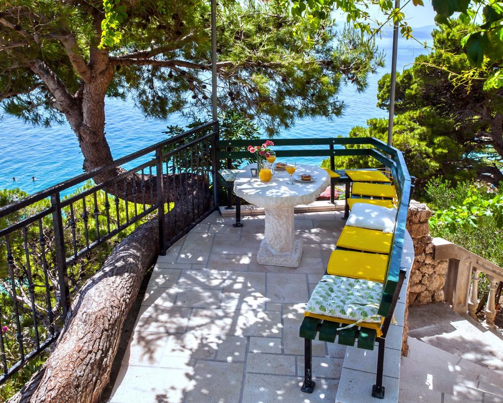 La maison est dans un endroit magnifique près de la mer. Devant la maison est un joli coin salon sur la terrasse. Incroyable petite plage en contrebas de la maison, l'eau est entrée progressive. Parmi les plages sont très belles roches -.
