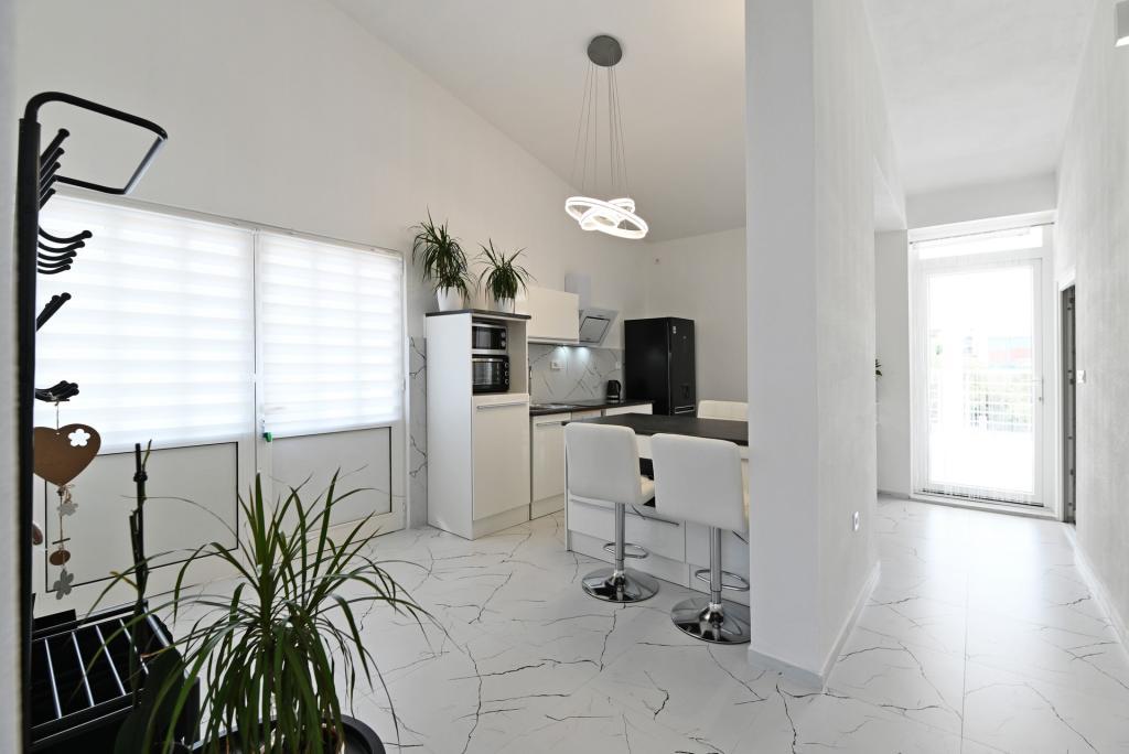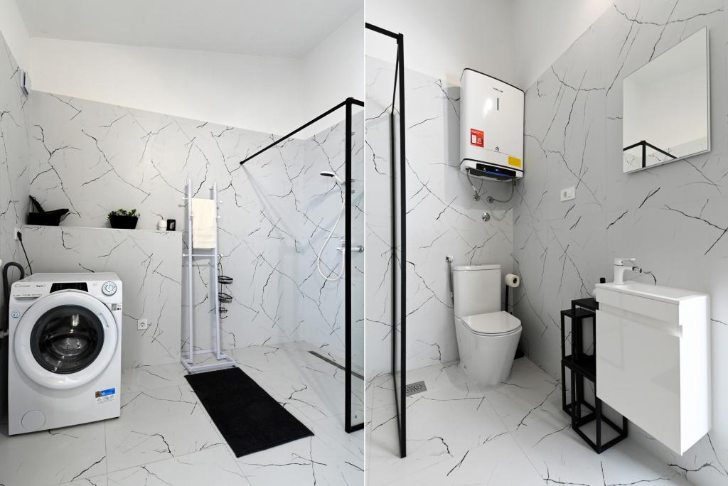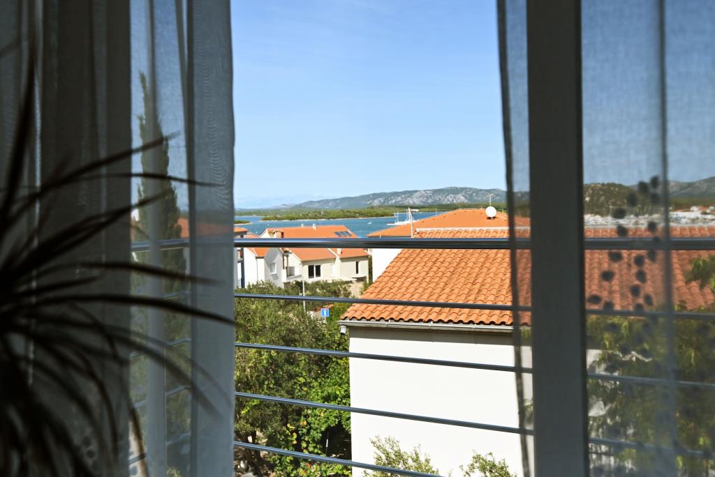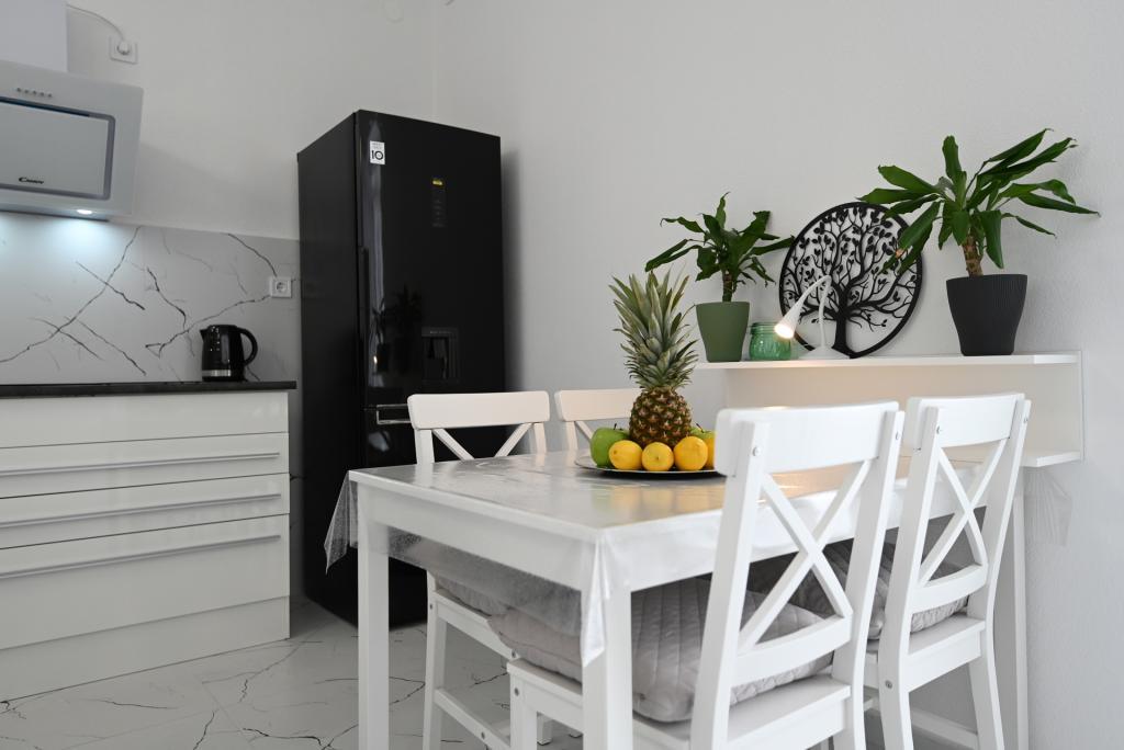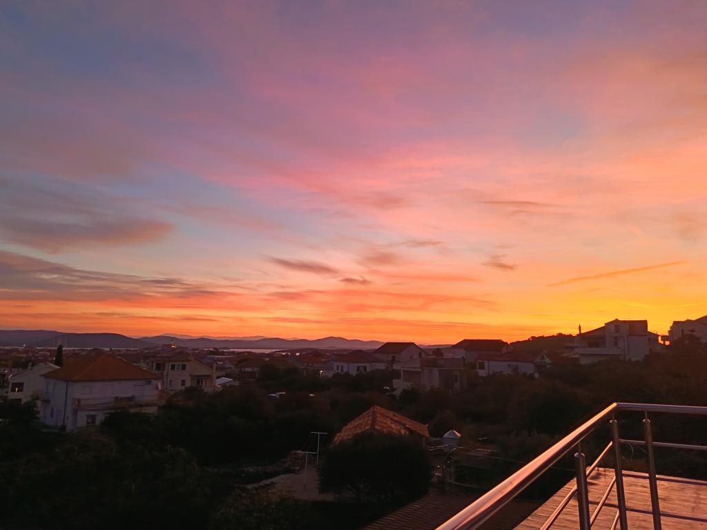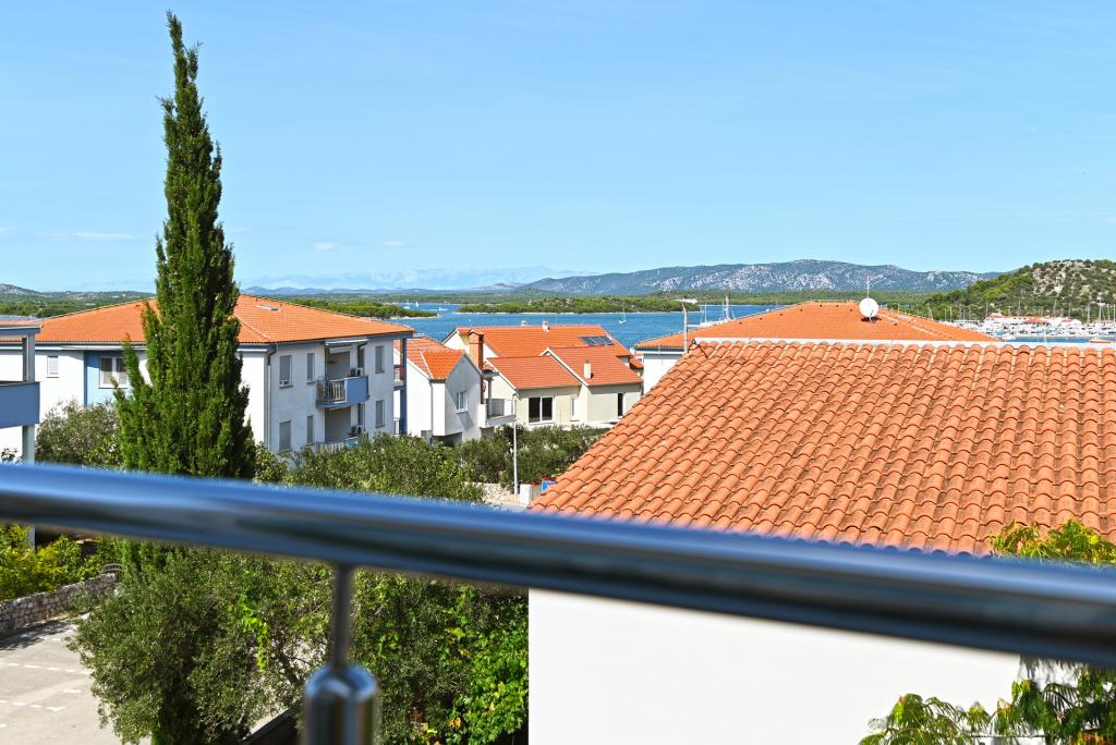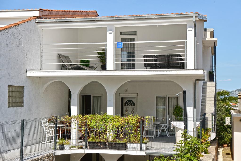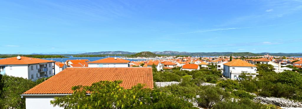 Appartement de 70 m² entièrement rénové et équipé de façon moderne, situé au premier étage d'une maison familiale. L'appartement dispose d'une entrée indépendante et d'une vue sur la mer depuis une petite terrasse attenante au séjour, accessible par une large baie vitrée s'étendant sur presque toute la longueur de celui-ci. Vous pourrez admirer les îles de Murter et la mer, le panorama sur la ville et, au loin, le Velebit, Betina et la mer environnante, tout en savourant votre café du matin dans votre havre de paix, car l'étage entier vous est réservé. La salle à manger donne accès à une grande terrasse de 30 m² où vous pourrez prendre vos repas autour d'une grande table de jardin en verre. Un barbecue électrique portable est à votre disposition pour préparer sur la terrasse, par exemple, des fruits de mer frais du jour, achetés directement au chalutier ou au marché aux poissons du centre de Murter. La salle de bain est spacieuse et équipée d'une douche à l'italienne. L'appartement bénéficie d'une belle hauteur sous plafond. Le parking, situé devant la maison, est gratuit. Le Wi-Fi est également disponible gratuitement.