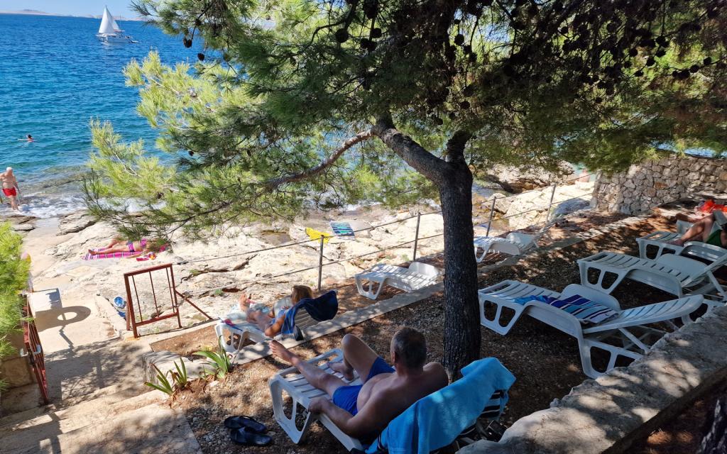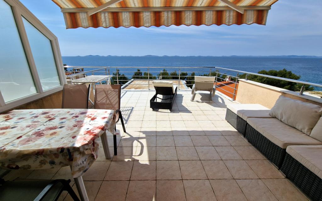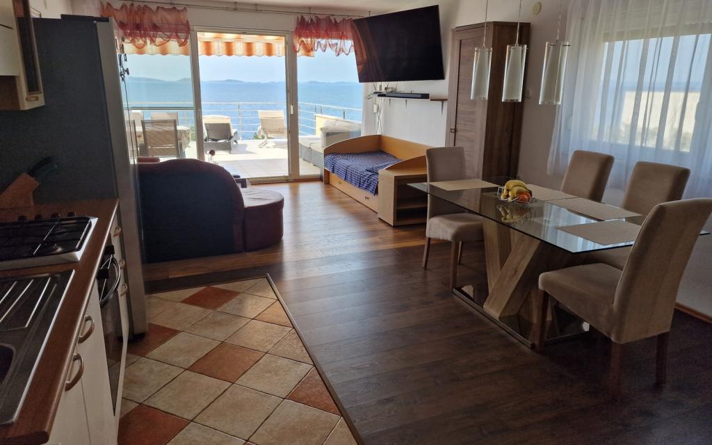 L'appartement G1 est situé au sommet de la maison haute du côté ouest. Il a une superficie de 50 m2 avec 20 m2 supplémentaires de terrasse. Il est destiné à un séjour confortable de 2 à 3 personnes avec une grande terrasse et une vue panoramique sur les Kornati et le large entre Kornati et Murter. L'appartement comprend une chambre et une salle de bain avec WC, et un grand espace commun visuellement complètement ouvert sur la terrasse et la vue panoramique sur la mer. Dans cet espace commun se trouvent une cuisine avec une salle à manger et un salon. L'appartement est équipé d'une climatisation puissante, d'une connexion Internet WiFi, de programmes satellite et d'un service de streaming (netflix). A côté de l'appartement se trouve une place de parking et un espace ombragé à côté de la plage avec transats.