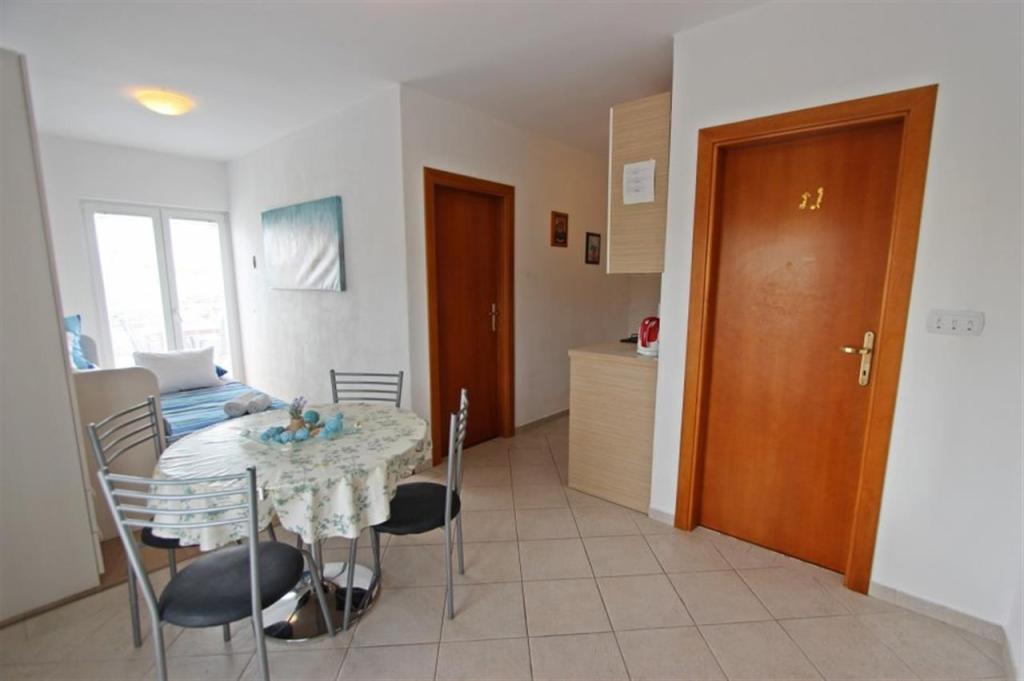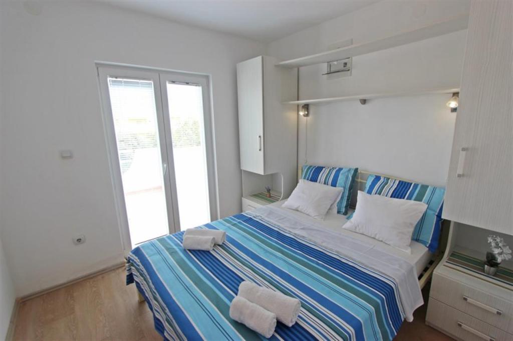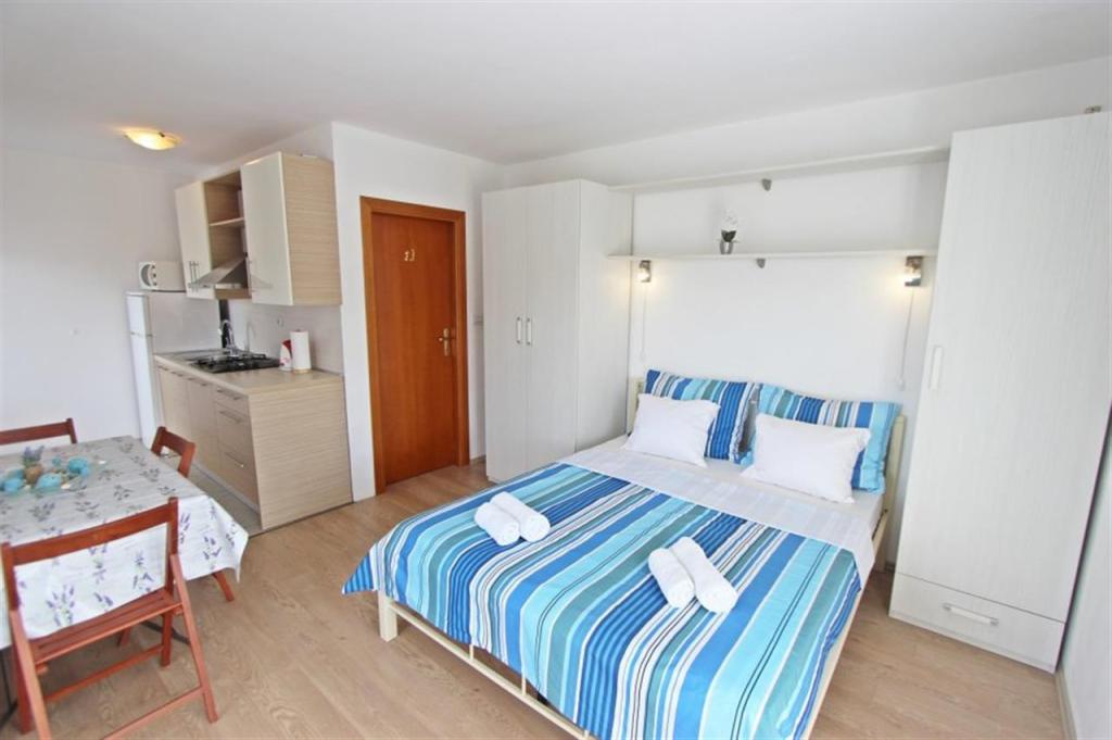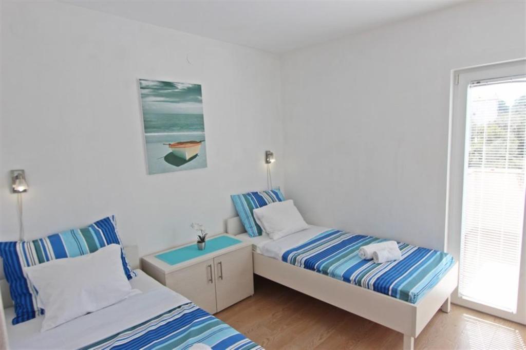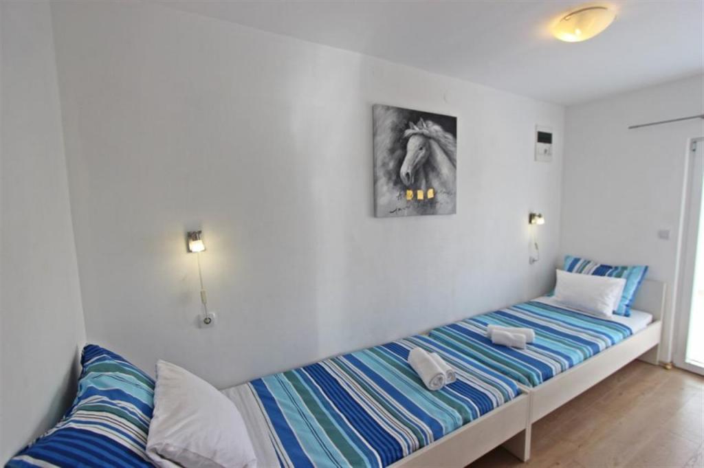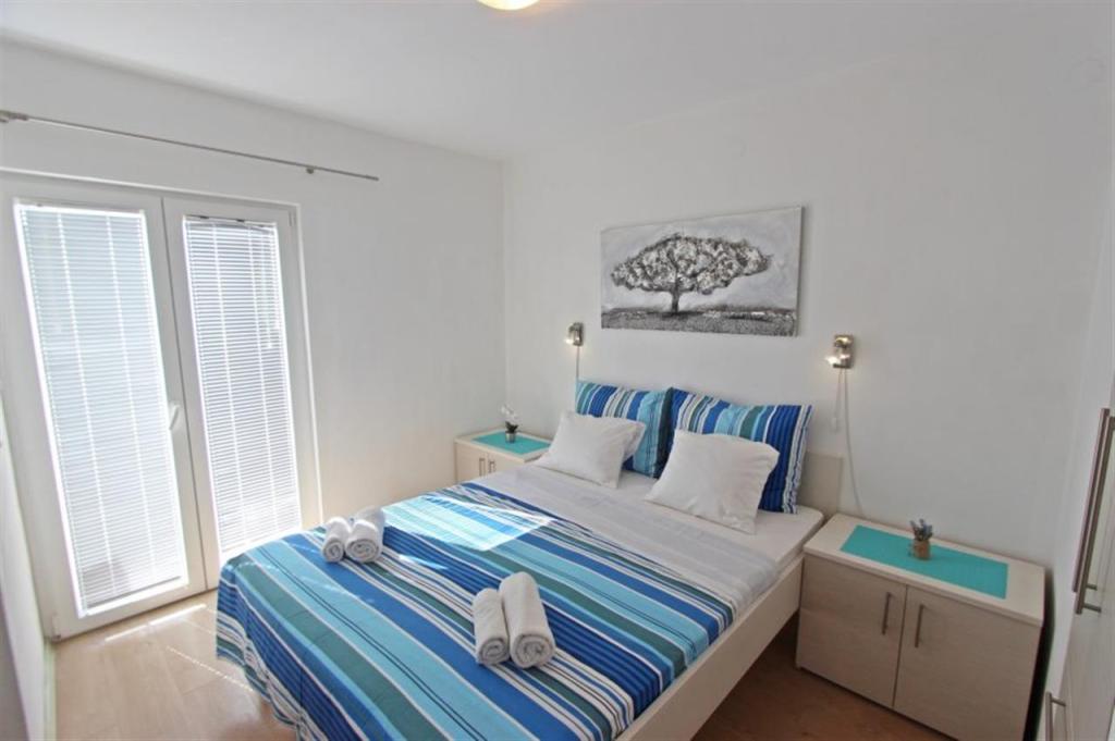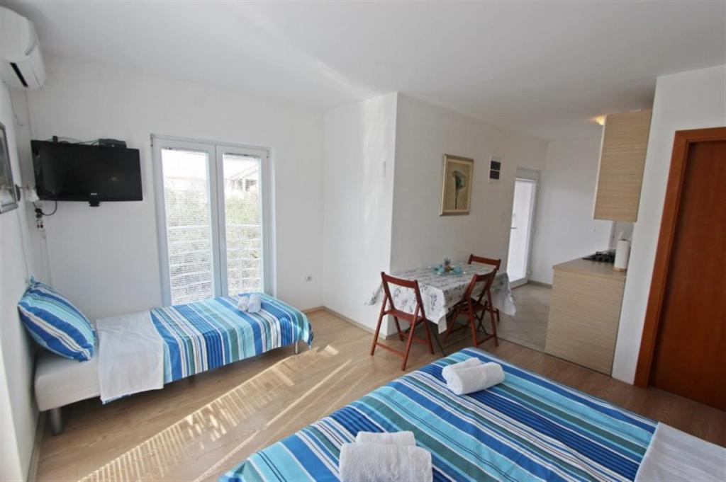 Appartements pour quatre personnes 2 + 2 ou studios 2 + 1. Ils se composent d'une chambre (un lit double) et d'une chambre avec deux lits simples (dimensions 200x90) ou d'une chambre et d'un lit dans le salon, tandis que les studios se composent d'un lit double avec lit supplémentaire, d'une cuisine, d'une salle de bains et d'un grand terrasse (15m2 / 18m2). De plus, au rez-de-chaussée, il y a une pièce avec une machine à laver que les clients peuvent utiliser. Les appartements sont équipés de TV et climatisation, wi-fi, micro-ondes et réfrigérateur avec congélateur. Devant l'appartement, nous avons un barbecue extérieur que les clients peuvent utiliser à tout moment. Un parking est prévu et situé dans la cour. La distance de la première plage et des commerces est à 250 m tandis que le centre est à 1 km
