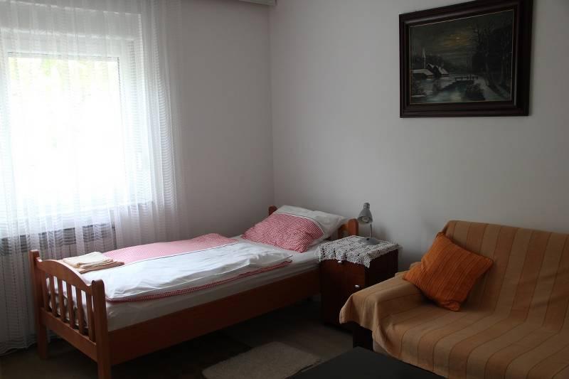 La superficie de 66m2 est située au 1er étage d'une maison familiale, elle dispose de deux chambres avec 2 lits chacune et d'un séjour avec deux lits d'appoint. La salle de bain est équipée d'une baignoire, d'un sèche-cheveux, d'un bidet et d'un lavabo. La cuisine est équipée en standard avec des plats pour préparer et servir des aliments et des boissons, ainsi que des couverts en quantités appropriées, réfrigérateur, congélateur 10 L. Toutes les chambres de l'appartement disposent du chauffage, SatTV dans les deux chambres. Le stationnement est prévu.