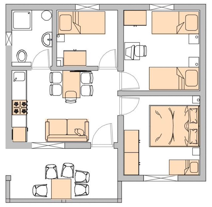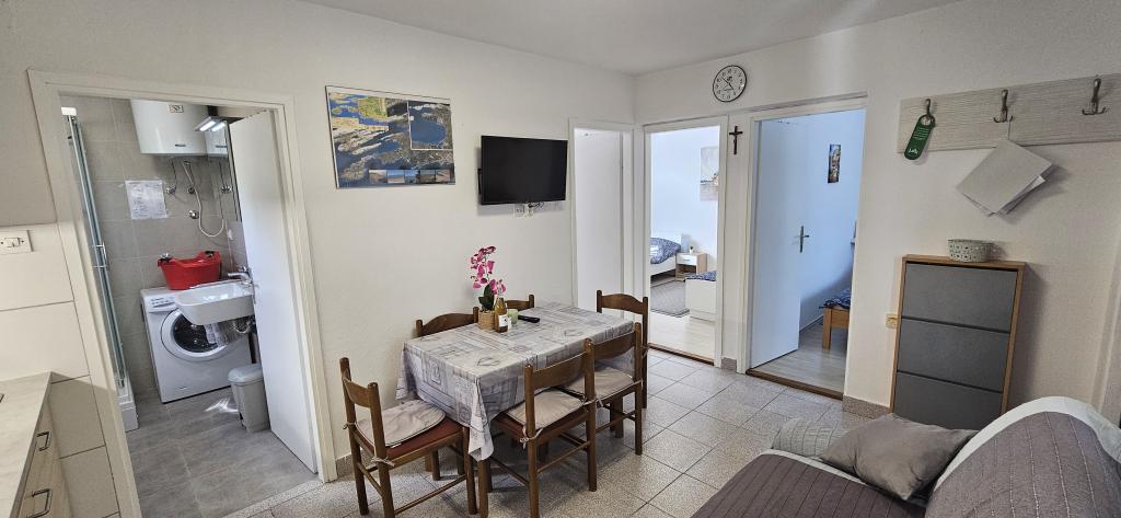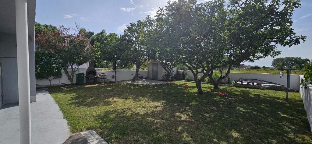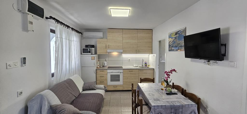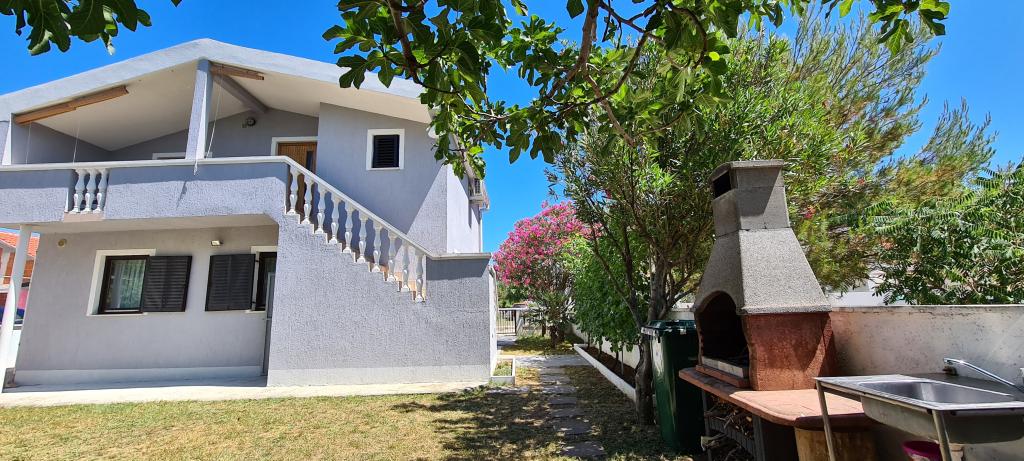 Appartement pour 5 personnes au rez-de-chaussée de la maison du village de Vrsi Zukve avec entrée indépendante et terrasse. L'appartement fait 56 m2 et se compose de : 3 chambres (1ère chambre : grand lit double, armoire à quatre battants, lit bébé ; 2ème chambre : deux lits simples, armoire double, bureau ; 3ème chambre : lit simple, armoire), séjour avec table pour 6 personnes, ensemble canapé et TV LED, nouvelle cuisine avec appareils intégrés (plaque de cuisson, four, lave-vaisselle), réfrigérateur et congélateur combinés, four micro-ondes, bouilloire, grille-pain ; nouvelle salle de bain avec douche et terrasse extérieure couverte avec table et chaises à l'ombre naturelle. La maison est située sur un terrain de 380 m2, dans un quartier calme avec beaucoup de verdure et loin de la circulation. Parking à l'ombre et barbecue dans la cour. Utilisations de la douche extérieure et de la cour. La distance de la plage de sable est de 450 m. Une connexion Wi-Fi est disponible.