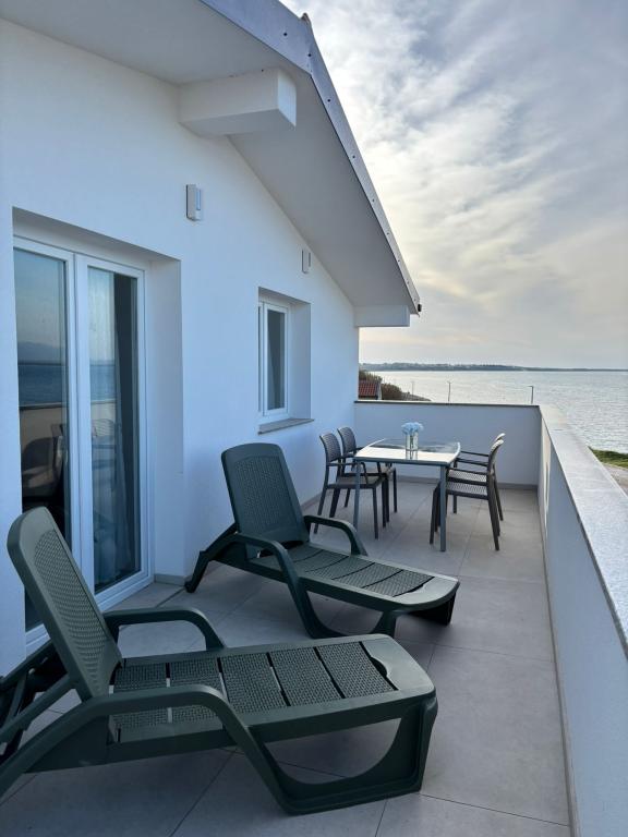 Taxe de sejour est inclus dans le prix.Appartements spacieux et modernes avec vue panoramique sur la lagune de Nin. Hébergement en bord de mer Emplacement directement en bord de mer pour une détente maximale, la baignade et des promenades le long de la côte – sans besoin de voiture. Parking privé et douche extérieure Parking sécurisé sur place et douche extérieure – parfait après une journée à la plage avant de retourner à votre appartement.