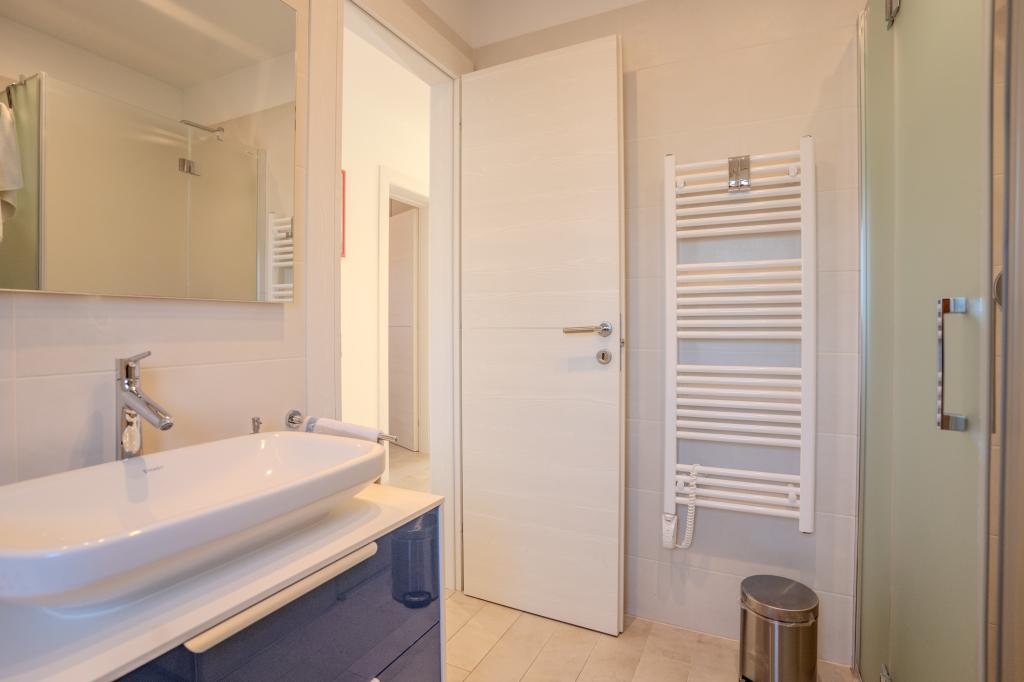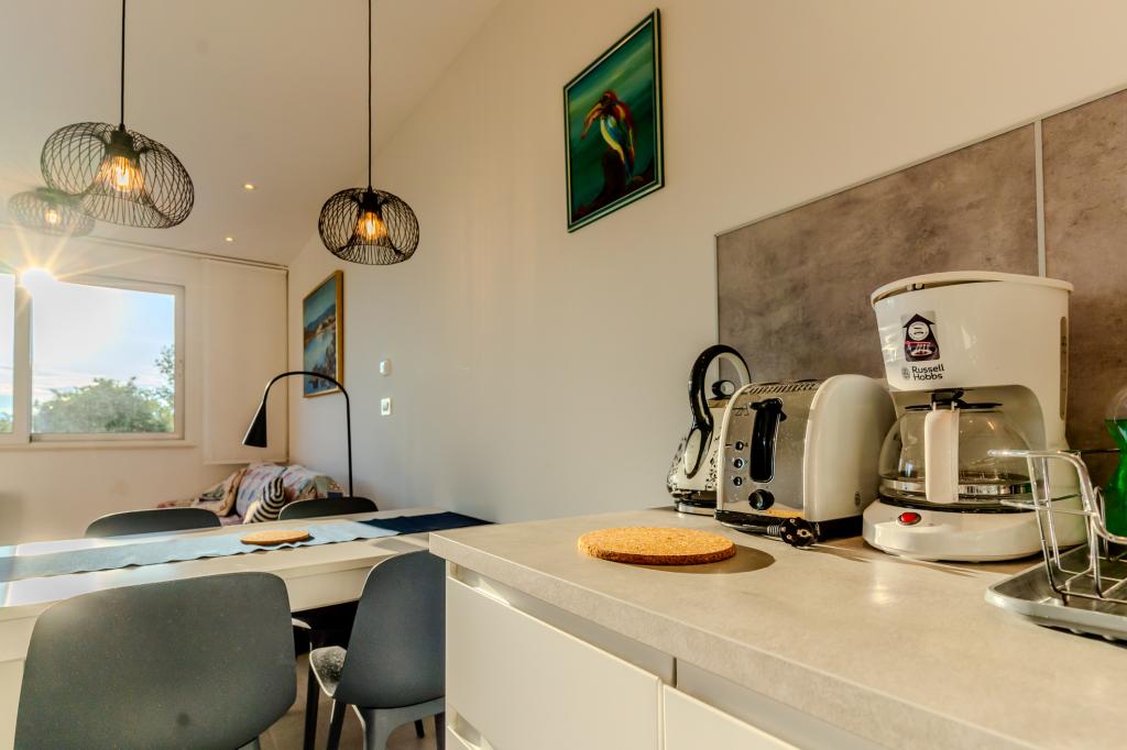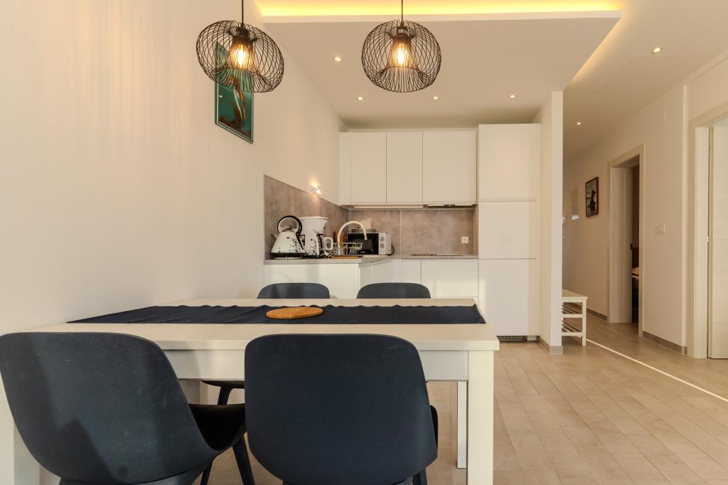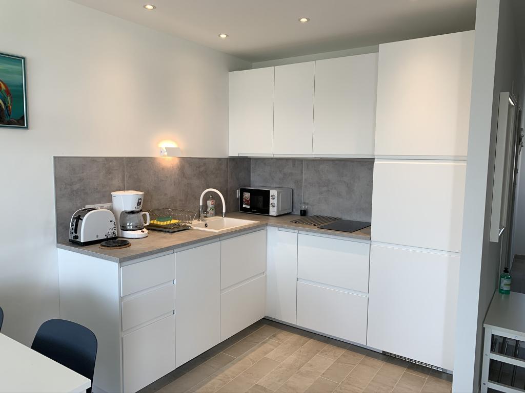 Appartement moderne et entièrement équipé, situé dans un quartier calme, en première ligne de mer. À seulement 2 minutes à pied de la plage, des commerces et du centre-ville, cet appartement neuf est meublé à neuf. Il comprend deux chambres, une salle de bains, un séjour avec cuisine ouverte sur la salle à manger et une terrasse couverte. Sa superficie est de 68 m². Un parking gratuit pour trois voitures est disponible dans la cour de la résidence.