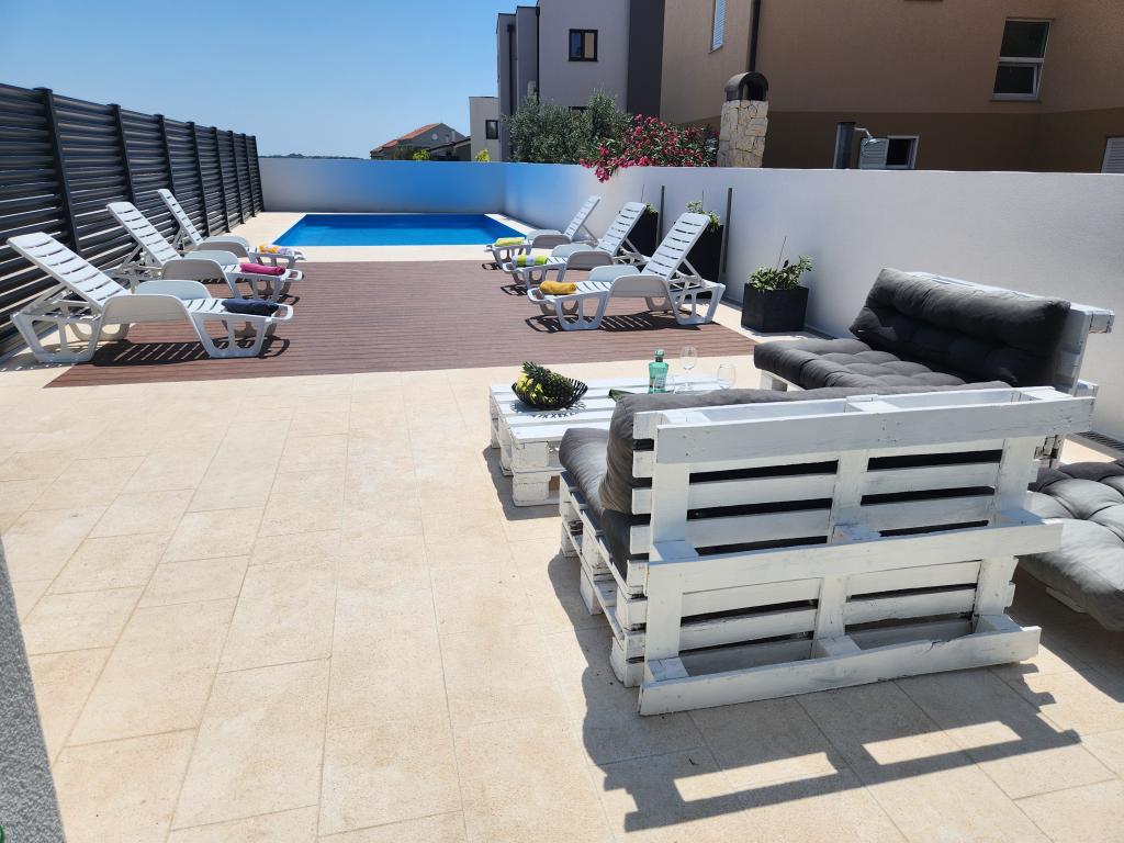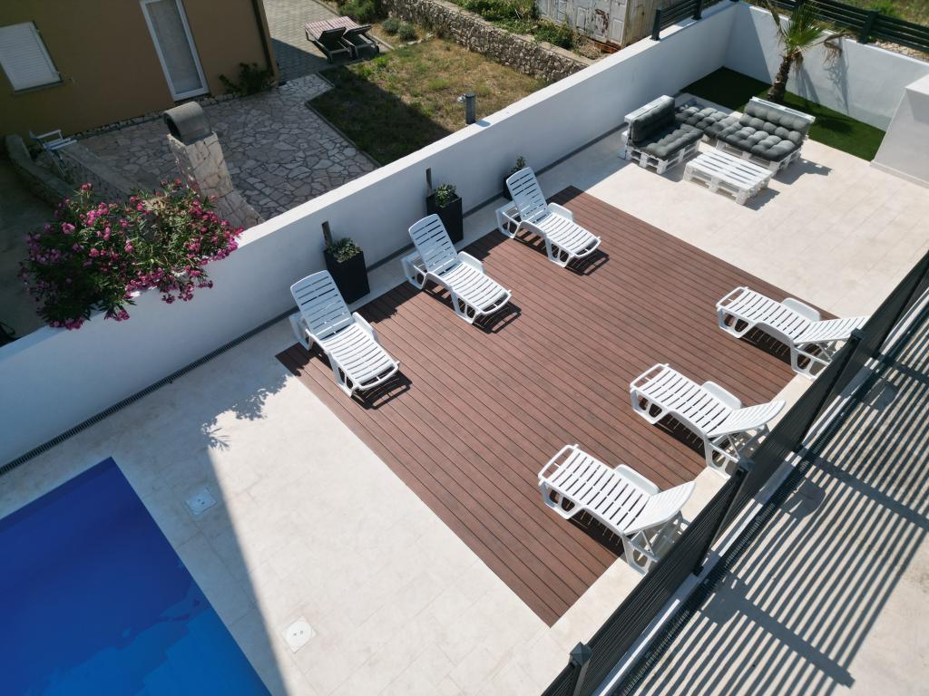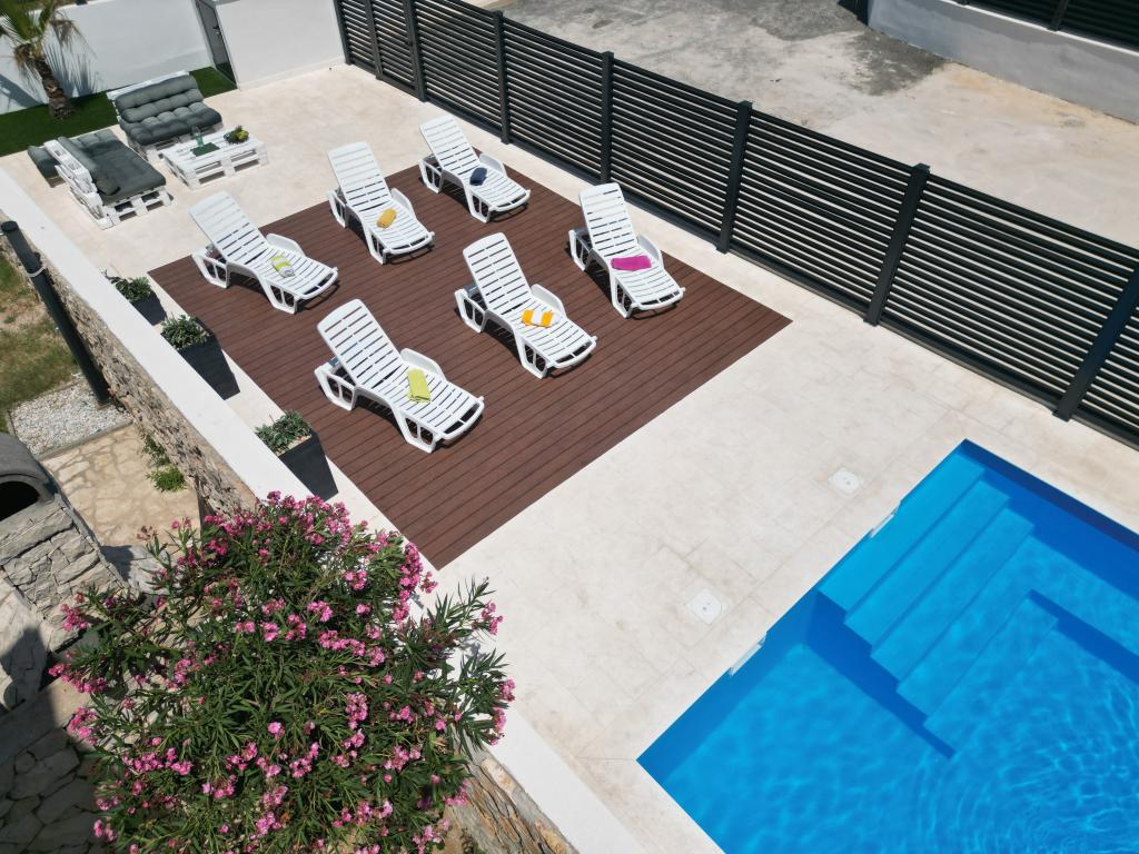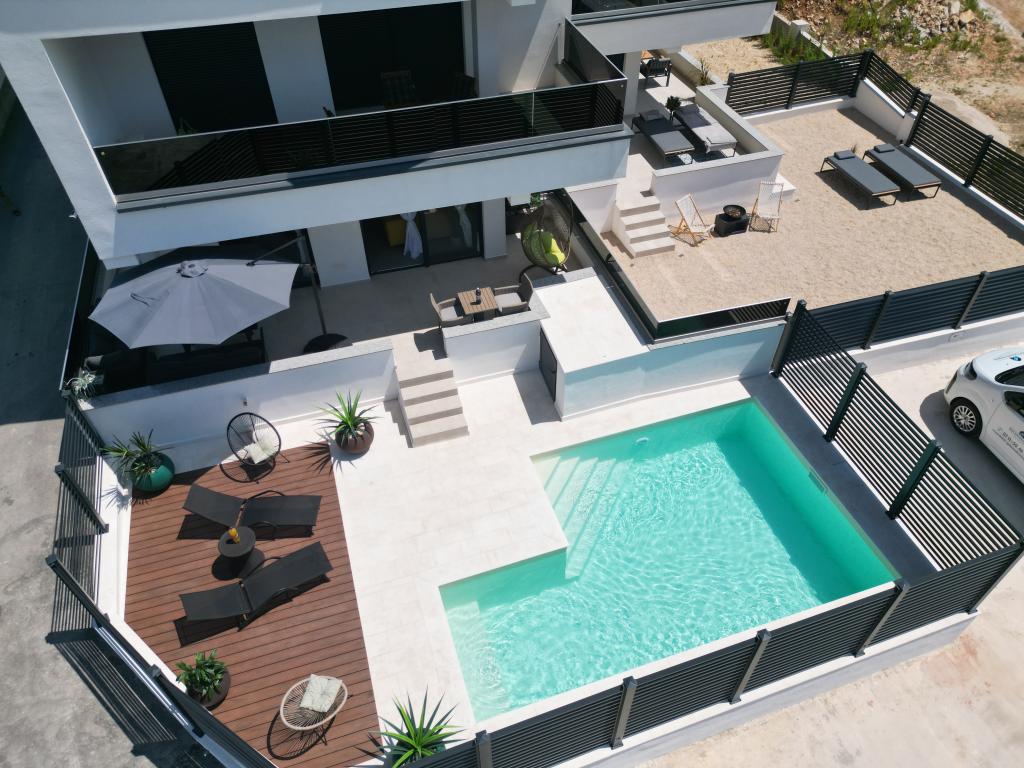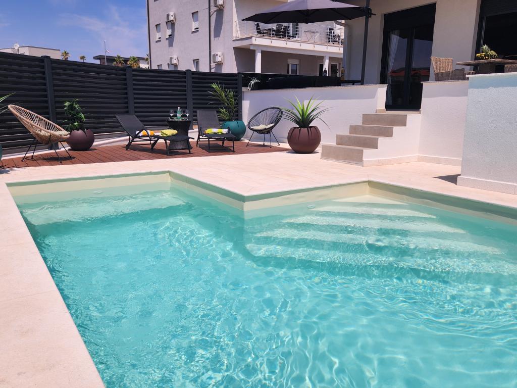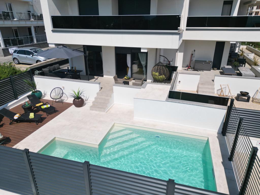 Les appartements Calma sont situés dans un endroit calme à Novalja et chaque appartement dispose de sa propre piscine privée. Ils sont à seulement 900 mètres du centre, vous pourrez donc profiter du silence et être proche de toutes les commodités que cette ville a à offrir. À moins de 10 minutes en voiture du festival - 2,4 km du lieu de l'événement. Il y a une navette à la gare routière qui va directement à la plage de Zrće. Les appartements sont situés dans un nouveau bâtiment moderne (avec 8 appartements). Nous vous proposons 2 appartements, dont l'un A4+2 et l'autre A6+4, chacun de ces appartements possède sa propre piscine privée. Chaque appartement est climatisé et dispose d'une connexion Wi-Fi gratuite, d'une télévision par satellite, d'une cuisine équipée, d'un salon, de chambres et d'une salle de bain. Les appartements pour 6 à 10 personnes - plus une personne supplémentaire si nécessaire - ont également toutes les mêmes conditions. Les appartements disposent de belles terrasses ou balcons donnant sur la mer et la ville, équipés de meubles d'assise.