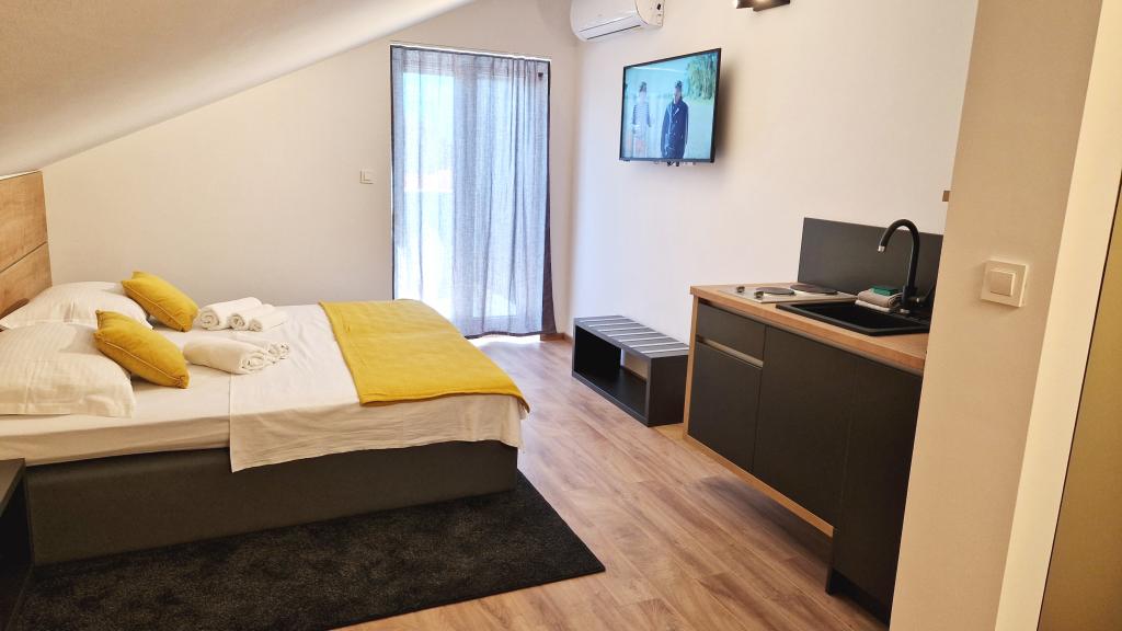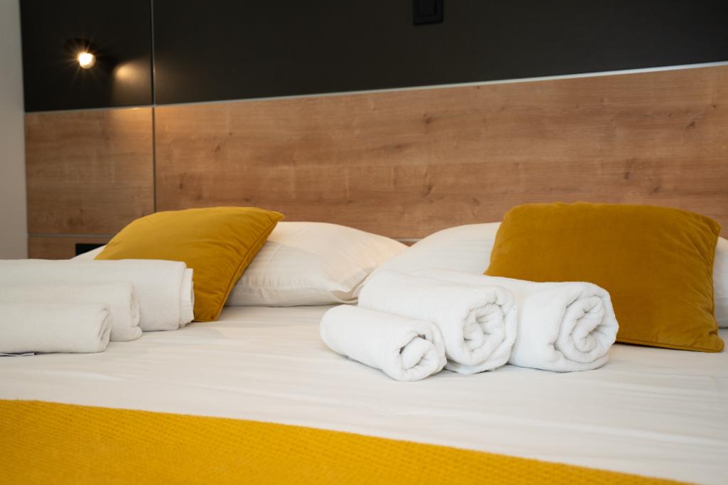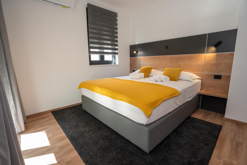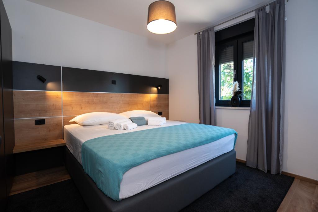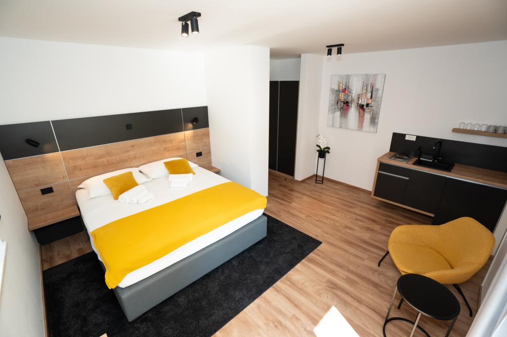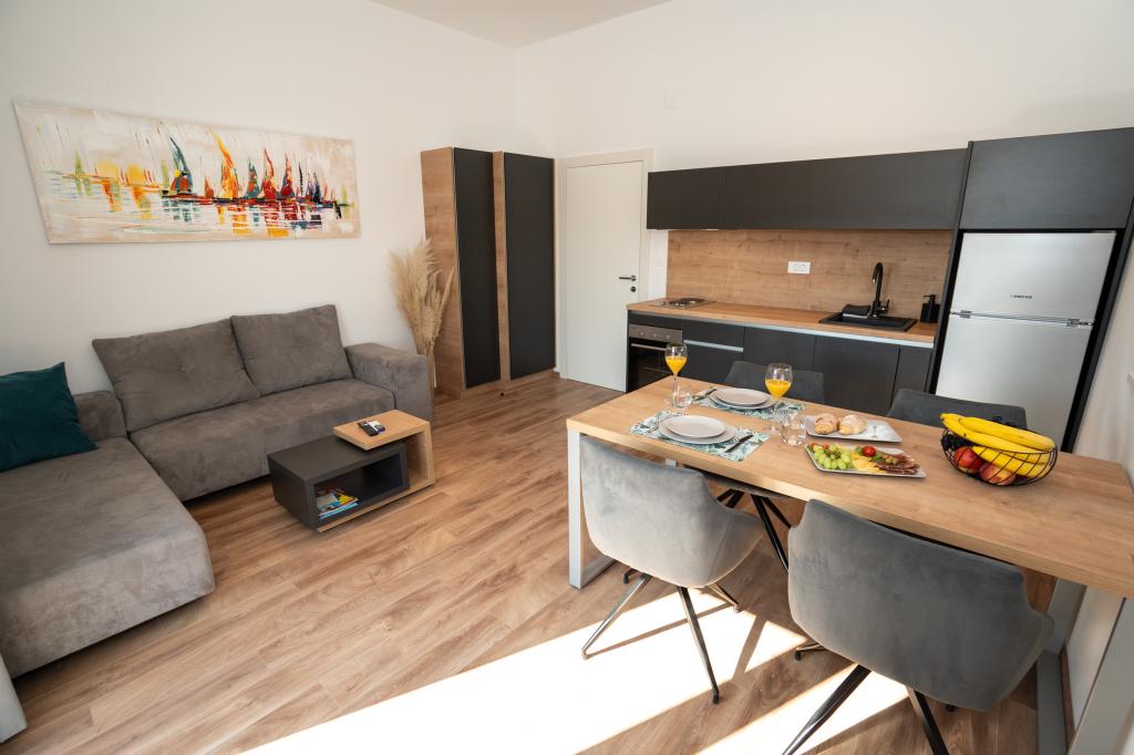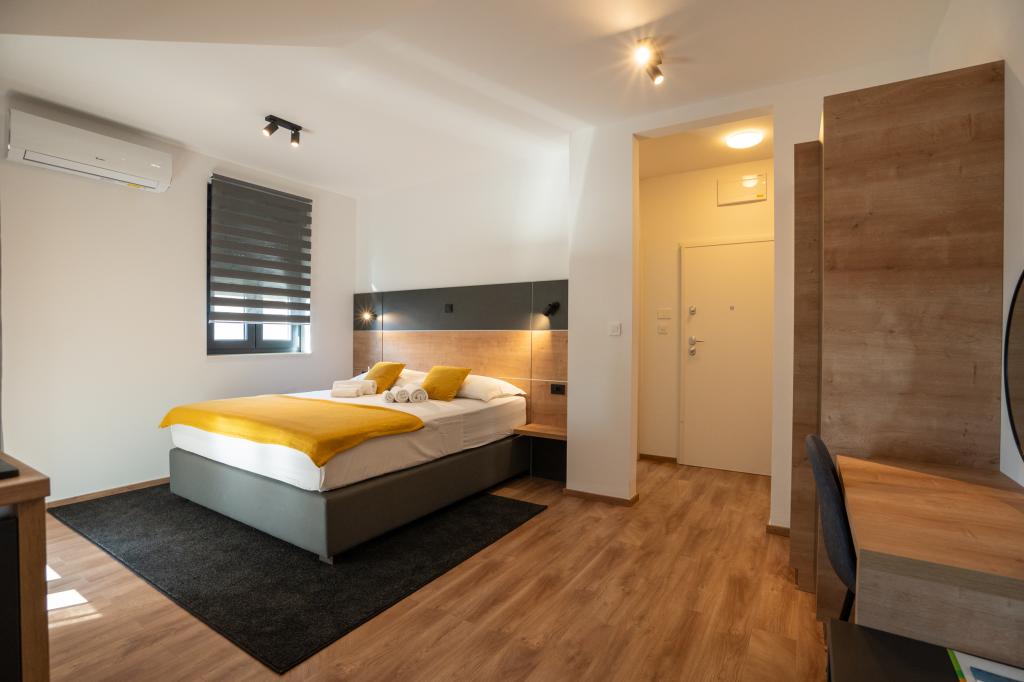 Profitez du confort et de l'élégance de nos chambres modernes et de nos appartements haut de gamme. Tous les hébergements sont classés 4 étoiles et équipés selon les normes hôtelières avec un mobilier soigneusement sélectionné et des équipements de qualité. Idéal pour les voyages d'affaires, les vacances en famille ou la détente estivale : votre séjour parfait à Novalja commence ici ! I 4 étoiles : une garantie de qualité I Équipement et design modernes I Appartements d'une chambre I Deux lits d'appoint dans le salon spacieux I Wi-Fi gratuit I Parking privé Réservez dès maintenant et découvrez un confort ultime ! REMARQUE : Les lits d'appoint dans le salon ne peuvent être utilisés que par des enfants de moins de 12 ans.