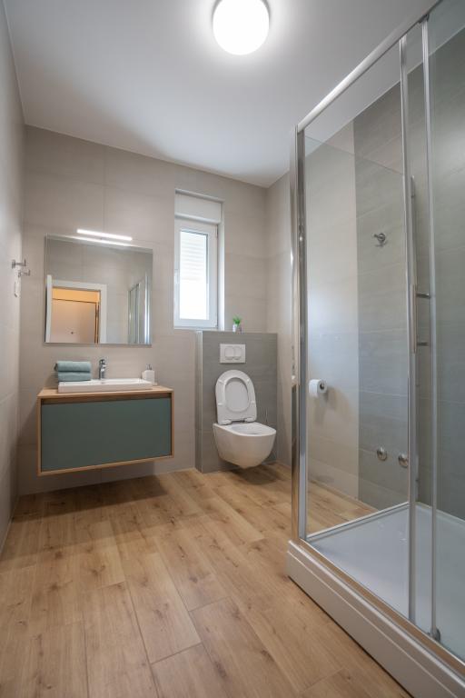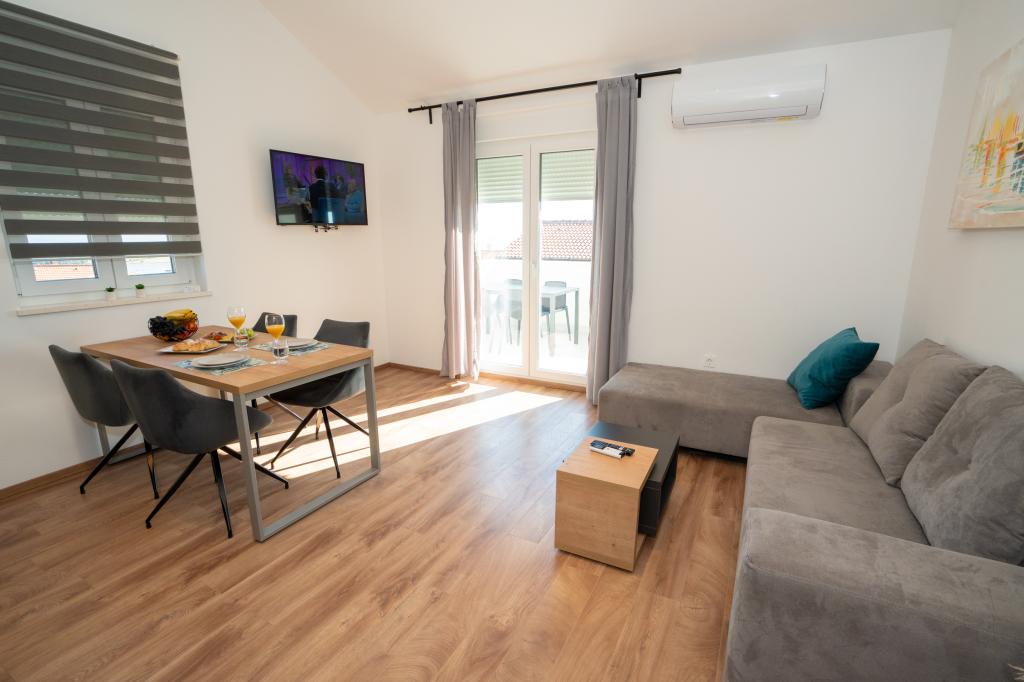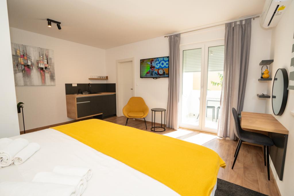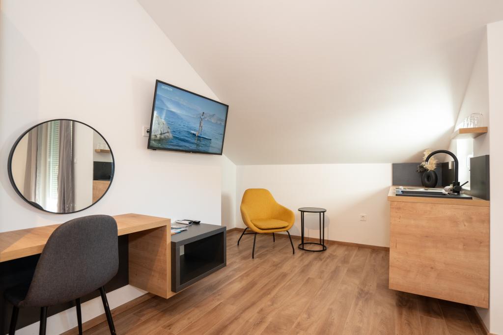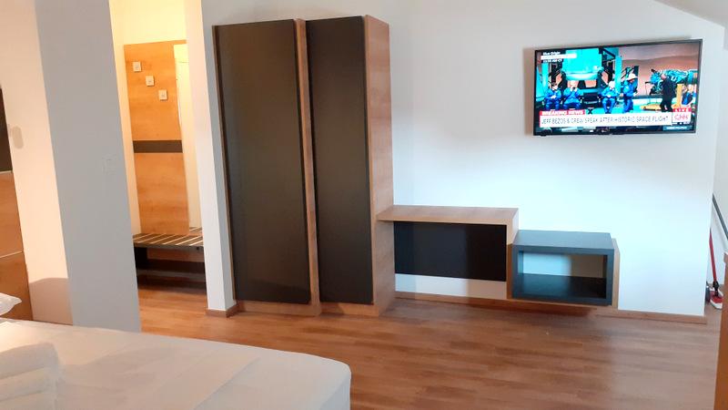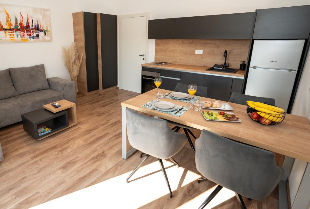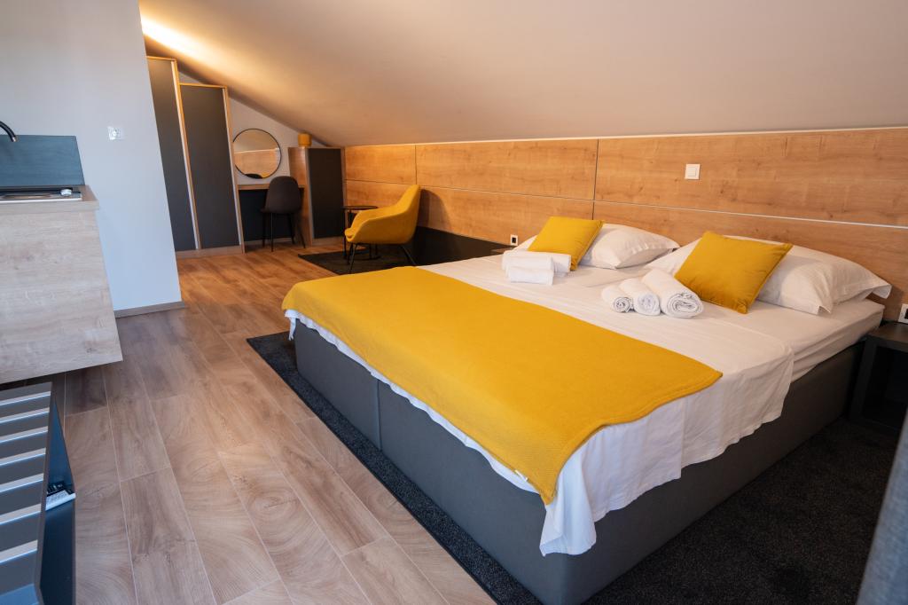 Profitez du confort et de l'élégance de nos chambres modernes et de nos appartements haut de gamme. Tous les hébergements sont classés 4 étoiles et équipés selon les normes hôtelières avec un mobilier soigneusement sélectionné et des équipements de qualité. Idéal pour les voyages d'affaires, les vacances en famille ou la détente estivale : votre séjour parfait à Novalja commence ici ! I 4 étoiles : une garantie de qualité I Équipement et design modernes I Appartements d'une chambre I Deux lits d'appoint dans le salon spacieux I Wi-Fi gratuit I Parking privé Réservez dès maintenant et découvrez un confort ultime ! REMARQUE : Les lits d'appoint dans le salon ne peuvent être utilisés que par des enfants de moins de 12 ans.