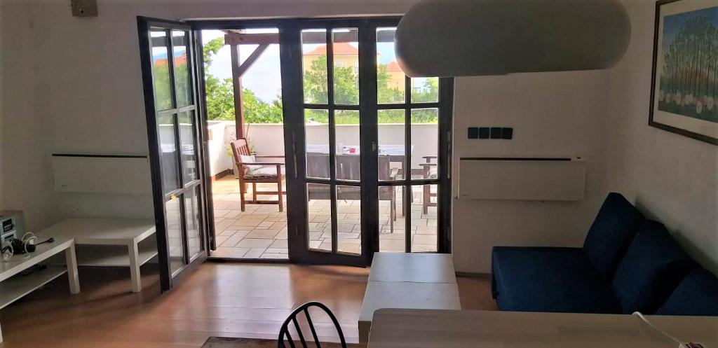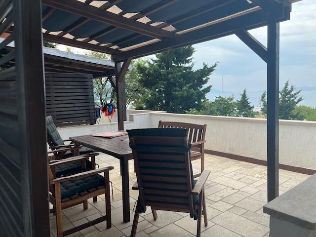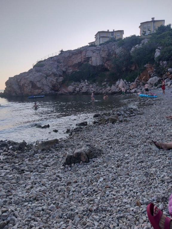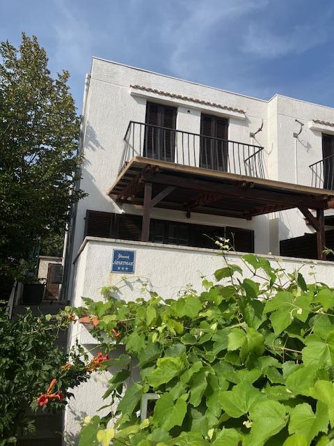 Appartement duplex 70m2 + grande terrasse 20m2 avec vue mer. Au rez-de-chaussée il y a un salon avec accès à la terrasse, une cuisine et un WC. A l'étage supérieur se trouve une salle de bain avec WC et douche, trois chambres (deux avec vue sur la mer et un balcon). Entrée indépendante, intimité. 3 minutes en bas des escaliers de la plage.