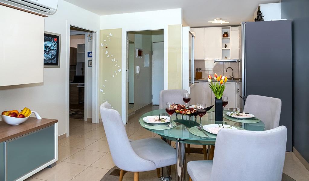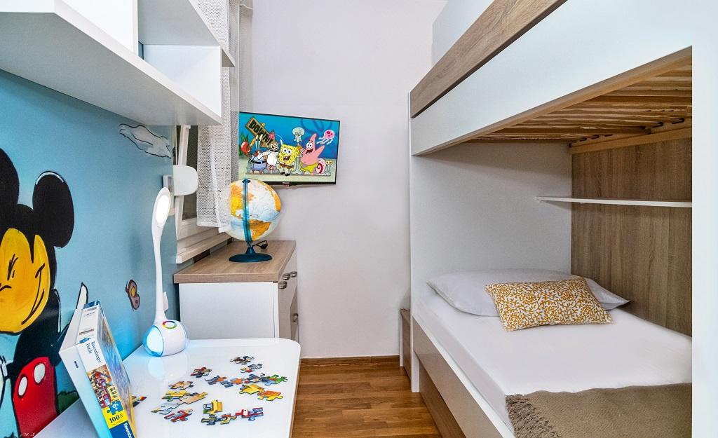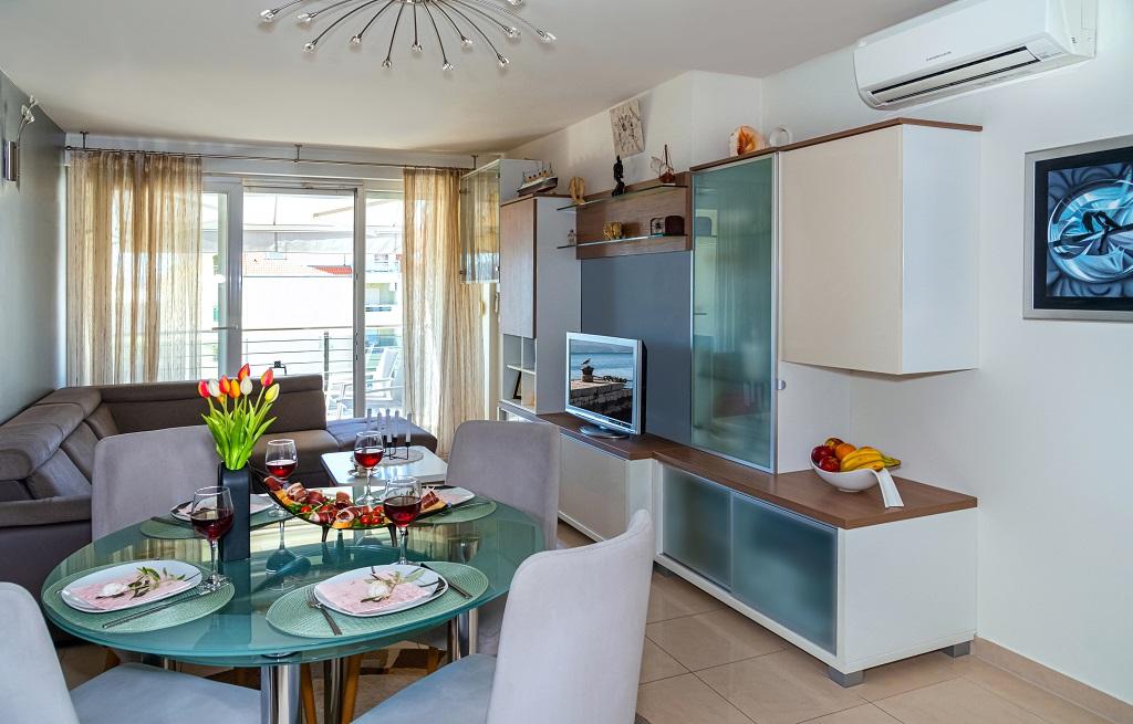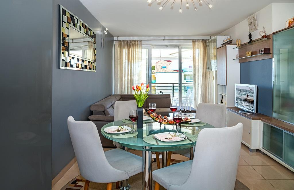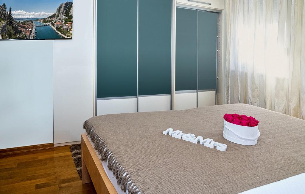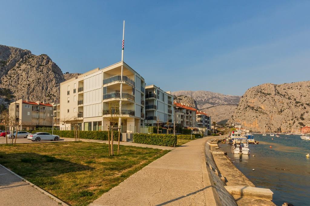 Un nouvel appartement moderne à proximité immédiate de la rivière Cetina et de la mer Adriatique. Avec 65 m2 de surface habitable, il peut accueillir confortablement jusqu'à 4+1 personnes, et le balcon offre une vue sur la rivière et l'estuaire de la Cetina. L'appartement est situé au troisième étage. Le bâtiment dispose d'un ascenseur. L'appartement se compose de deux chambres, une salle de bain, une cuisine bien équipée avec coin repas, un salon et un balcon couvert avec vue sur la rivière. La première chambre dispose d'un grand lit (180 x 200) pour 2 personnes, de tables de nuit et d'espaces de rangement pour vos vêtements et bagages. La deuxième chambre dispose de deux lits (90 x 200) pour 2 personnes, de tables de nuit et d'espaces de rangement pour vos vêtements et bagages. Les deux chambres sont lumineuses et bénéficient de beaucoup de lumière naturelle grâce au puits de lumière. Les chambres disposent de la climatisation. Il se compose d'un salon et d'une salle à manger dans un seul espace, et d'une cuisine ouverte très moderne. Il y a aussi une nouvelle cuisine avec les derniers appareils électroménagers, dont une plaque électrique à 4 feux, un four électrique, un réfrigérateur-congélateur, une bouilloire et toute la vaisselle nécessaire pour cuisiner. Juste à côté de la cuisine se trouve une salle à manger avec une table pour 4 personnes. Il y a aussi un salon avec une télévision, un élégant canapé-lit et une table basse. Il dispose d'une télévision et d'une connexion Wi-Fi. Refroidissement et chauffage dans le salon et la cuisine avec air conditionné. Les portes coulissantes en verre du salon s'ouvrent directement sur le balcon. Le balcon offre une vue panoramique sur la rivière et la mer. Si vous venez en voiture, il y a un parking public municipal autour du bâtiment. Notre appartement se trouve à 500 mètres de la ville d'Omiš, qui se trouve en fait à seulement 5 minutes à pied de chez nous. La plage de