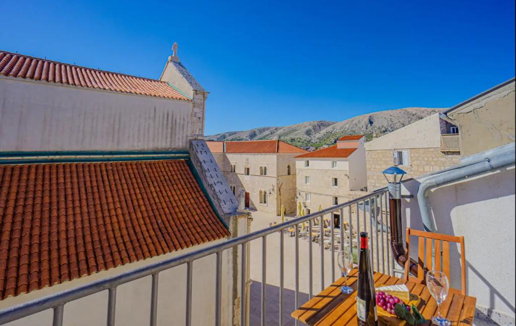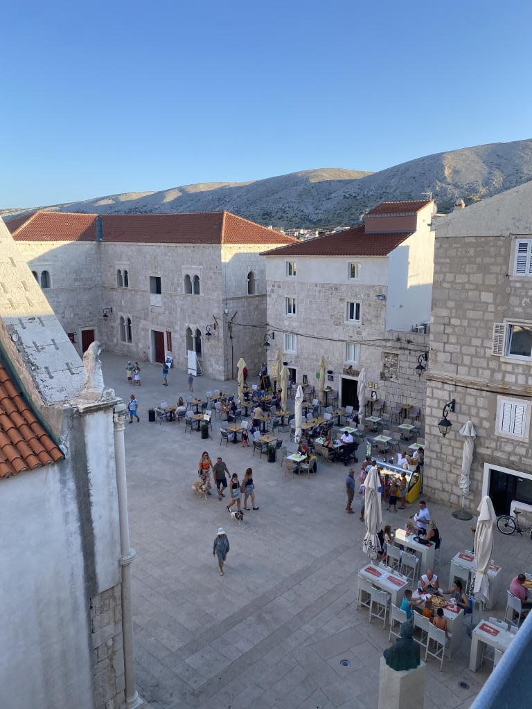 Maison de vacances avec vue sur la place principale, située dans le centre de Pag. Pour 4 personnes. Elle comprend : micro-ondes, télévision connectée, climatisation, bouilloire, grille-pain, réfrigérateur, lave-linge et terrasse avec parasol. Dans un rayon de 50 mètres, vous trouverez toutes les commodités : restaurants, boulangerie (10 m), magasin, pharmacie, cafés, boutiques de souvenirs, parking, église et gare routière (300 m). Parking gratuit inclus et place de parking privée. La plage principale de la ville est à 250 mètres de la maison. La plage de l'hôtel Pagus est également à proximité. Vue sur l'église et le palais du recteur.