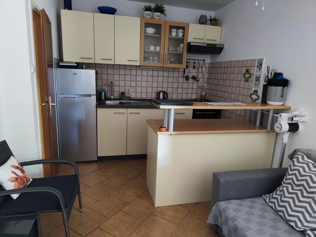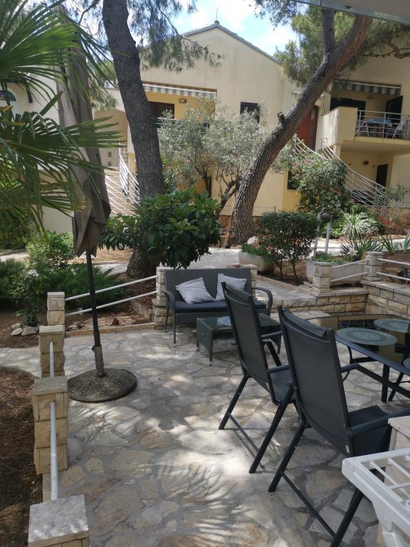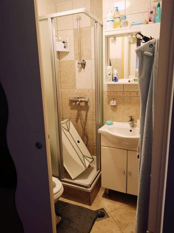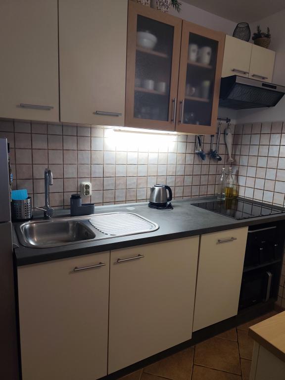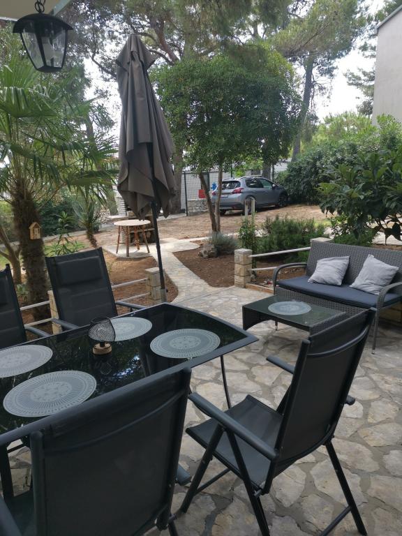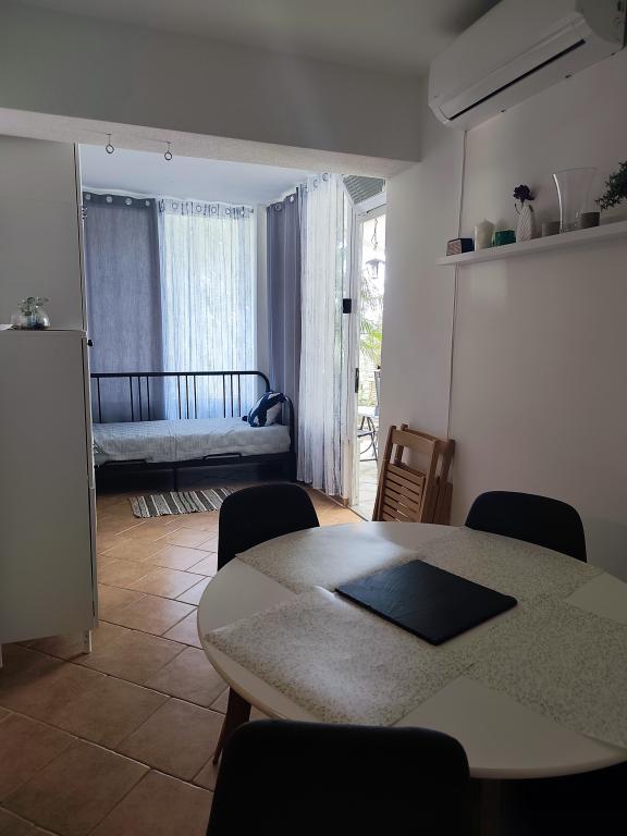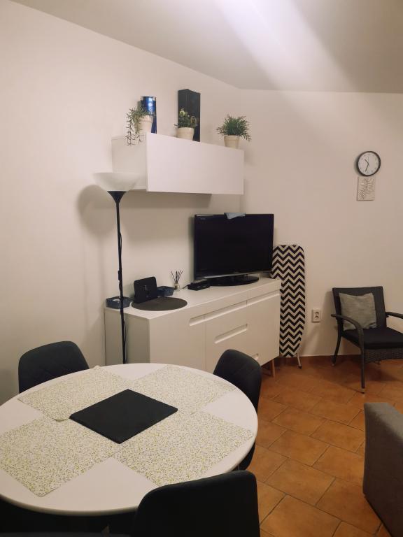 Un appartement romantique et chaleureux pour une famille, situé dans une impasse tranquille. La terrasse extérieure, avec son cadre méditerranéen pittoresque, est un véritable havre de paix pour le corps et l'esprit. L'appartement fait partie d'un immeuble dans une résidence sécurisée. Il dispose d'une magnifique terrasse de 20 mètres carrés où vous pourrez profiter de l'été, de jour comme de nuit, bercé par le chant des grillons. La terrasse est aménagée avec une table et six chaises, un salon de jardin confortable et un barbecue (bois ou charbon). L'intérieur comprend une chambre avec un lit double, une loggia avec un lit de 160 x 200 cm et, si besoin, un lit bébé. La salle de bain est équipée d'une cabine de douche et de tous les accessoires nécessaires. Un petit couloir mène à la pièce de vie ouverte comprenant un coin repas et une cuisine. La cuisine est entièrement équipée (lave-vaisselle, lave-linge, chauffe-eau, réfrigérateur-congélateur, four à micro-ondes, mixeur plongeant et classique, friteuse à air chaud). Un premier couchage d'appoint peut être aménagé en canapé deux places devant la télévision. Plusieurs placards sont à disposition. La table à manger est composée de quatre chaises et de deux chaises supplémentaires.