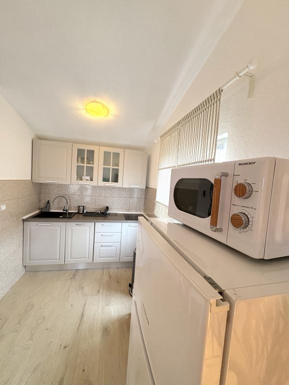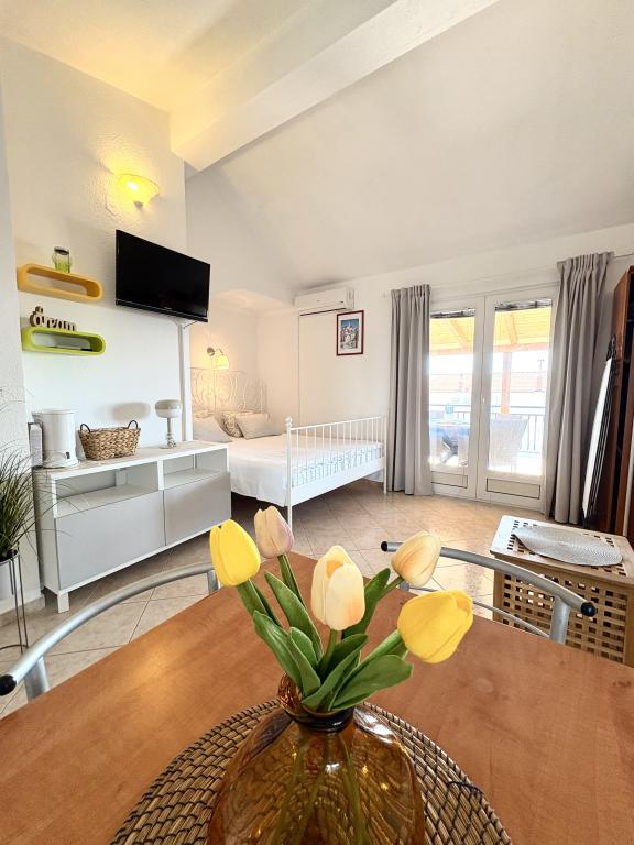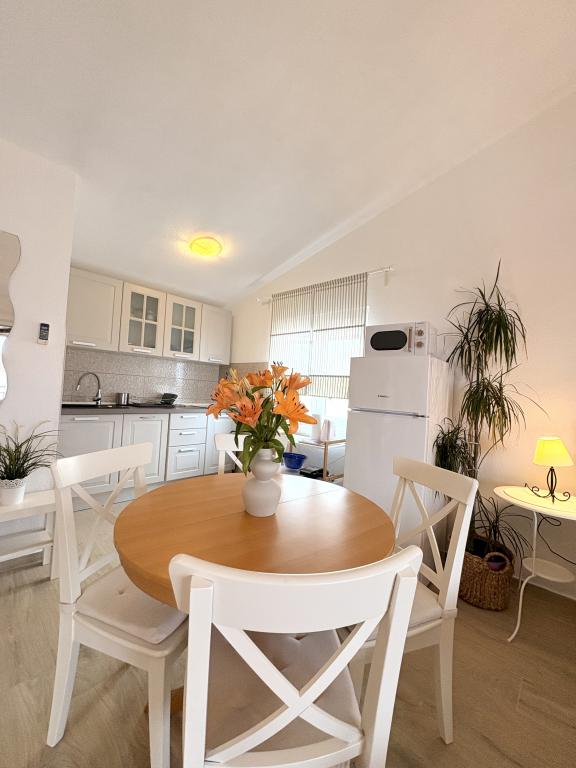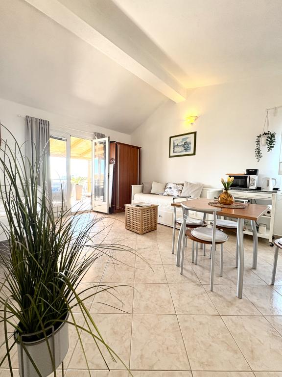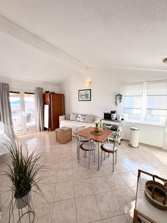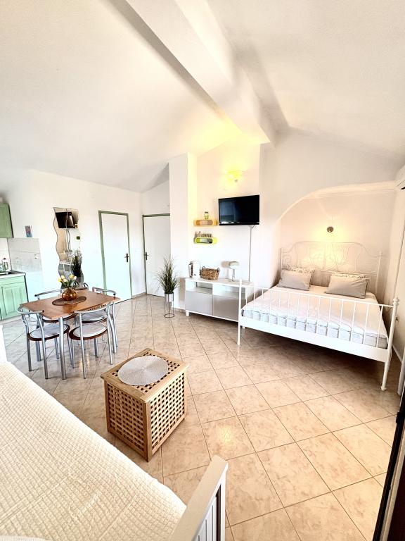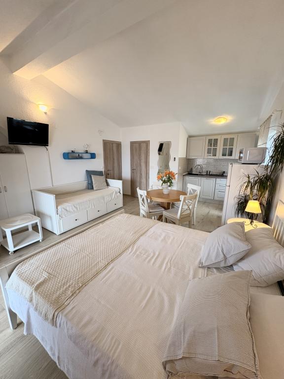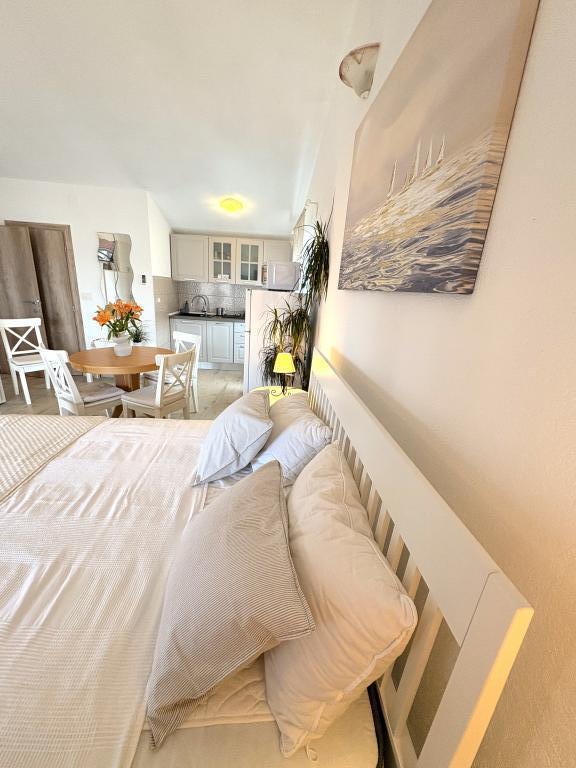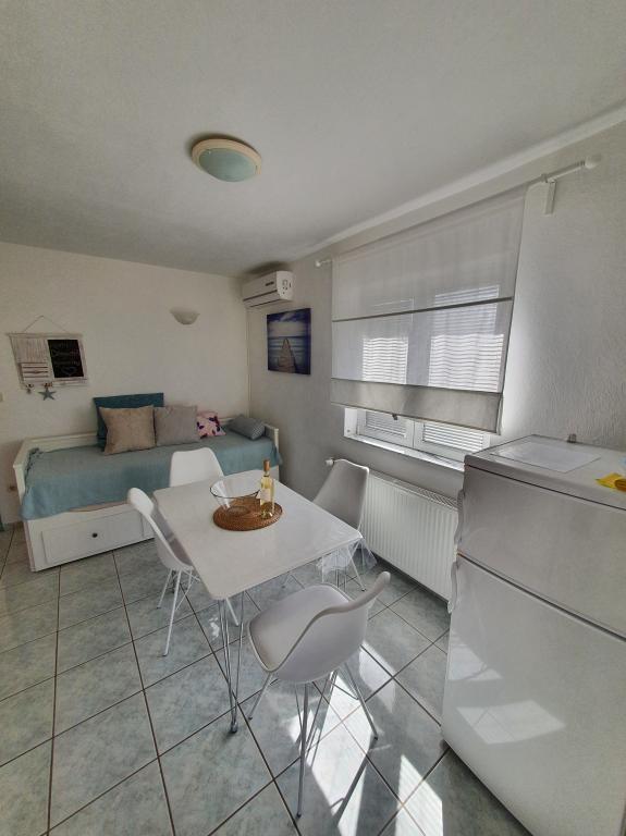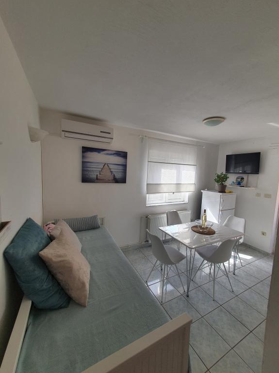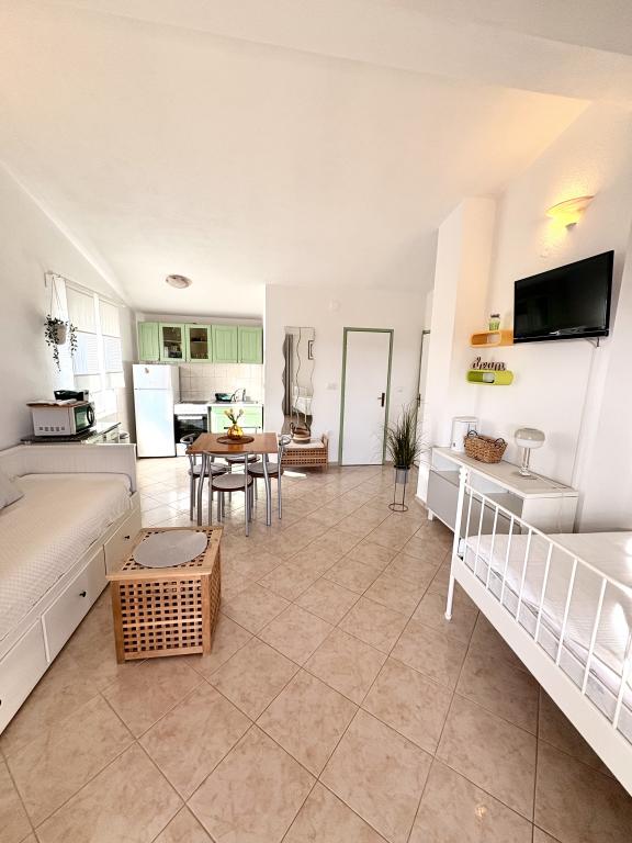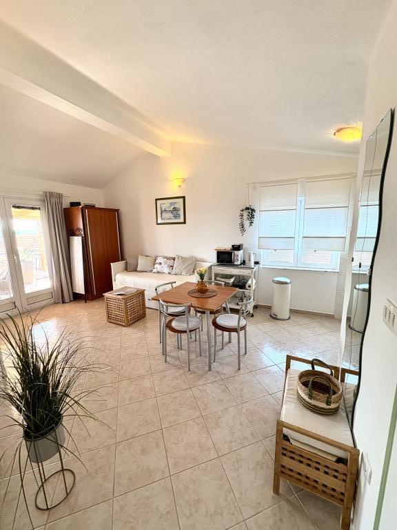 Très bel hébergement, belle et grande terrasse. Studio est suffisant pour une famille avec de jeunes enfants. L'équipement est génial, tout ce dont vous avez besoin. Très bons propriétaires, très sympathiques et disposés. Une courte promenade à la plage. Dans la soirée et la nuit. Nous vous recommandons d'avoir apprécié nos vacances.