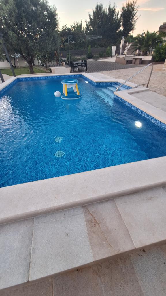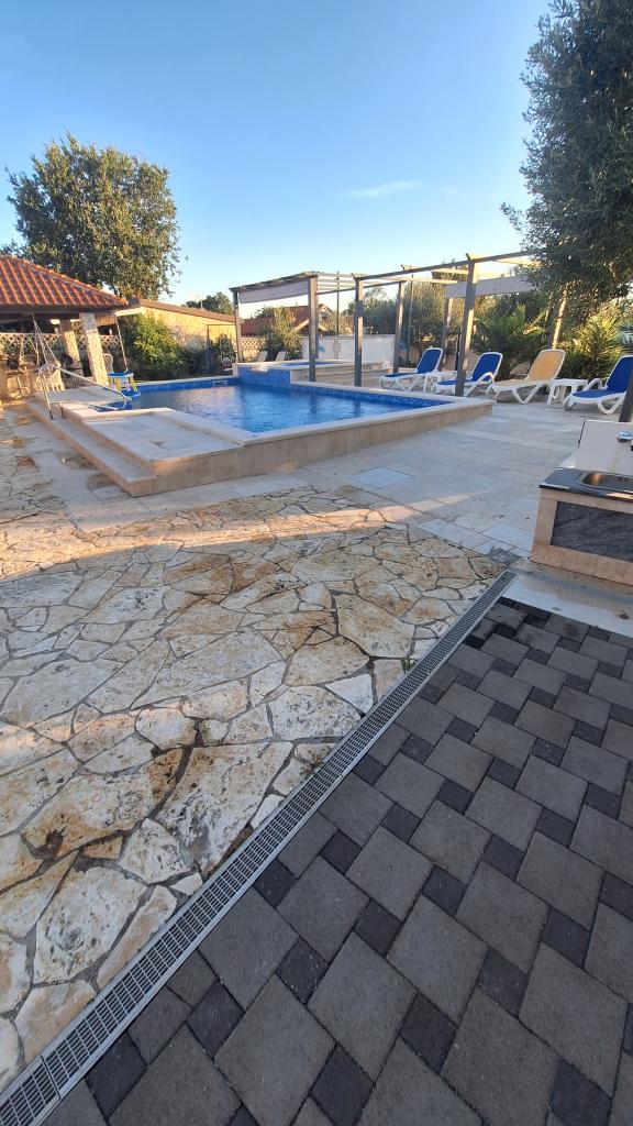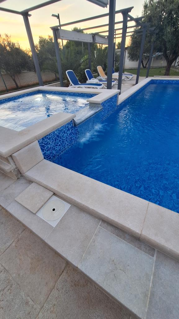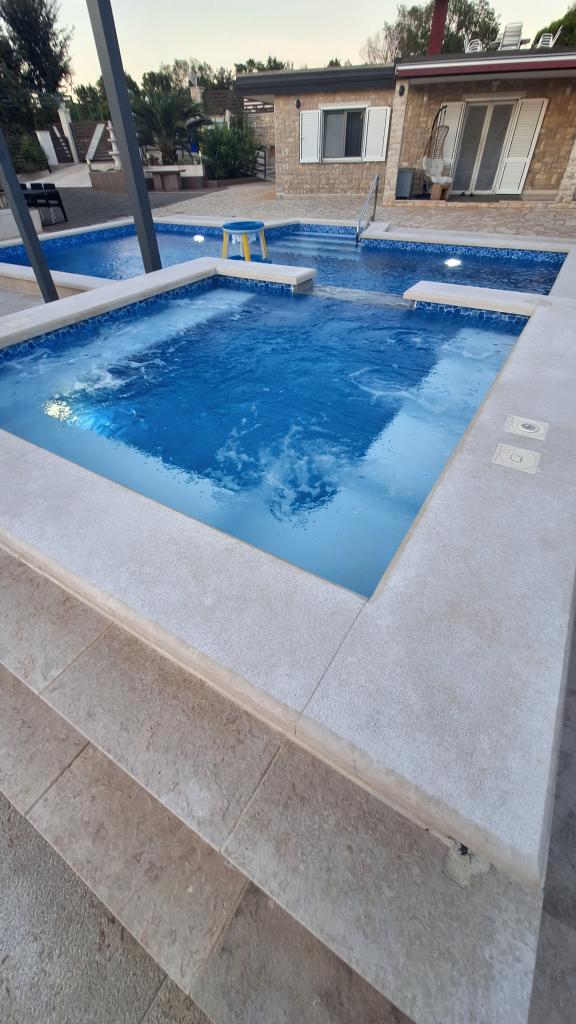 Maison de vacances avec piscine chauffée et bassin de massage avec cascade artificielle. La piscine mesure 8 x 4 m et le bassin de massage 3 x 3 m. La plage est à 200 mètres. À proximité : restaurant, port de plaisance et plage pour animaux. Barbecue et parking pour 3 voitures.