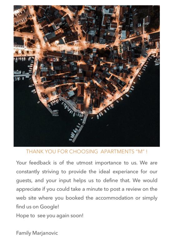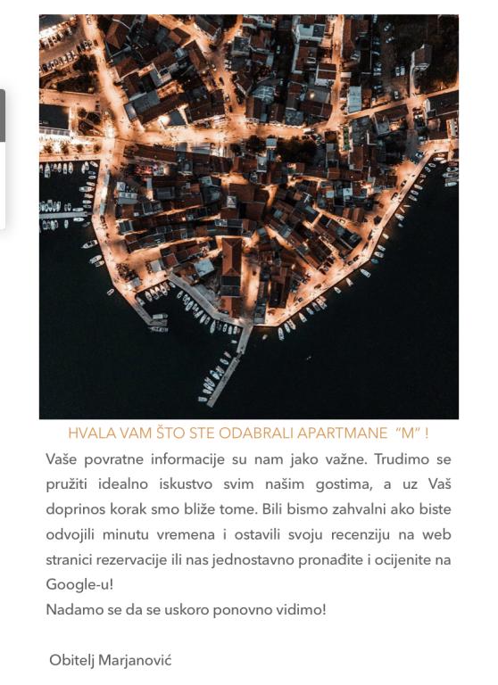 Chère Danijela, toujours nous ravir quand les invités sont heureux et satisfaits. Nous le ferons l'année prochaine. À bientôt! En Juillet, Appartements M