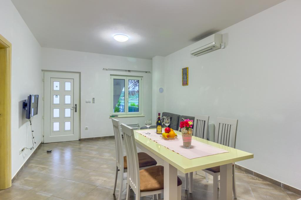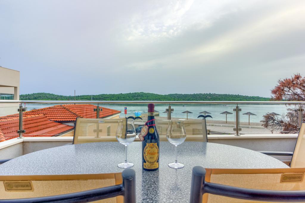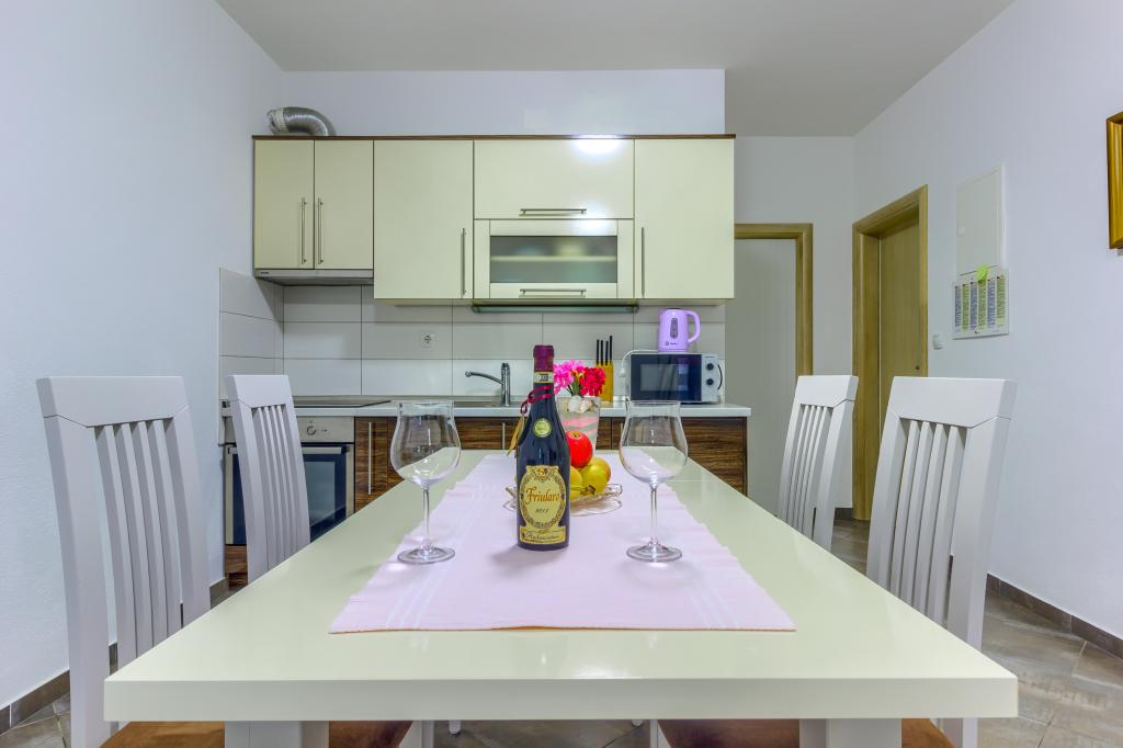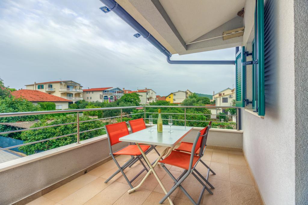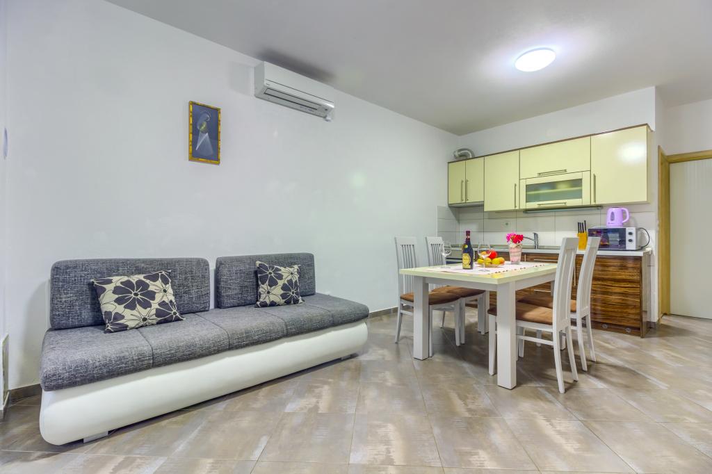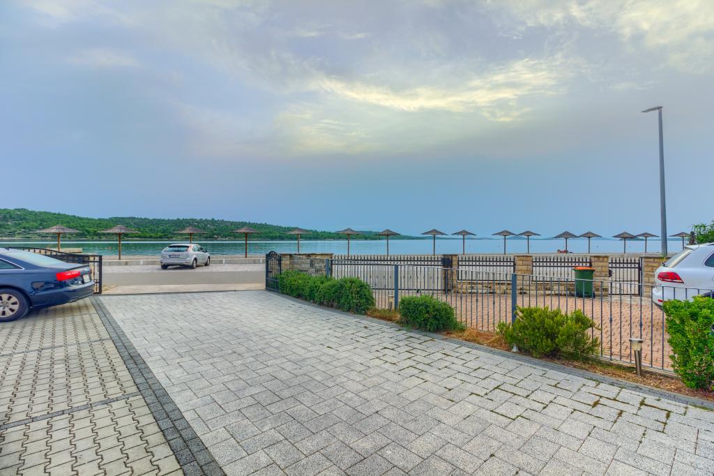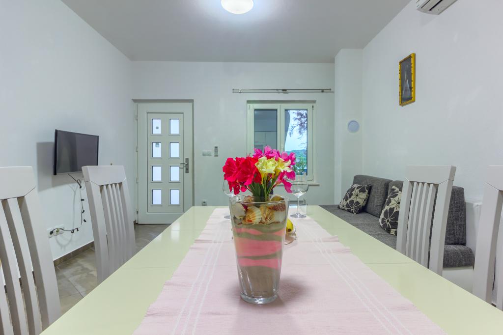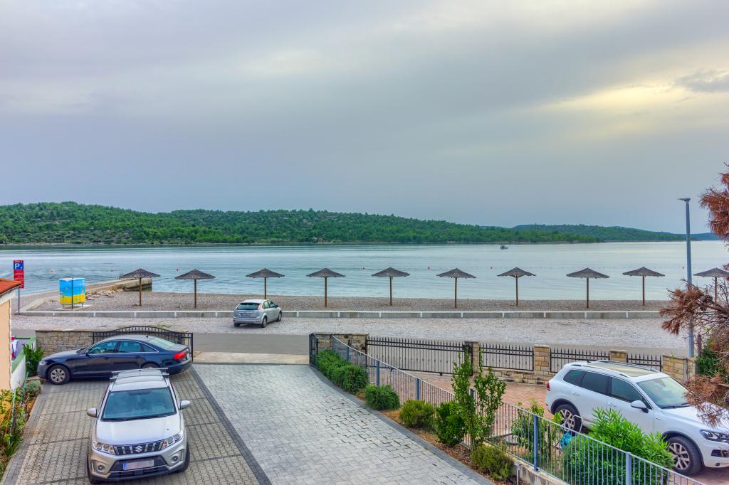 Neuf bel appartement avec terrasse et vue. Situé dans un quartier paisible et tranquille à quelques mètres de la mer. Le prix comprend: air conditionné, tv, wifi, parking privé, barbecue. .