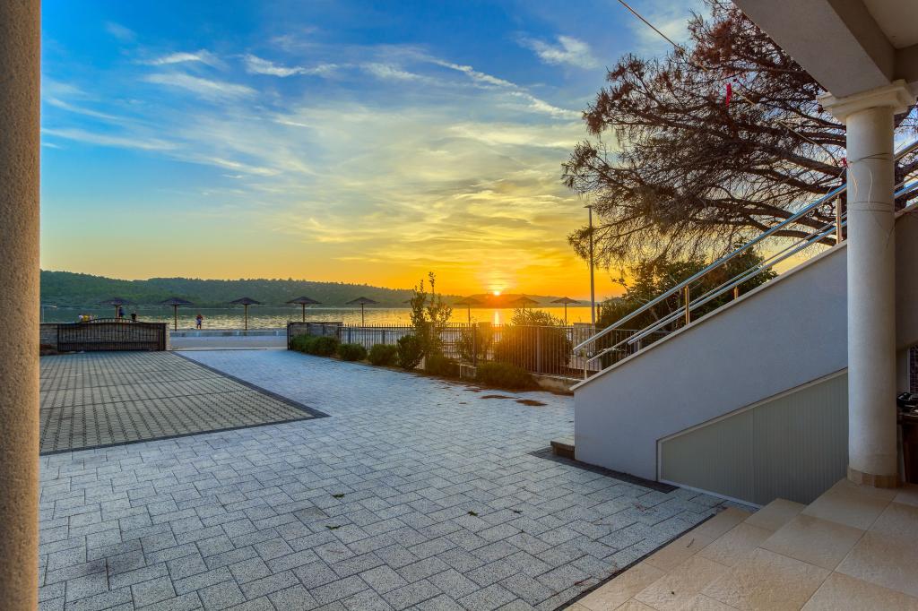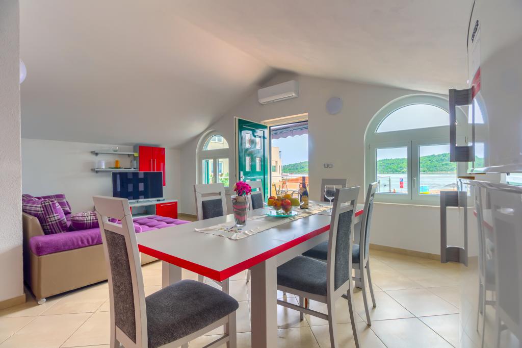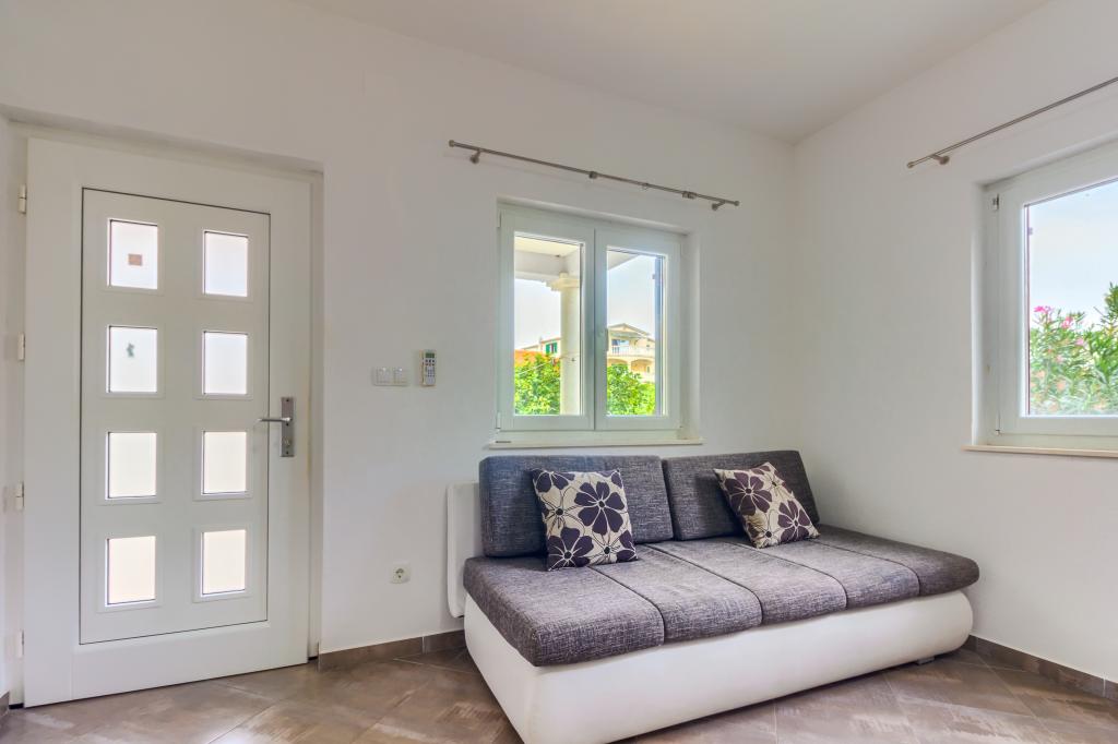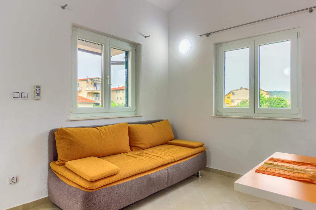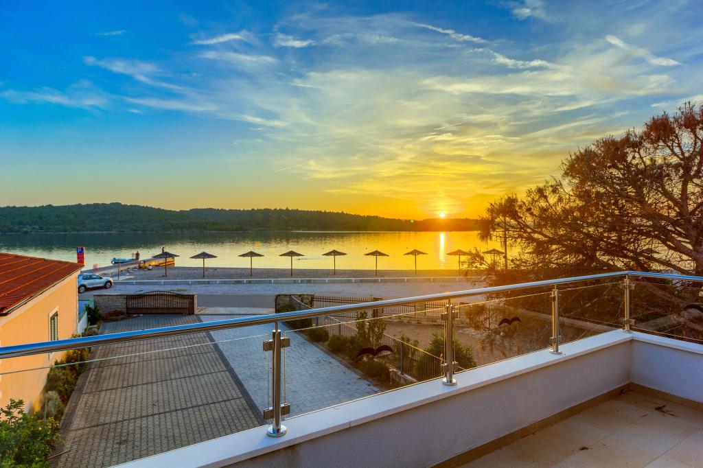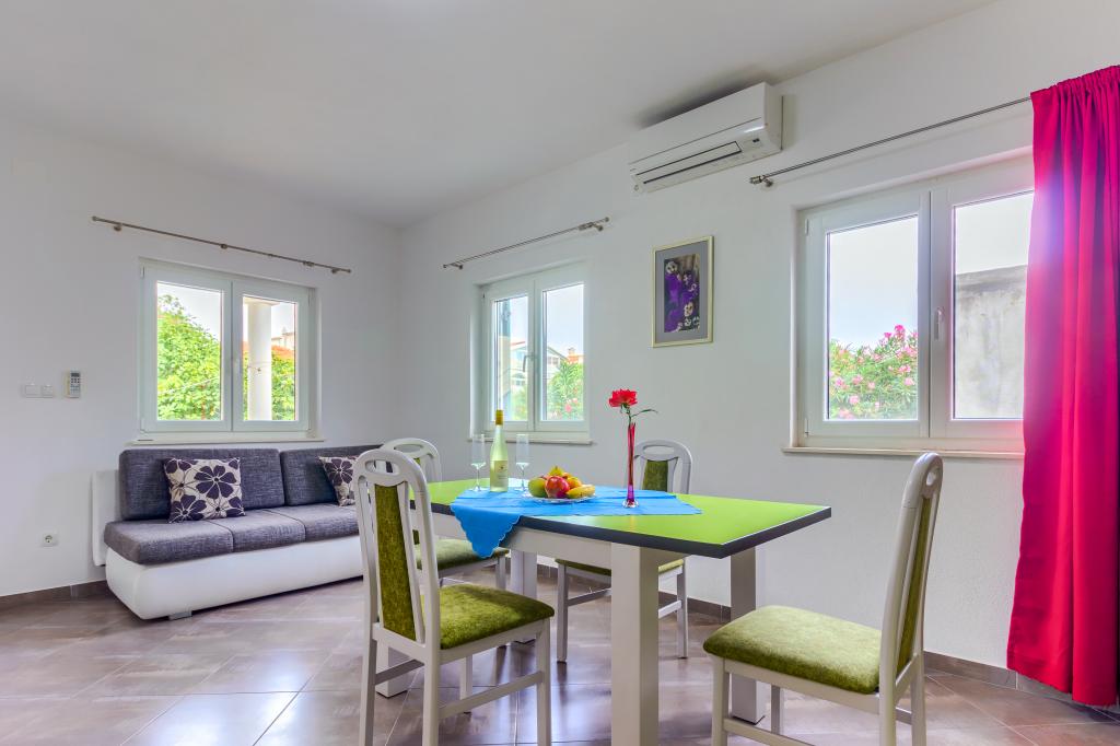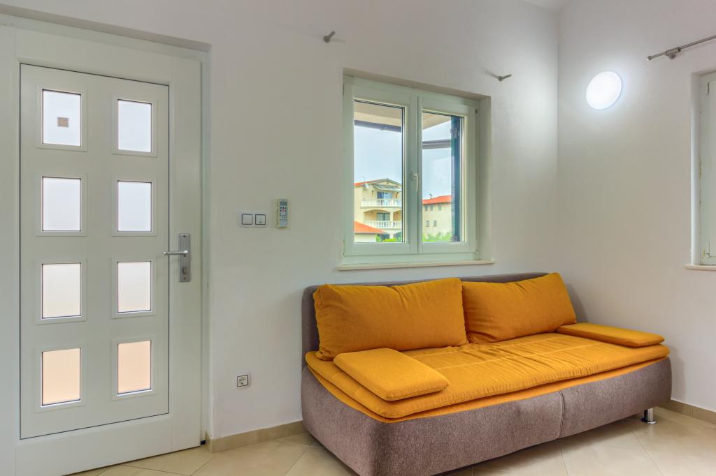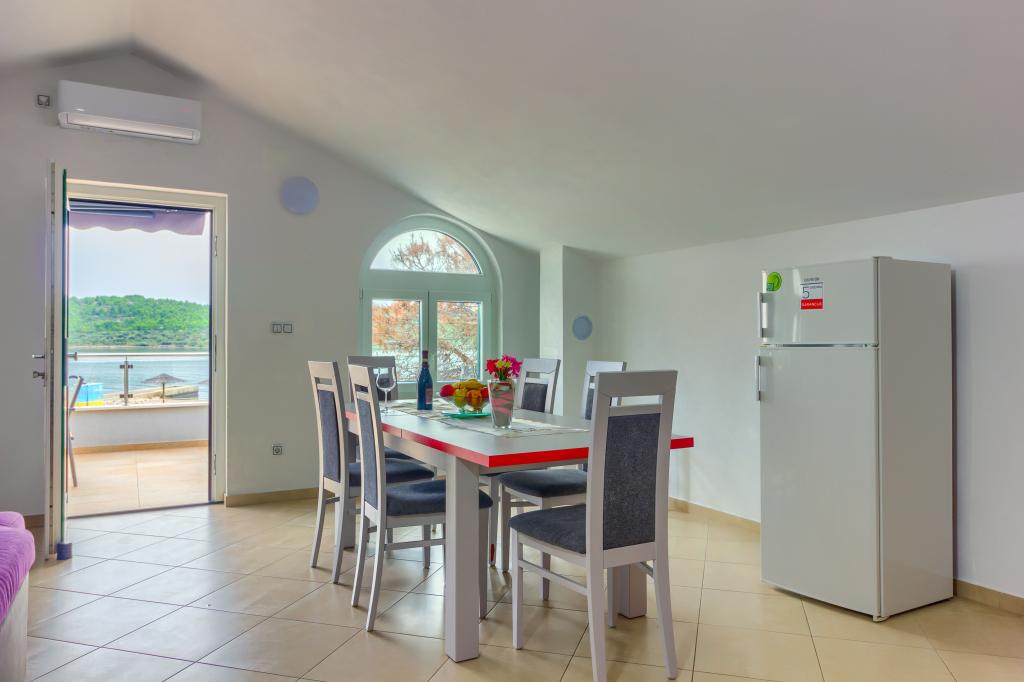 Neuf bel appartement avec terrasse et vue. Situé dans un quartier paisible et tranquille à quelques mètres de la mer. Le prix comprend: air conditionné, tv, wifi, parking privé, barbecue. .