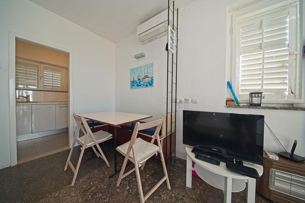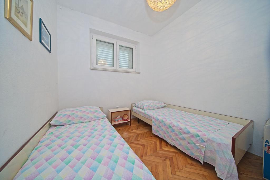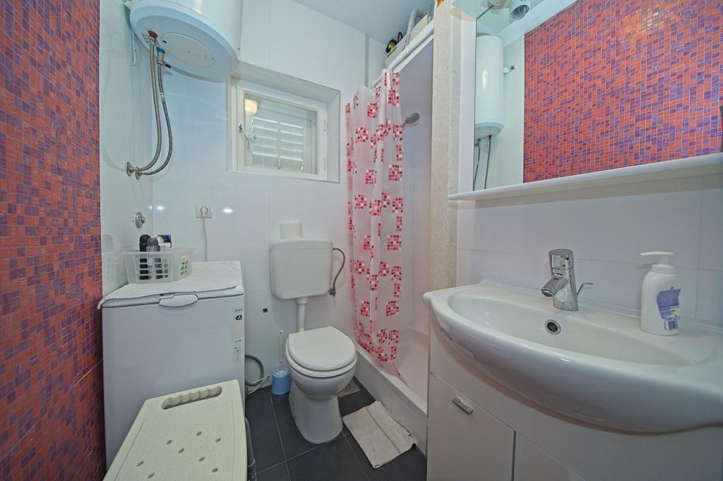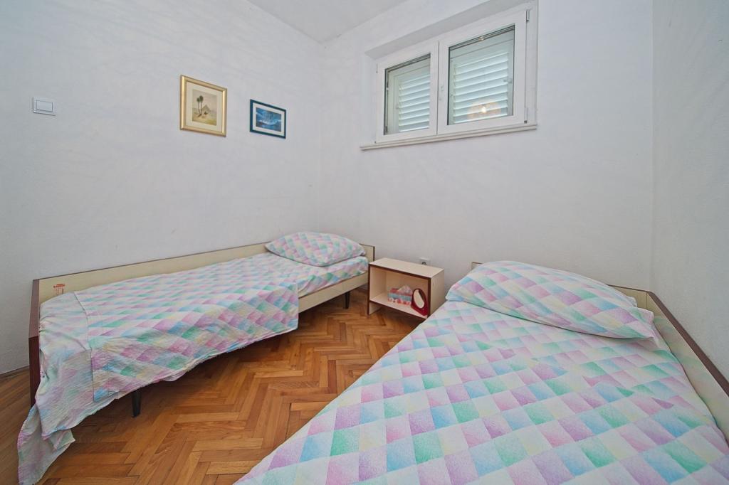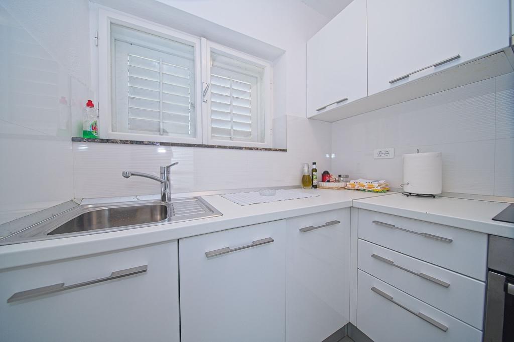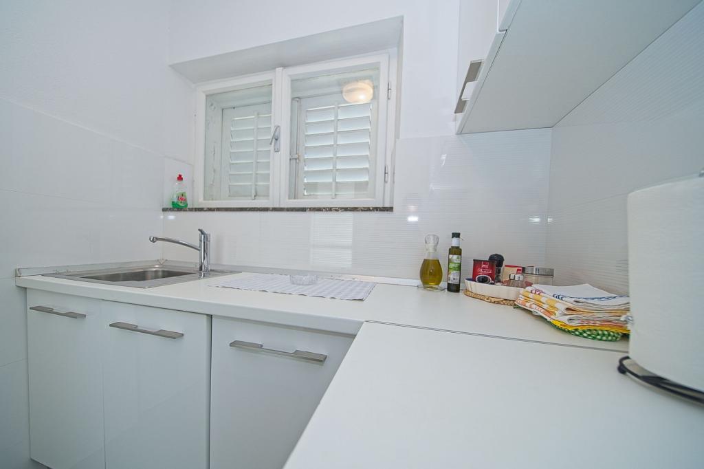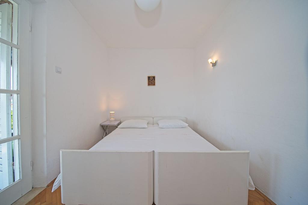 La maison dans laquelle se trouvent les appartements est située dans un quartier calme et attrayant de la ville. Entouré d'un jardin arboré et fleuri, une spacieuse terrasse couverte offre une belle vue sur la mer. Il y a une place de parking devant la maison et un barbecue dans la cour. La mer n'est qu'à 80 m et la plage de sable la plus proche. La baie est calme, mais vous êtes à 2-3 minutes à pied du centre-ville.