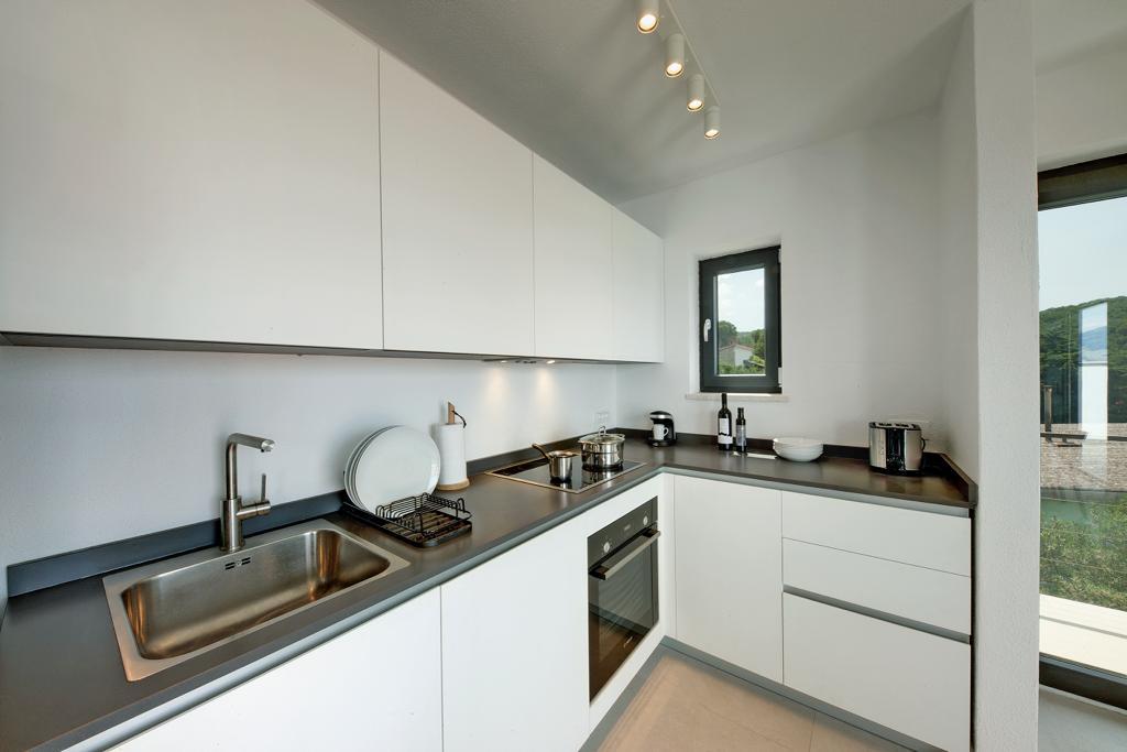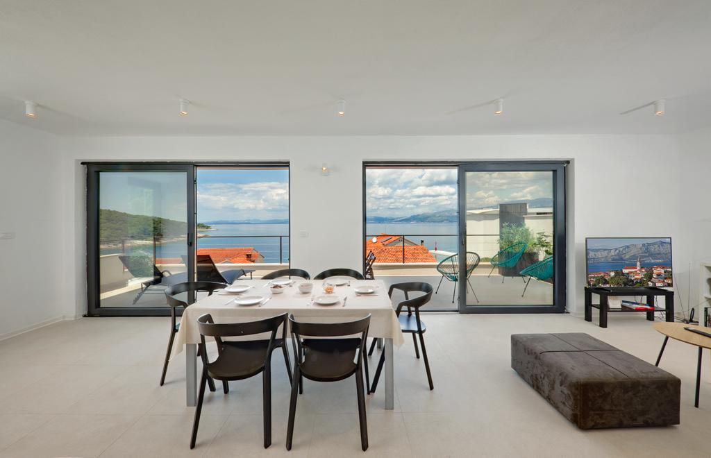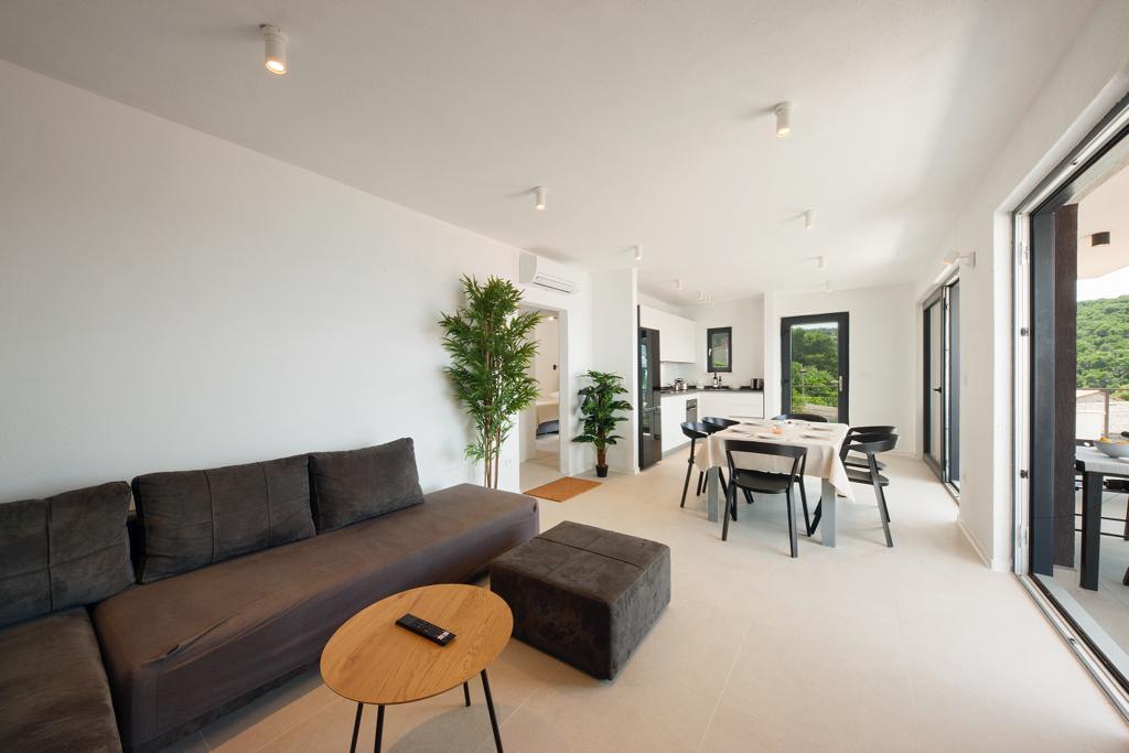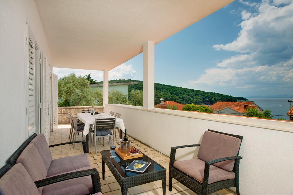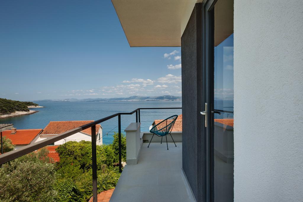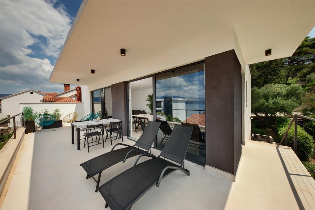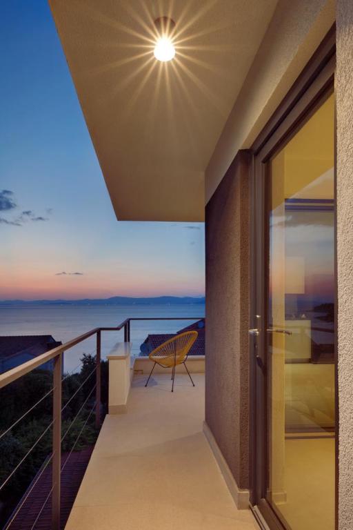 La maison dans laquelle se trouvent les appartements est située dans un quartier calme et attrayant de la ville. Entouré d'un jardin arboré et fleuri, une spacieuse terrasse couverte offre une belle vue sur la mer. Il y a une place de parking devant la maison et un barbecue dans la cour. La mer n'est qu'à 80 m et la plage de sable la plus proche. La baie est calme, mais vous êtes à 2-3 minutes à pied du centre-ville.