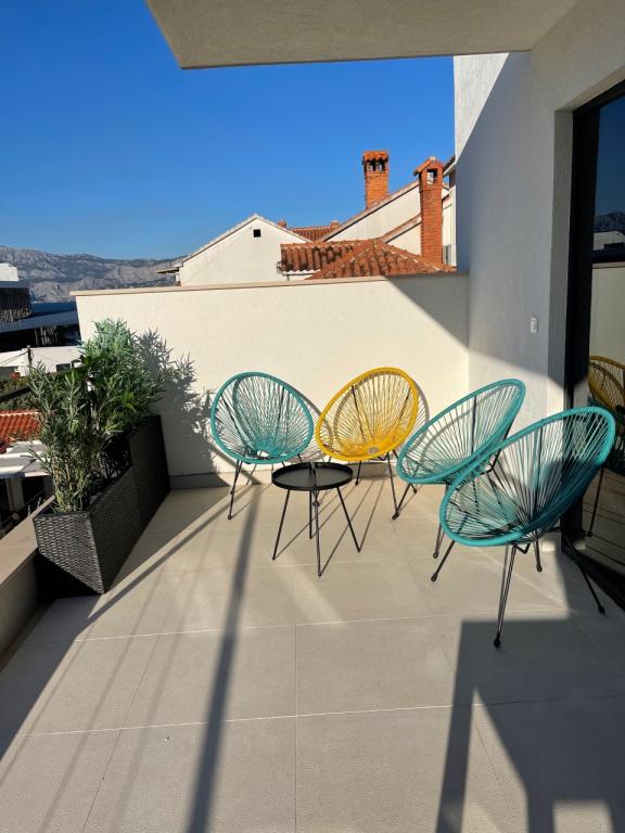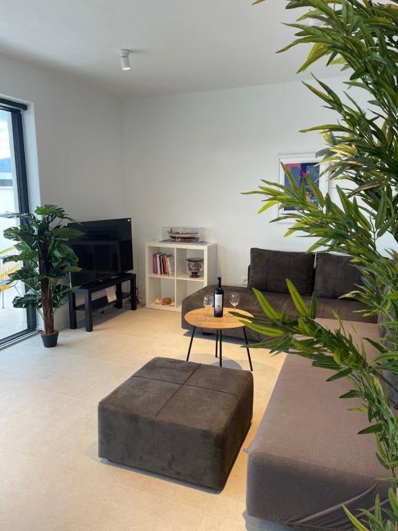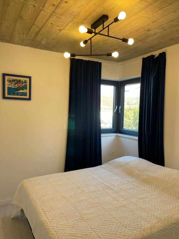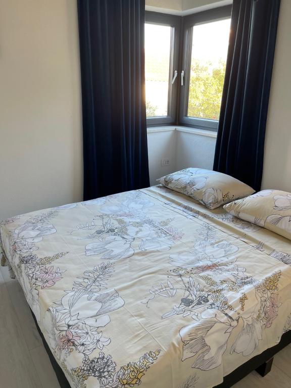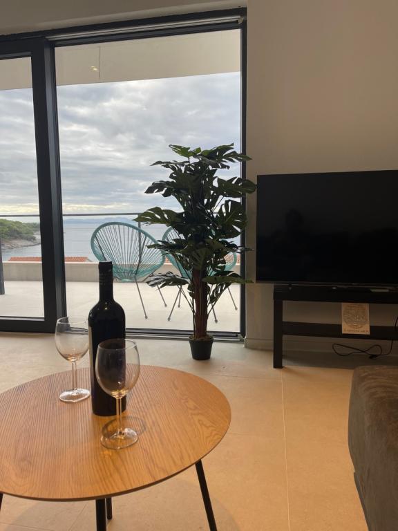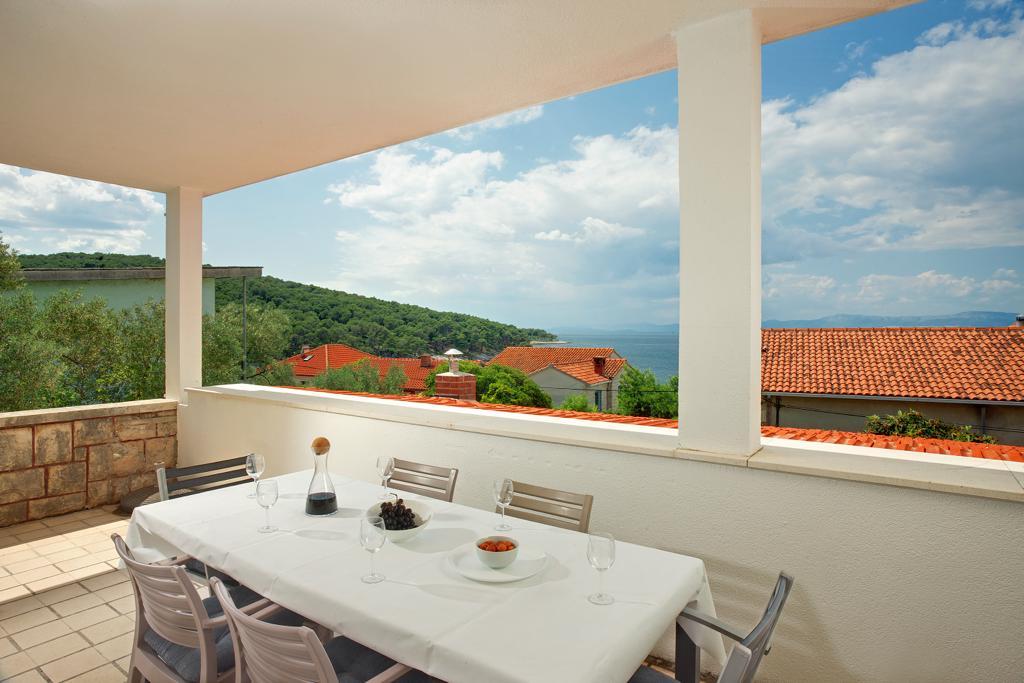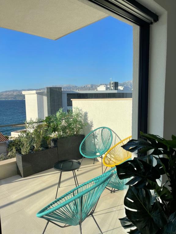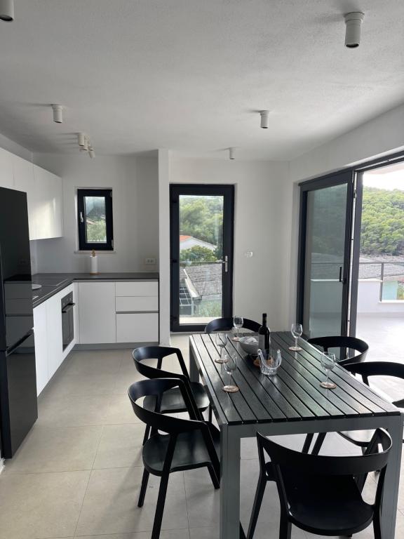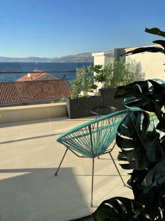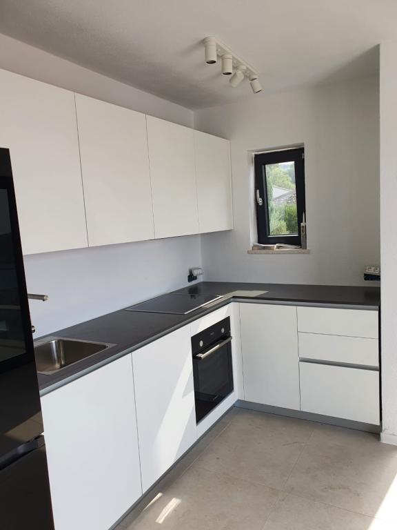 La maison dans laquelle se trouvent les appartements est située dans un quartier calme et attrayant de la ville. Entouré d'un jardin arboré et fleuri, une spacieuse terrasse couverte offre une belle vue sur la mer. Il y a une place de parking devant la maison et un barbecue dans la cour. La mer n'est qu'à 80 m et la plage de sable la plus proche. La baie est calme, mais vous êtes à 2-3 minutes à pied du centre-ville.