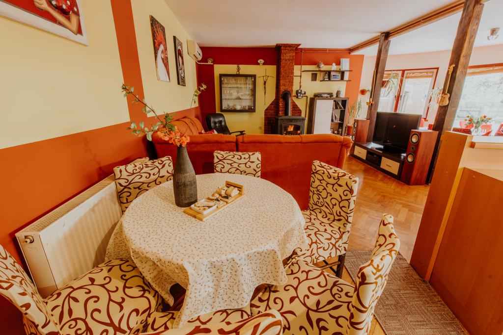 Situé au cœur du village slave animé d'Alilovci, à seulement 10 km de l'entrée du parc naturel Papuk, du parc aquatique Shhhum et du parc adrénaline Duboka, et à 9 km de Požega. Il se trouve à 173 km de Zagreb et à 101 km d'Osijek. La maison dispose de 150 m2 d'espace intérieur et de 2000 m2 d'espace vert extérieur (cour clôturée, jardin, verger). Il peut accueillir 9 personnes et la capacité maximale est de 11 personnes (2 personnes sur un lit d'appoint ou dans le séjour). La maison est spacieuse, belle et bien équipée. Elle comprend 3 chambres, une salle de bain, un WC, une cuisine et un séjour relié à la cuisine et salle à manger pour 11 personnes. Grand séjour avec climatisation, Wi-Fi, cheminée, TV, chaîne stéréo et jeux de fléchettes. La cuisine est entièrement équipée avec vaisselle, lave-vaisselle, micro-ondes, réfrigérateur, congélateur et four. La salle de bain dispose d'une baignoire jacuzzi et d'un lave-linge. Grande cour verdoyante avec jacuzzi chaleureux pour une durée allant jusqu'à 5 à 9 mois. Espace de pêche couvert, aire de jeux pour enfants, trampoline, transats.