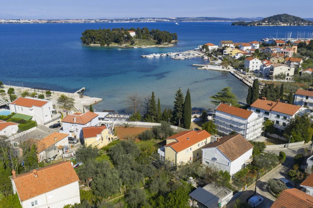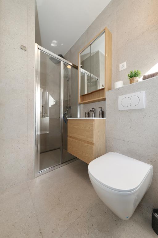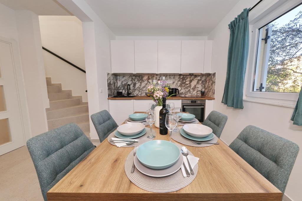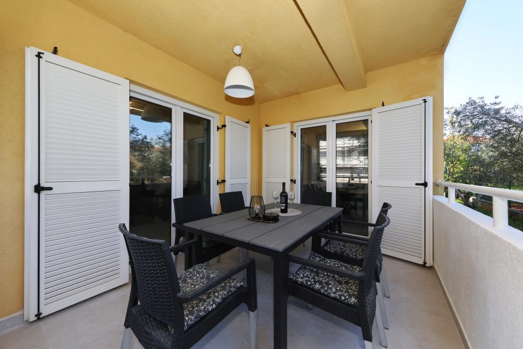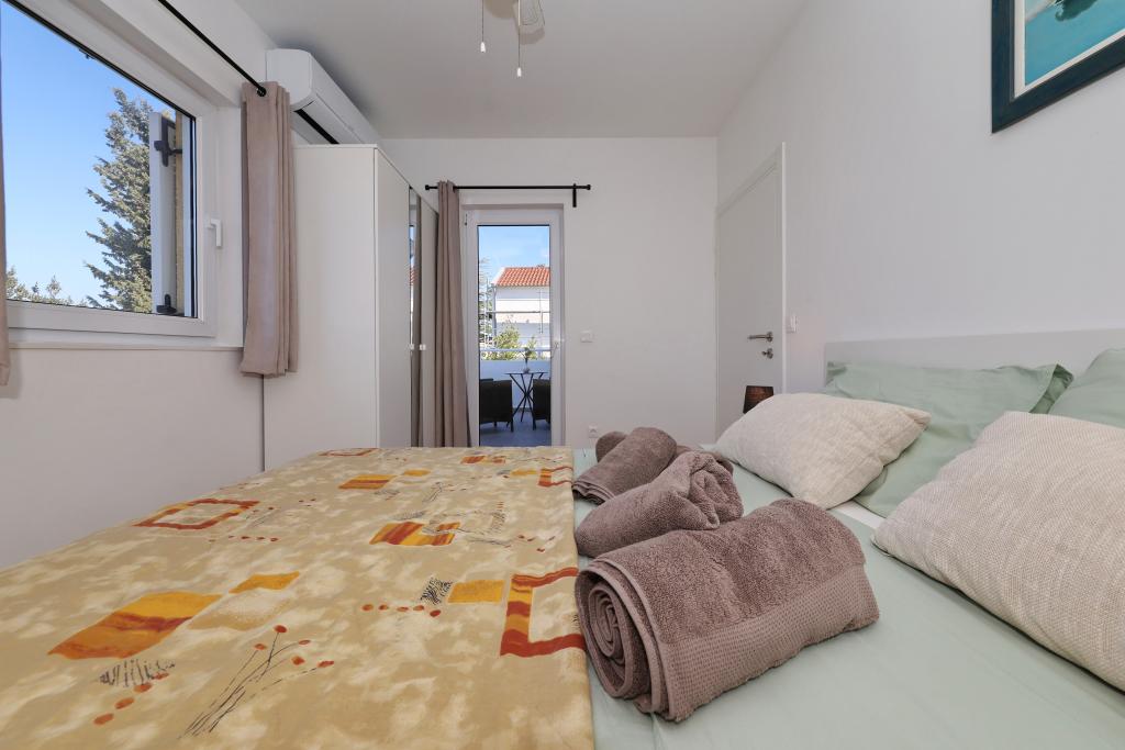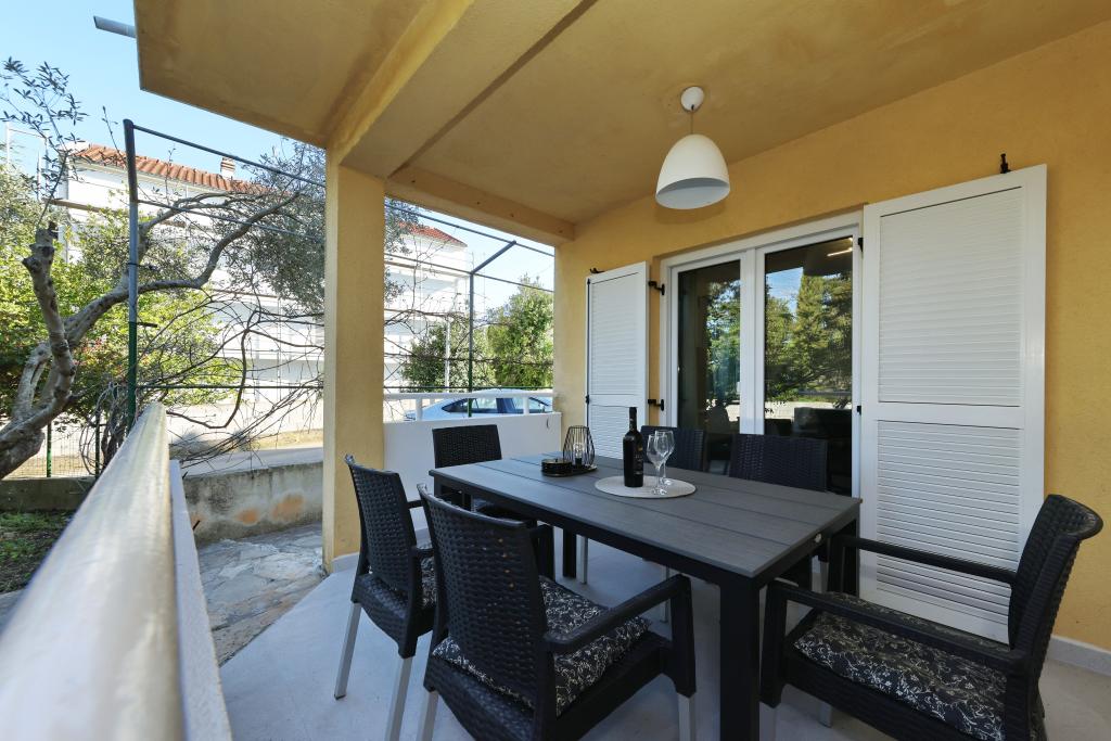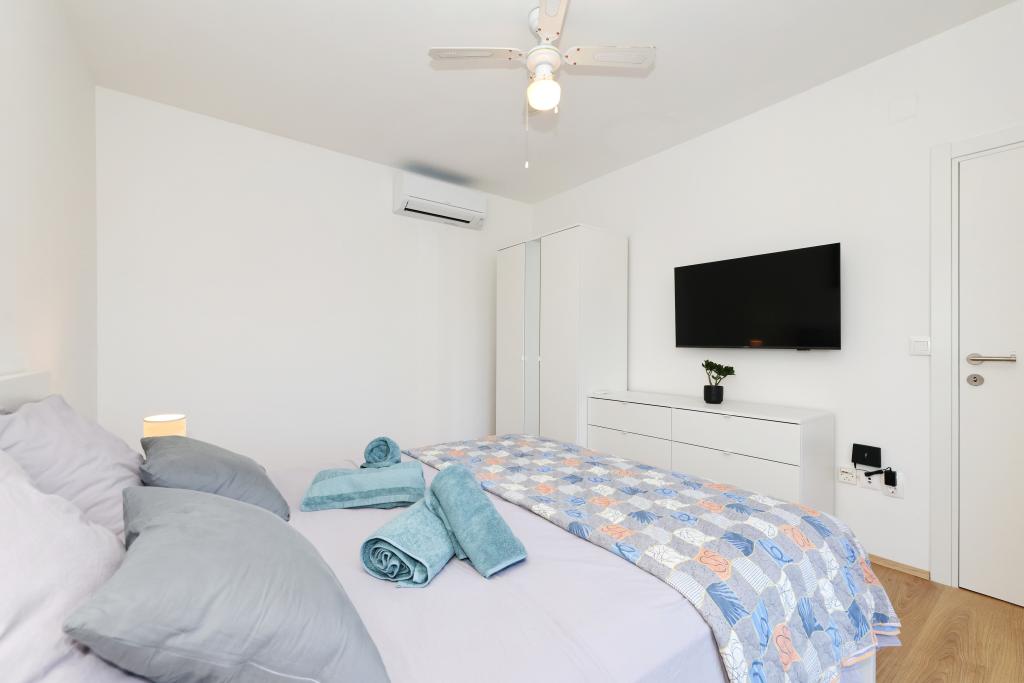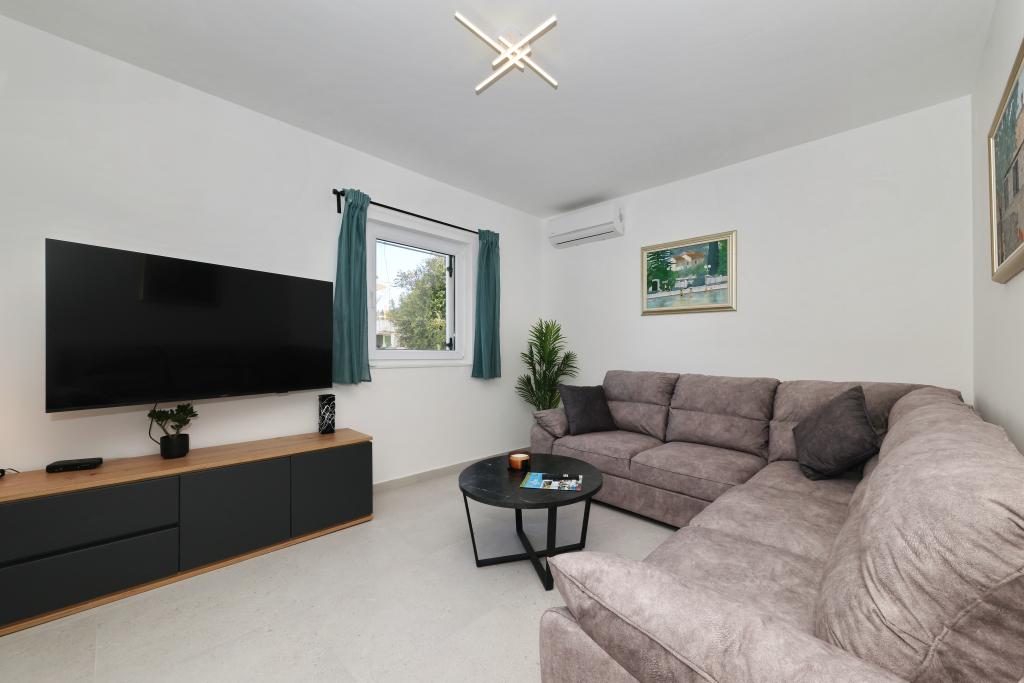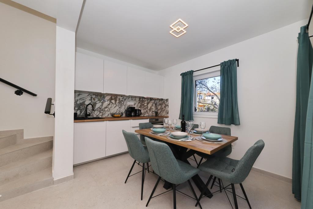 Appartement entièrement équipé avec deux chambres climatisées, une terrasse au premier étage, une loggia au rez-de-chaussée et un parking privé, dans un quartier calme de Prek, à proximité de la plage de sable de Jaz.