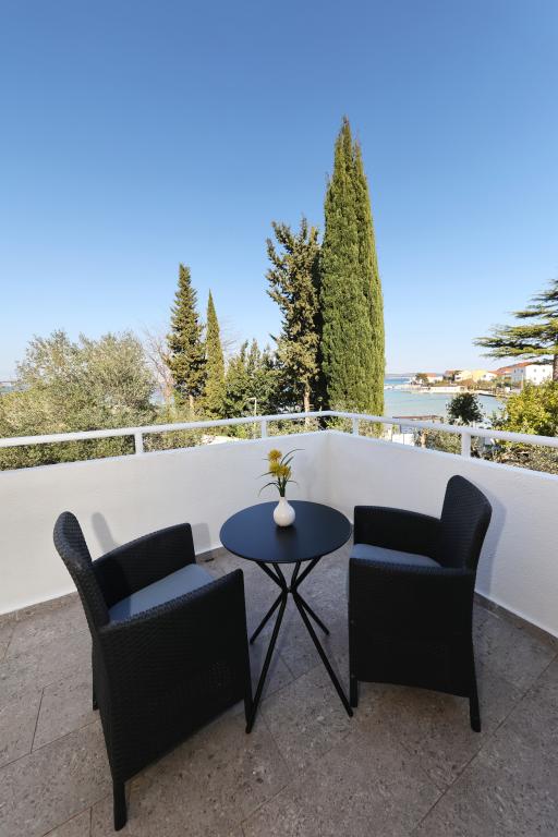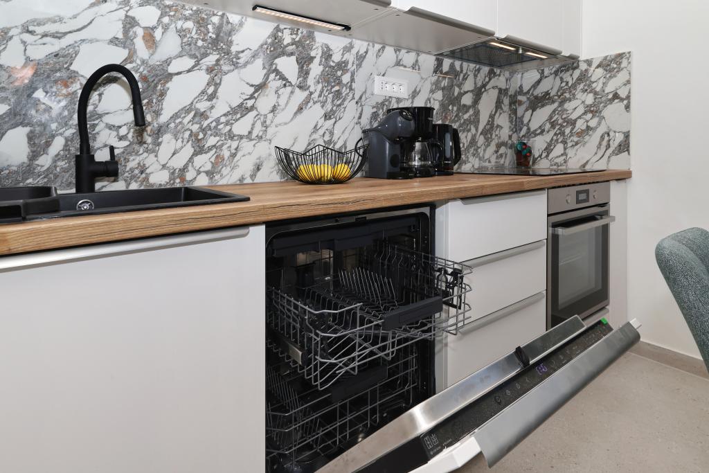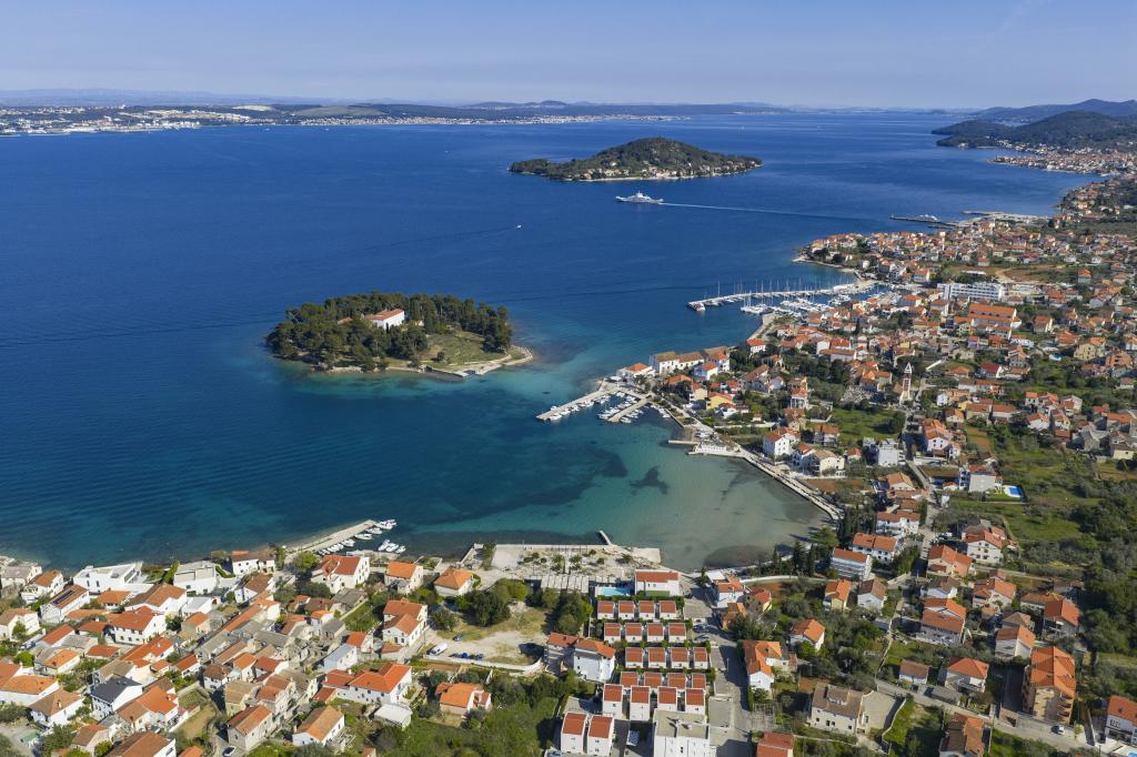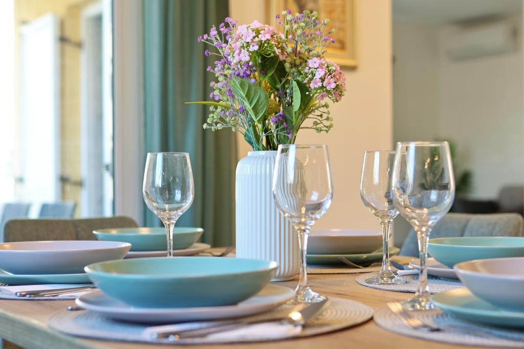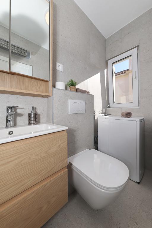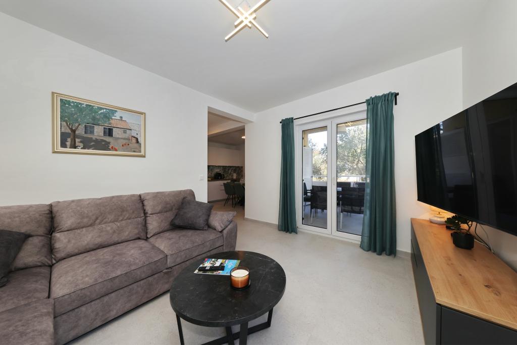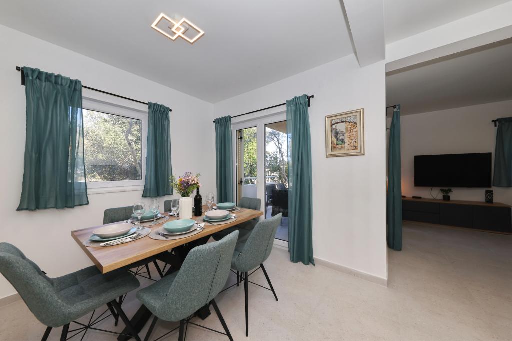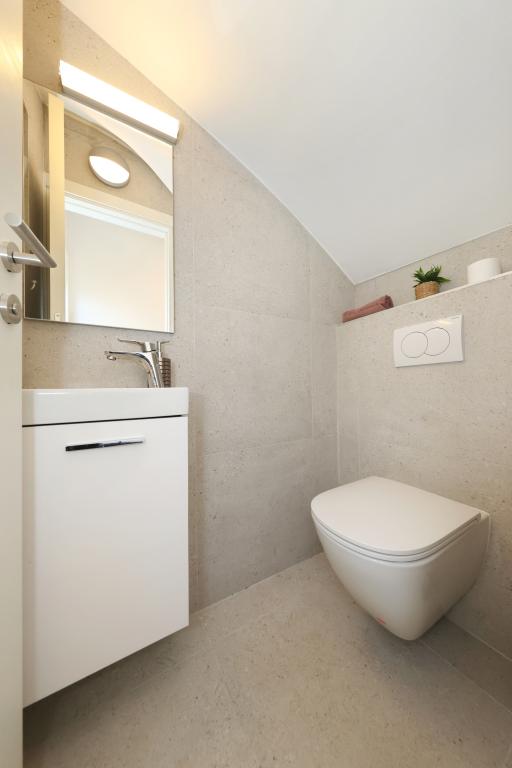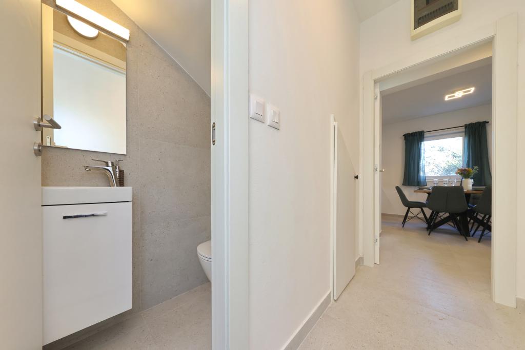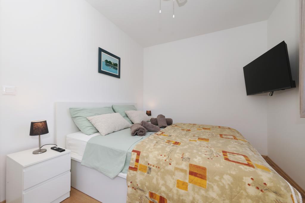 Appartement entièrement équipé avec deux chambres climatisées, une terrasse au premier étage, une loggia au rez-de-chaussée et un parking privé, dans un quartier calme de Prek, à proximité de la plage de sable de Jaz.