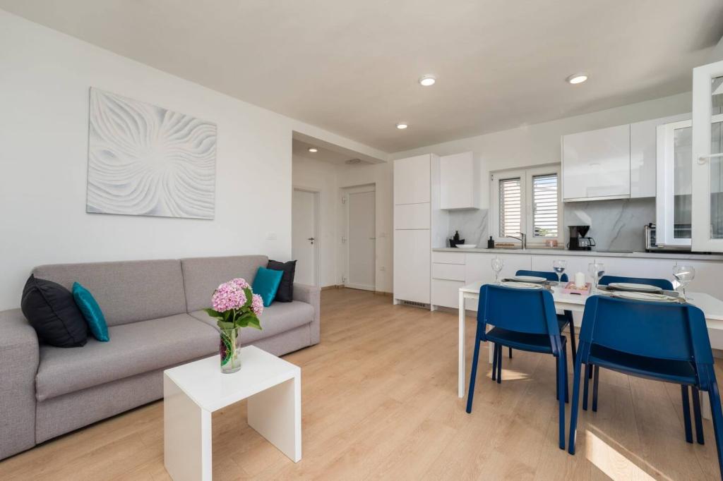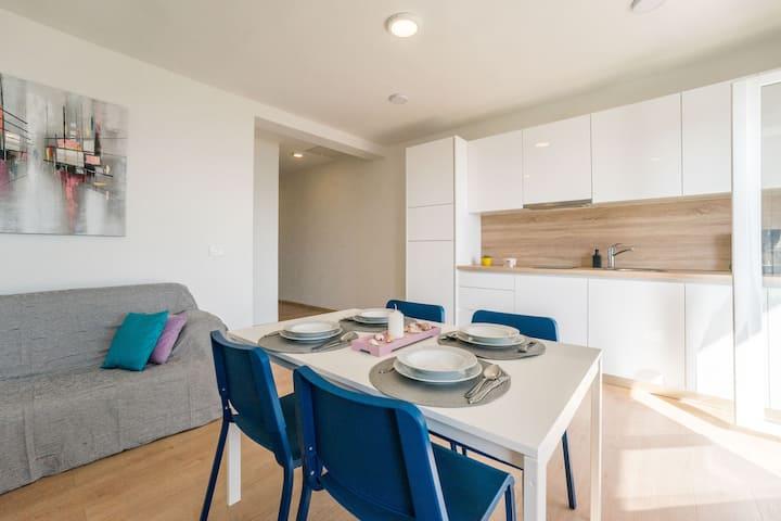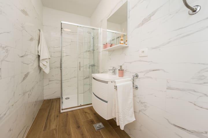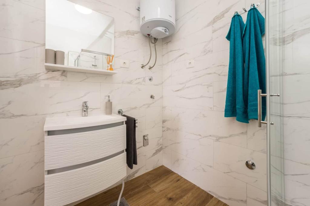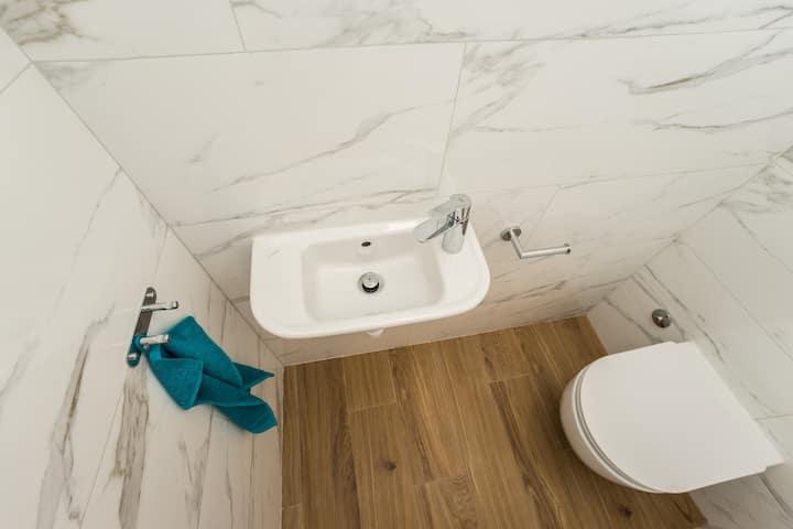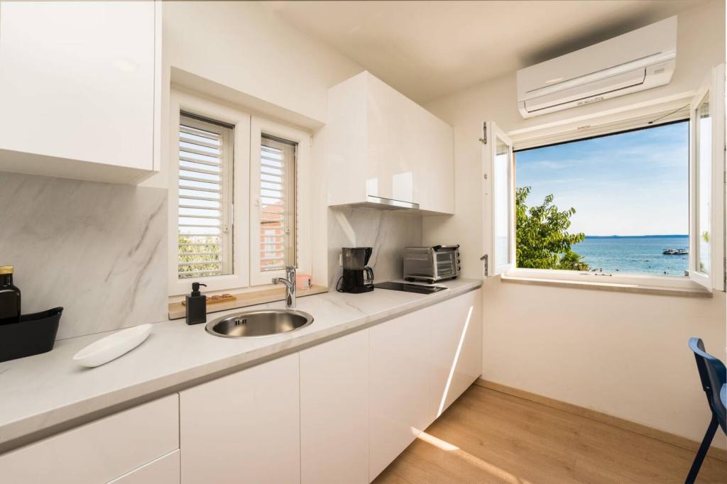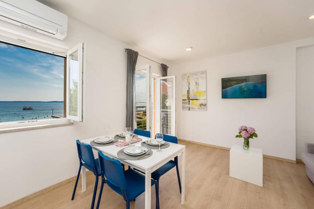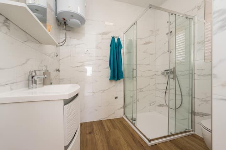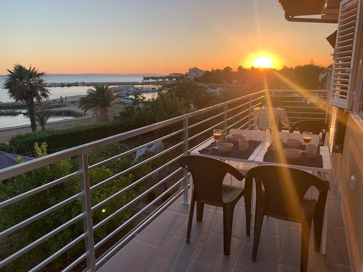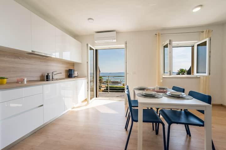 Appartements neufs et modernes dans une maison à proximité immédiate de la mer, avec une belle vue sur la mer. La plage de sable est à proximité, et vous pourrez vous baigner devant la maison. Une connexion Wi-Fi gratuite est disponible, 2 chambres sont climatisées et un parking est disponible derrière ou devant la maison. Il y a des magasins, des cafés et des restaurants à proximité. Chaque appartement dispose d'une chambre et d'un canapé dans le salon. Le salon est relié à la cuisine. Il dispose d'une salle de bain et d'un WC séparé. Il y a une jolie terrasse avec une vue extraordinaire sur la mer et une petite table où vous pourrez prendre votre petit-déjeuner le matin ou le soir avec le coucher du soleil. Profitez de vos vacances reposantes dans ces beaux appartements.