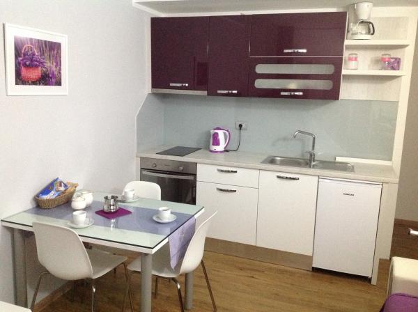 Les appartements Mak, Vanilija, Lavanda et Trešnja sont situés dans une maison moderne entièrement rénovée. Il est équipé de meubles neufs. La propriété est en première rangée de la mer. Chacun des appartements dispose d'une vue sur la mer depuis sa propre terrasse. Le quartier Palit de la ville de Rab, où se trouve l'établissement, est calme et à proximité immédiate de la plage de la ville de Škver. On y accède en 10 minutes par la promenade de la ville ou par les sentiers du parc de la ville. à la vieille ville, en même temps vous pouvez également rejoindre la nouvelle partie de la ville à pied. Depuis Škvere, il est possible de faire une excursion en bateau vers la péninsule voisine de Frkanj, qui possède de belles plages.