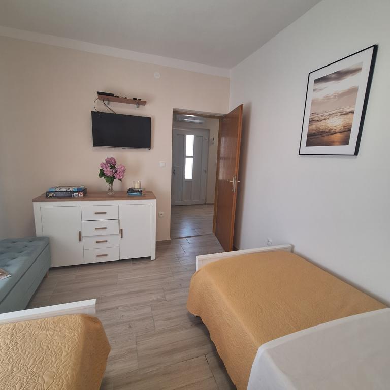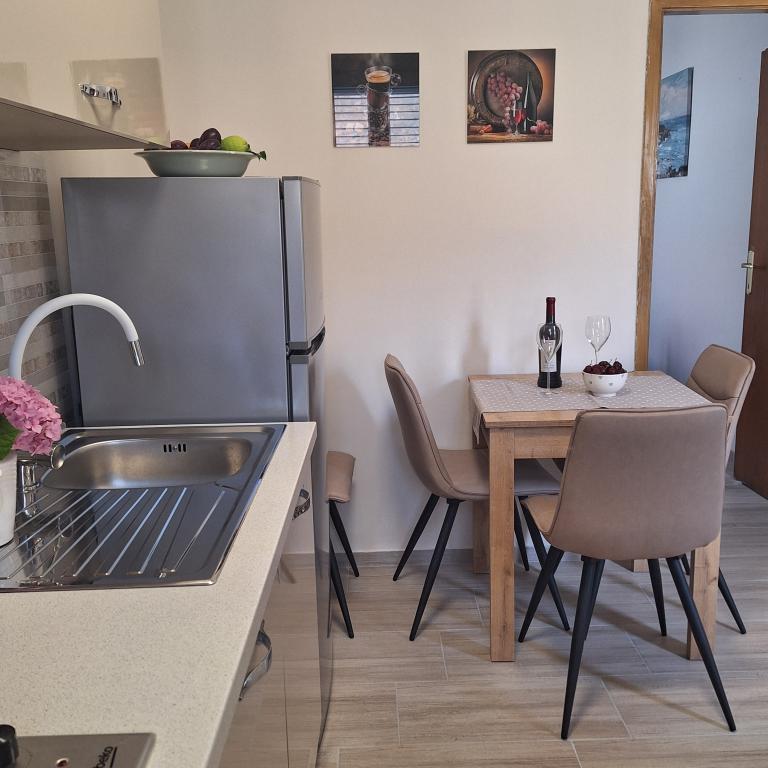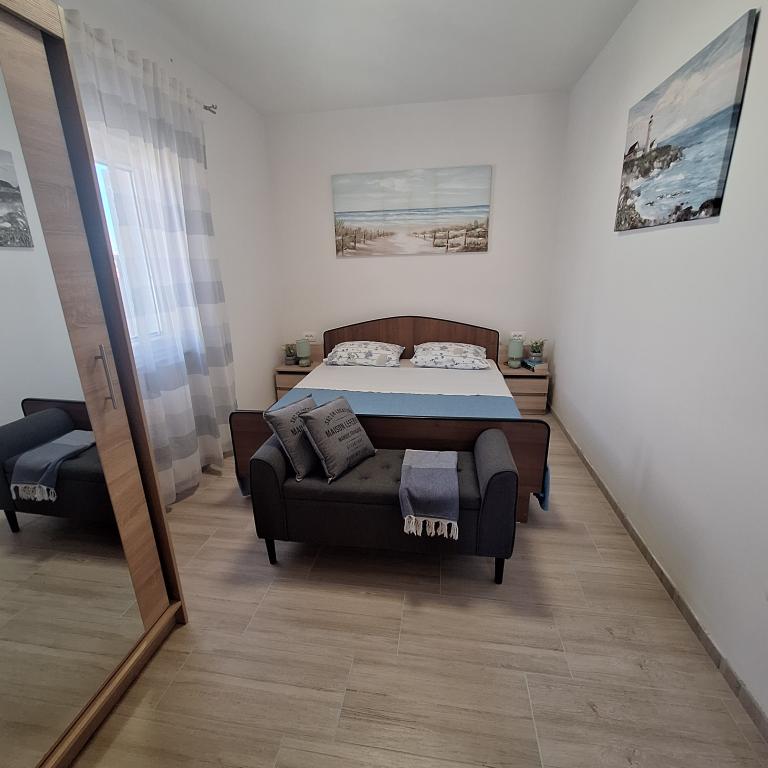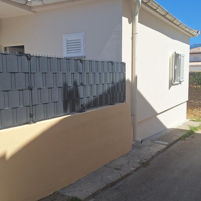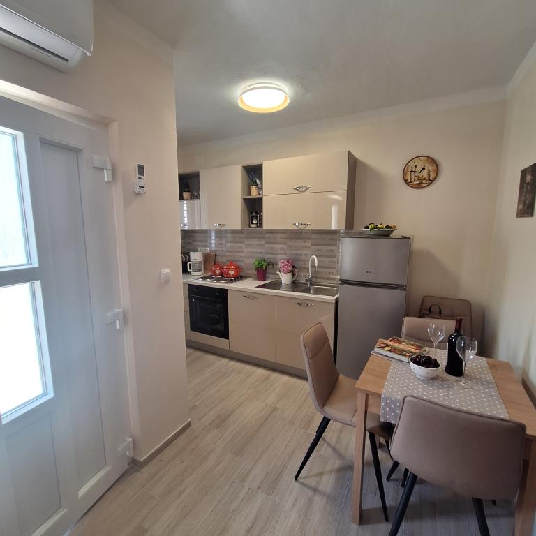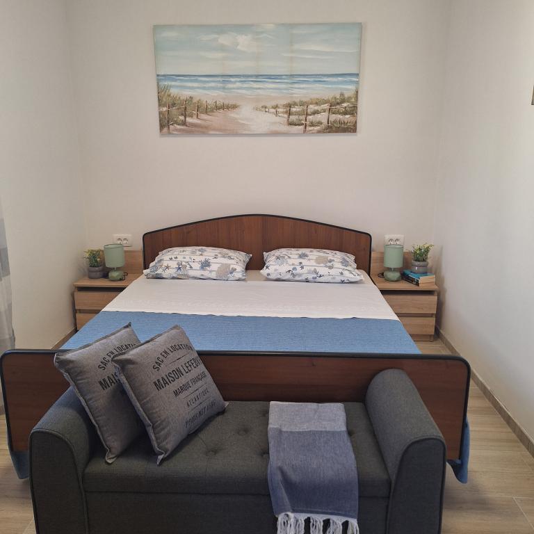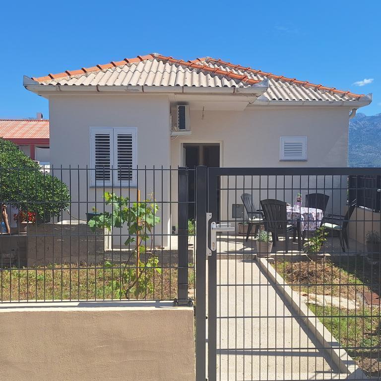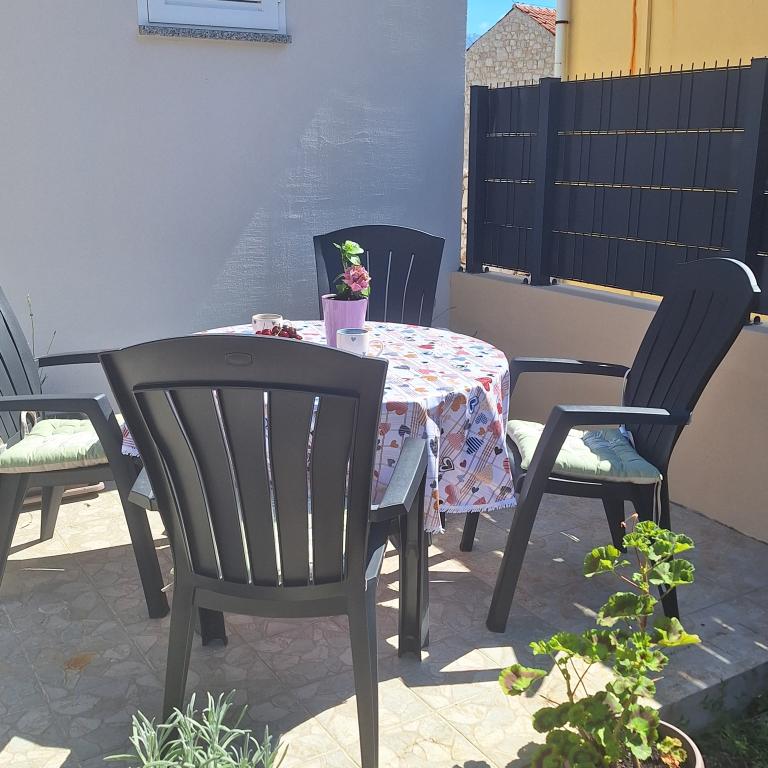 La maison entièrement meublée de 45 m2 est située à Ražanac, une petite ville avec vue sur Velebit. La maison est située à quelques minutes à pied du centre même de Ražanac, des restaurants, de la pharmacie, des magasins, de la poste, du marché aux poissons, du marché. . Le premier magasin se trouve à une minute à pied, le supermarché Tommy est à environ 10 minutes à pied. Il y a un parking pour une petite voiture dans la maison. La maison se compose d'une cuisine, d'une salle de bain avec WC et douche et de deux chambres. Il dispose de la climatisation, d'un lave-vaisselle, d'un lave-linge, d'une machine à café, d'une bouilloire, d'un four, d'un réfrigérateur avec petit congélateur, d'un sèche-cheveux, d'un sèche-linge, d'un fer et d'une planche à repasser, de serviettes, de vaisselle pour 6 personnes. Les deux chambres disposent de téléviseurs avec récepteur TV max. Une connexion Wi-Fi gratuite est également disponible. Devant la maison se trouve une terrasse avec une table et des chaises et un parasol.