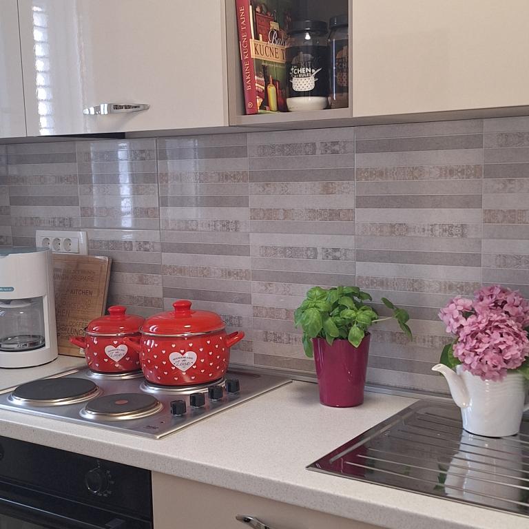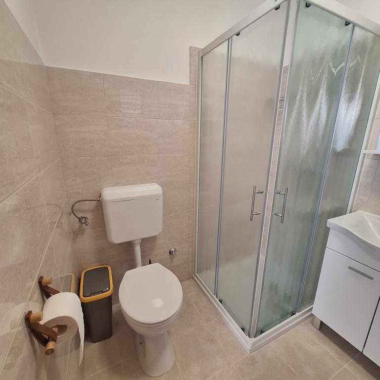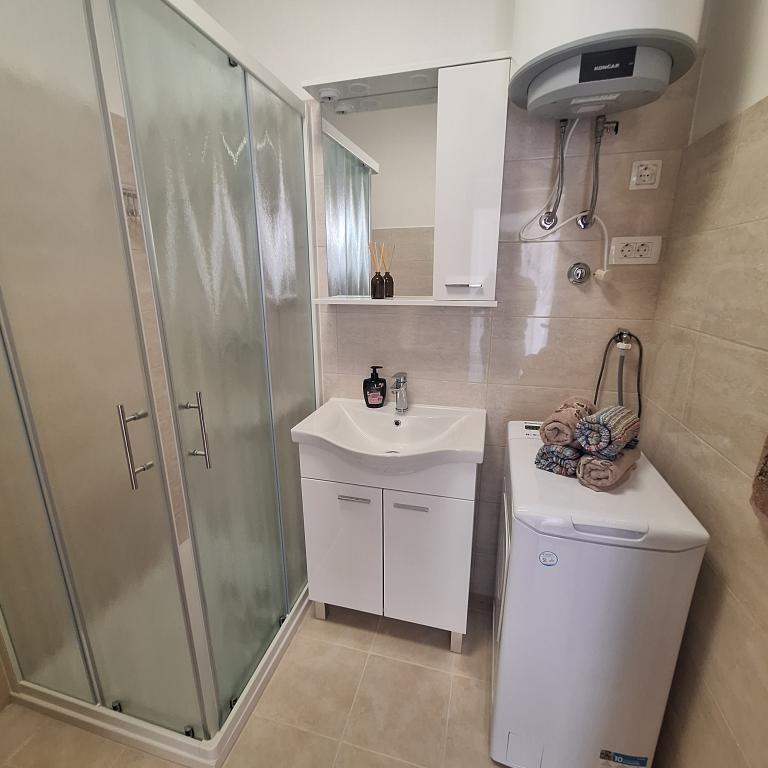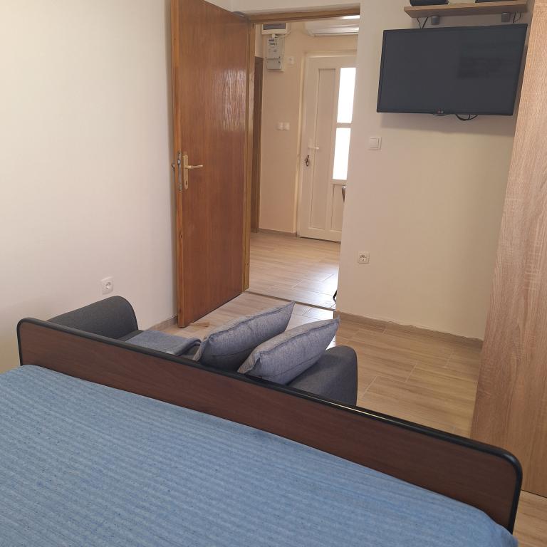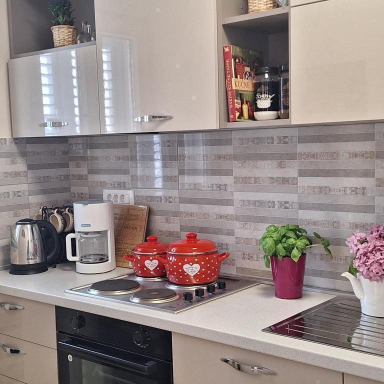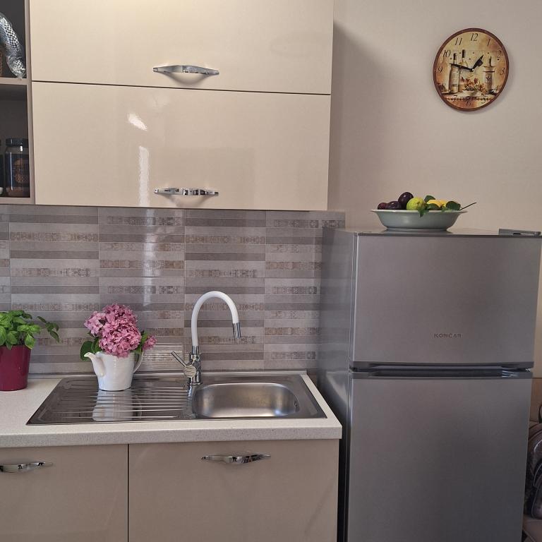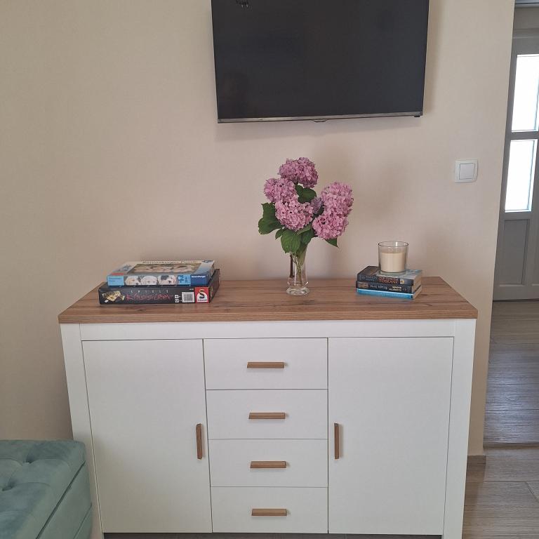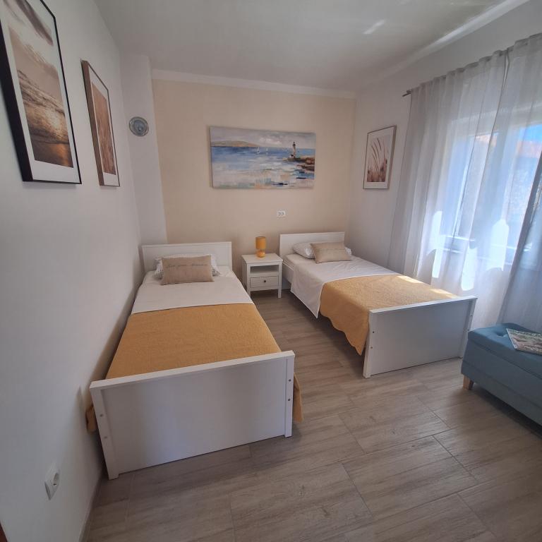 La maison entièrement meublée de 45 m2 est située à Ražanac, une petite ville avec vue sur Velebit. La maison est située à quelques minutes à pied du centre même de Ražanac, des restaurants, de la pharmacie, des magasins, de la poste, du marché aux poissons, du marché. . Le premier magasin se trouve à une minute à pied, le supermarché Tommy est à environ 10 minutes à pied. Il y a un parking pour une petite voiture dans la maison. La maison se compose d'une cuisine, d'une salle de bain avec WC et douche et de deux chambres. Il dispose de la climatisation, d'un lave-vaisselle, d'un lave-linge, d'une machine à café, d'une bouilloire, d'un four, d'un réfrigérateur avec petit congélateur, d'un sèche-cheveux, d'un sèche-linge, d'un fer et d'une planche à repasser, de serviettes, de vaisselle pour 6 personnes. Les deux chambres disposent de téléviseurs avec récepteur TV max. Une connexion Wi-Fi gratuite est également disponible. Devant la maison se trouve une terrasse avec une table et des chaises et un parasol.