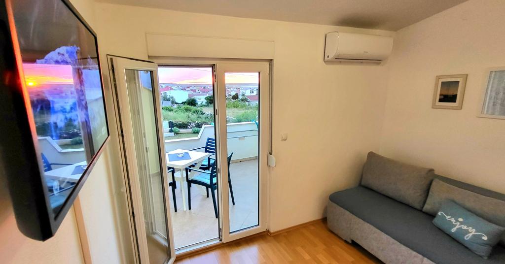 Les appartements sont situés au premier étage d'une maison familiale. Chaque appartement se compose d'une chambre, d'une cuisine et d'un salon, d'un hall, d'une salle de bains et d'un balcon avec une belle vue sur la mer et la montagne Velebit, et est destiné à max. 4 personnes. Il y a un lit double dans la chambre et un lit d'appoint dans le salon, qui dans les appartements A et B peut accueillir 2 enfants, tandis que dans l'appartement C, un lit d'appoint peut également accueillir 2 adultes. Entre autres choses, les appartements disposent du wi-fi, de la télévision par satellite, de la climatisation, d'un fer et d'une planche à repasser. Vous pourrez également utiliser la machine à laver commune située dans le garage, ainsi que le grill et le parking privé situé à l'intérieur de la cour de la maison. La maison est située dans un environnement calme sans beaucoup de bruit et de circulation, et à proximité de tout ce que cet endroit a à offrir, et à seulement 3 minutes à pied de la plage, idéale pour une détente complète et profiter de vos vacances annuelles.