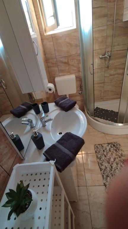 Nous avons passé 12 jours dans l'appartement Fiso avec une autre famille et, surtout, notre compagnon à quatre pattes, car sans chien, nous n'avons nulle part où aller. Tout était parfait : l'appartement est au rez-de-chaussée, il y a de la verdure autour de la maison et une grande terrasse pour les soirées, et le chien peut être à nos côtés. L'endroit est petit et il n'y a pas de touristes qui se promènent ou qui crient au-dessus de nos têtes sur la plage, ce qui est idéal pour se détendre. Peut-être que le magasin manque un peu, mais nous en avons quand même apporté la plupart avec nous. L'emplacement est idéal car vous pouvez être dans les villes environnantes comme Primošten et Trogir en un rien de temps. Un autre conseil pour nos chers hôtes : rafraîchissez l'annonce, car elle est bien plus complète que ce qui est indiqué. Le propriétaire possède un micro-ondes et un lave-vaisselle. Je suggère d'installer un bac en plastique dans la salle de bain pour pouvoir sortir le linge avant de le mettre à sécher. Merci encore du fond du cœur.