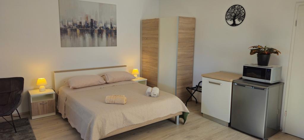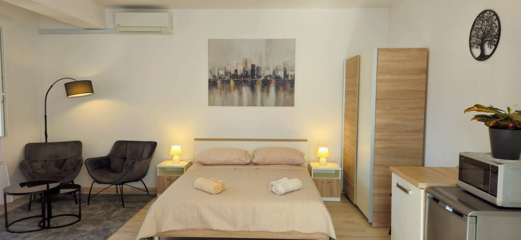 La maison dans un emplacement privilégié. Belle vue sur la mer et la ville depuis le balcon juste en face. Studio neuf et moderne. Vous n'entendez absolument aucun bruit dans la maison. Des hôtes très aimables et sympathiques. Hautement recommandé.