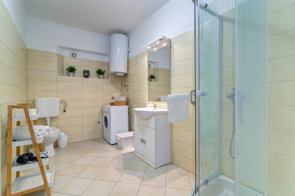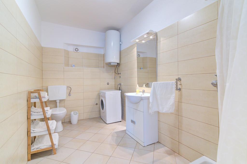 Un grand appartement confortable, bien équipé, avec climatisation, mais sans lave-vaisselle. C'est comme dans la description et les photos. Le propriétaire est très gentil ; Nous avons communiqué en anglais, mais vous pouvez également communiquer en langue « slave ». Il faut quelques minutes à pied pour rejoindre la plage la plus proche en empruntant des rues résidentielles, en traversant une route très fréquentée et 200 marches au bout. Ça vaut vraiment le coup parce que c'est beau ! Même si c'est petit, à chaque fois que nous y étions, il y avait de la place pour nous six (nous étions à Senj début juillet). Sur le côté de la plage, il y a un endroit d'où vous pouvez sauter dans l'eau, vous pouvez également traverser l'eau ou nager jusqu'à une plage similaire à côté, ou plus loin vers les rochers. Il y a une source sur la plage (semblable à d'autres endroits de la région) qui donne un effet très intéressant. Près du rivage, l’eau douce et plus froide s’accumule en une fine couche à la surface, au-dessus de l’eau de mer plus chaude, avant de se mélanger à celle-ci dans la mer ondulante. Au centre de Senj, il y a deux grands supermarchés (à 5 minutes en voiture de l'appartement), des restaurants et des glaciers. Il y a aussi deux plages partiellement bétonnées au centre. Vous pouvez vous garer sur les deux sites et sur l'un d'eux se trouve une plateforme de saut. A proximité se trouvent deux terrains où, après avoir pris un bain de soleil, nous avons joué des matchs de football internationaux jusqu'au coucher du soleil. Nous n'avons pas eu le temps de visiter les montagnes qui entourent la ville, mais ça vaut vraiment le coup.