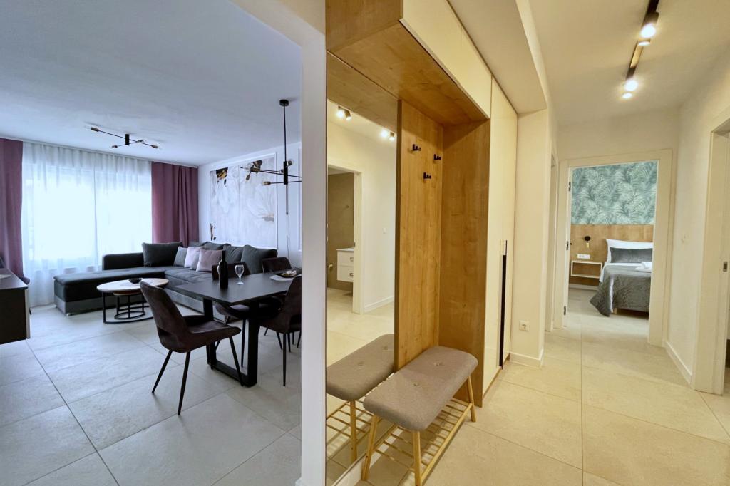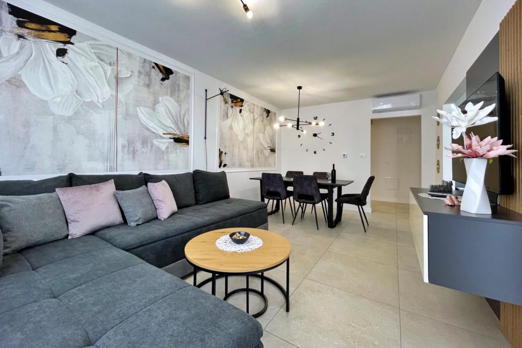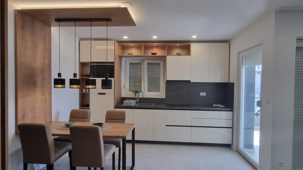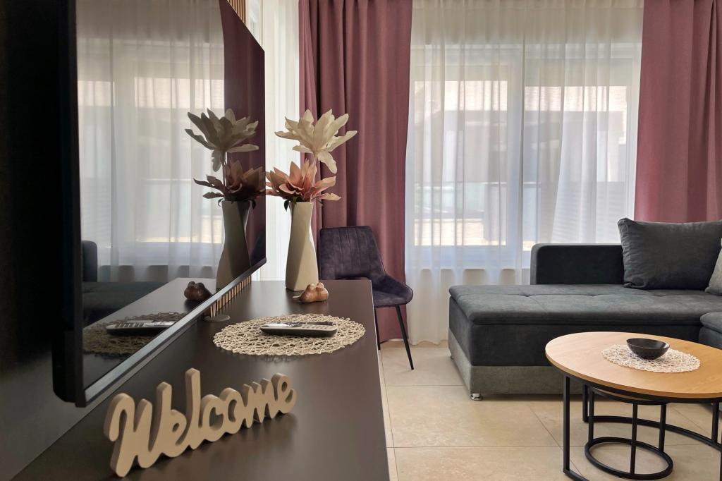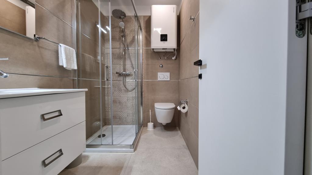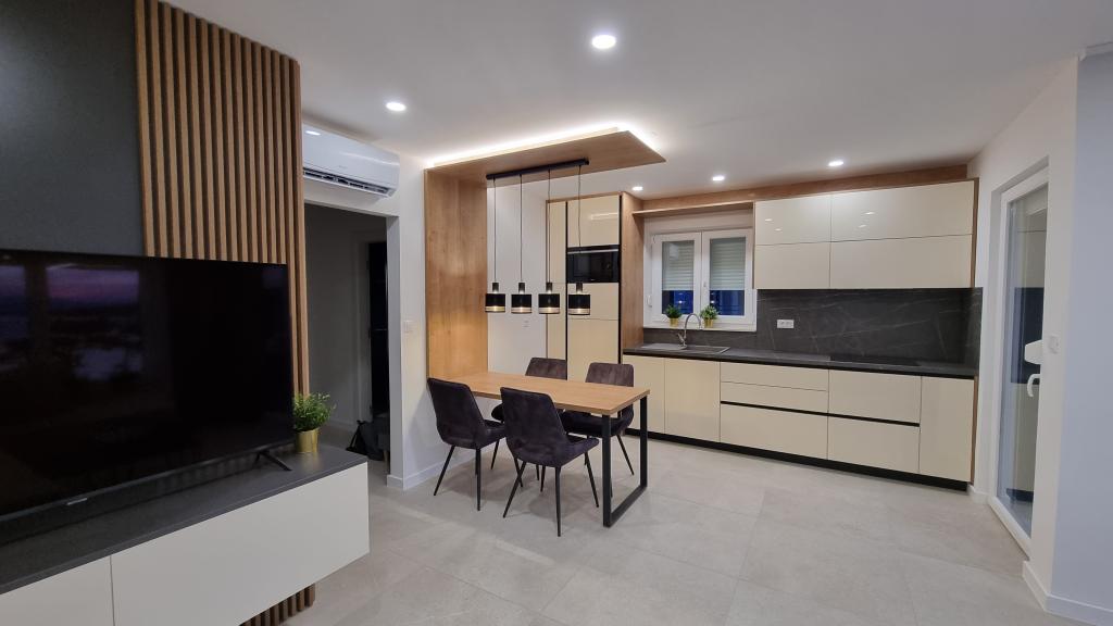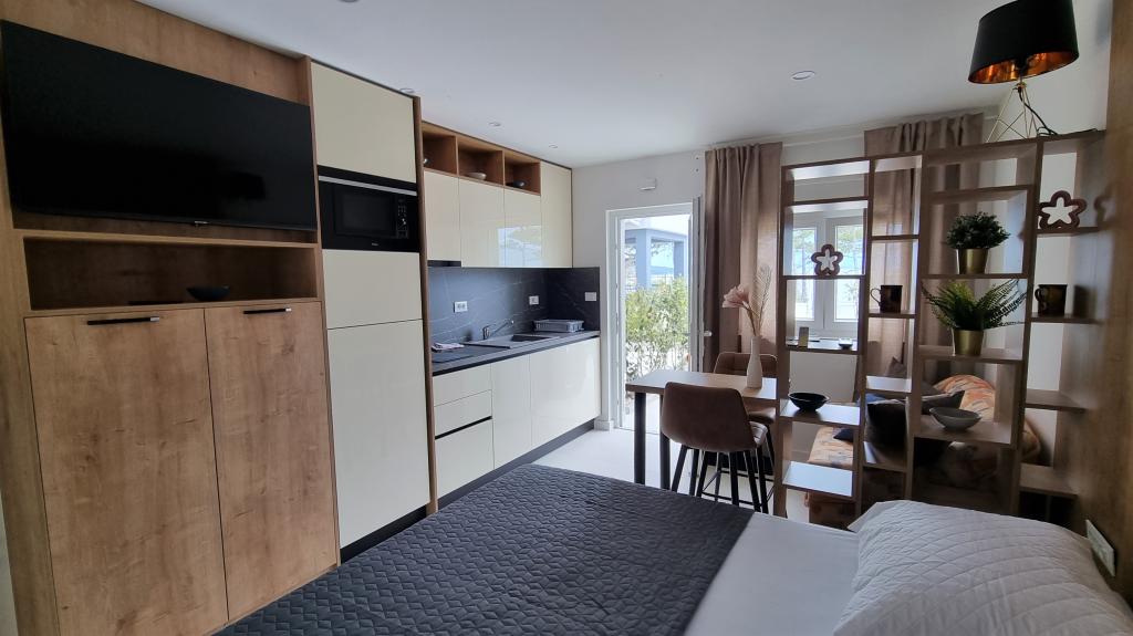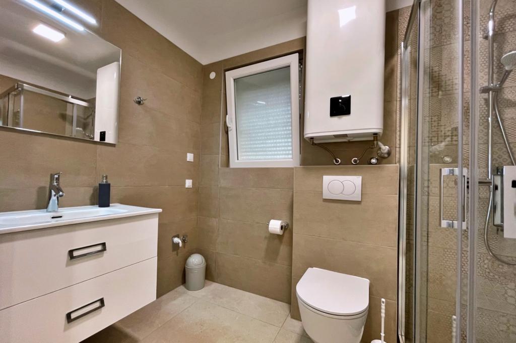 Ces appartements de luxe avec vue sur la mer sont situés dans un complexe d'immeubles dans un endroit calme. Tous les appartements sont équipés de façon moderne de deux, voire trois climatiseurs et de télévisions intelligentes dans les salons et les chambres. Le bâtiment dispose d'une grande piscine d'eau salée (36 m2) à usage commun, ouverte de mai à octobre, avec des températures qui atteignent généralement 20-26°C. Le bâtiment dispose d'un total de 12 appartements. L'immeuble dispose d'un parking privé entièrement clôturé. A proximité immédiate se trouve une grande plage de galets et dans le bâtiment adjacent se trouve un excellent restaurant qui propose également une sélection de spécialités locales. Tous les appartements sont équipés de plaques à induction, d'un réfrigérateur avec congélateur, d'une bouilloire, d'une cafetière, d'un grille-pain, d'un lave-vaisselle et d'un four micro-ondes. L'espace à côté de la piscine est équipé de chaises longues, de parasols et d'une douche extérieure. Une connexion Wi-Fi gratuite est disponible dans tout le bâtiment.