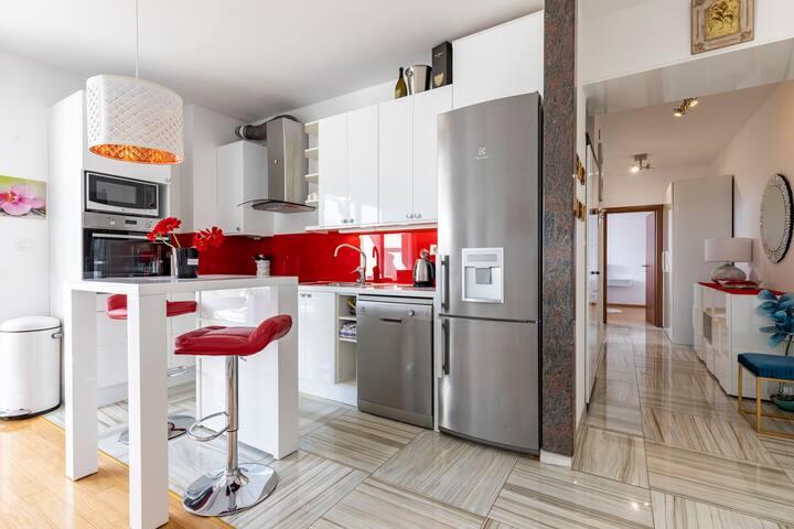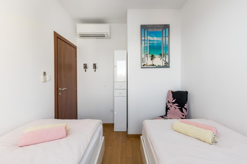 Appartement 2 chambres à Bačvice, 3 climatiseurs, terrasse, parking en garage, ascenseur, à 2 minutes de la plage et à 10 minutes à pied du centre-ville. Ce bel appartement de deux chambres, situé en plein cœur de Split, offre une superficie de 70 m², une terrasse, une baignoire balnéo et la climatisation dans chaque pièce. La mer est à 50 m. Ce logement unique est idéalement situé à proximité de tous les points d'intérêt, facilitant ainsi l'organisation de votre séjour. Le centre-ville et le palais de Dioclétien sont accessibles en 15 minutes à pied. Vous bénéficiez d'une place de parking privée en garage et d'un accès direct à l'appartement par ascenseur. L'appartement se trouve au 3ème étage d'un immeuble récent. Supermarché à 300 m, restaurants à 100 m, café à 50 m, excursions en bateau à 500 m, port de ferry à 200 m, gare routière à 200 m. Les clés de l'appartement et du garage se trouvent dans le coffre à clés au rez-de-chaussée de l'immeuble. Vous recevrez le code du coffre-fort par e-mail après avoir effectué votre réservation.