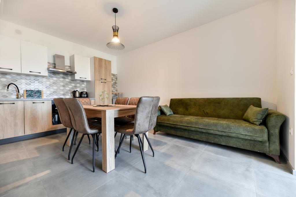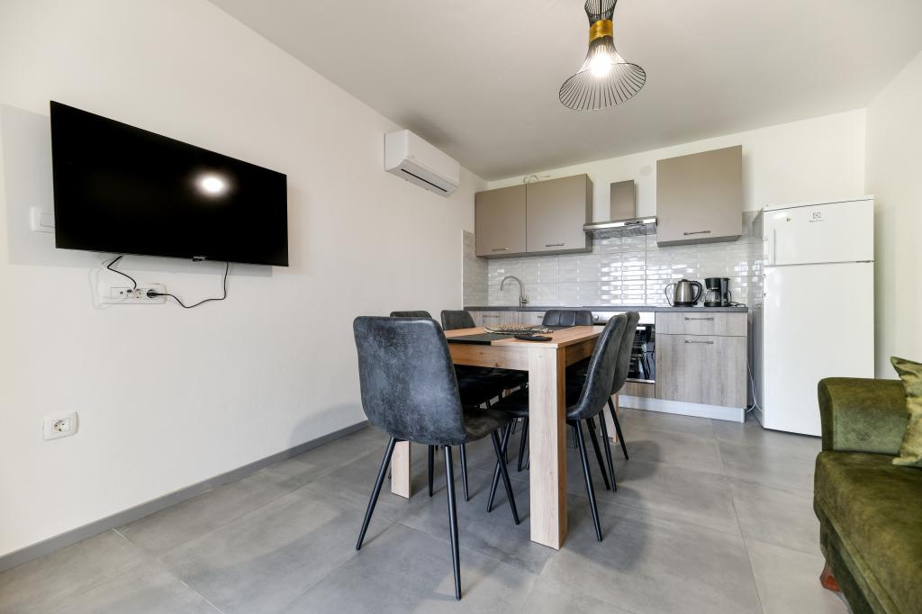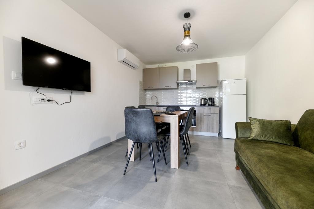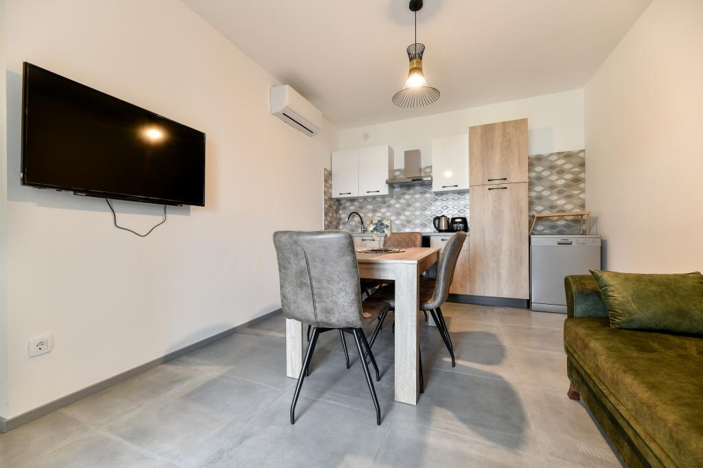 Les appartements sont neufs, beaux, entièrement équipés. Nous y retournons à plusieurs reprises depuis 5 ans, pour la vue magnifique sur la mer, la détente parfaite et le bien-être. La mer est juste de l'autre côté du jardin et la plage pour enfants est au coin de la rue. Les propriétaires sont merveilleux, gentils, arrangeants et chaleureux. Nous reviendrons