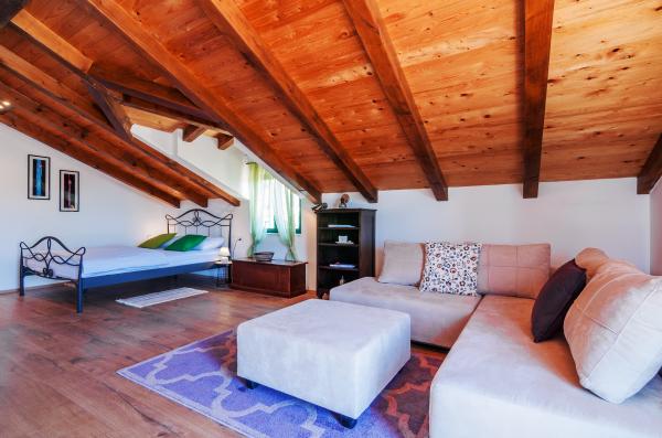 Maison de vacances Rita est un établissement récemment construit dans un quartier calme de Sukošan. Orné avec des caractéristiques traditionnelles en pierre, mobilier rustique, cheminée dans la maison ... Le rez-de-chaussée est idéal pour socialiser tout l'espace au sol pour se reposer et dormir! La chambre dispose d'un lit double et un canapé qui se transforme en fumée de lit. 160 x 200. La maison a une grande cour, parking privé, barbecue, balançoire, bac à sable ... A côté de la maison est une terrasse avec pergola. Nous attendons avec impatience de vous voir !!