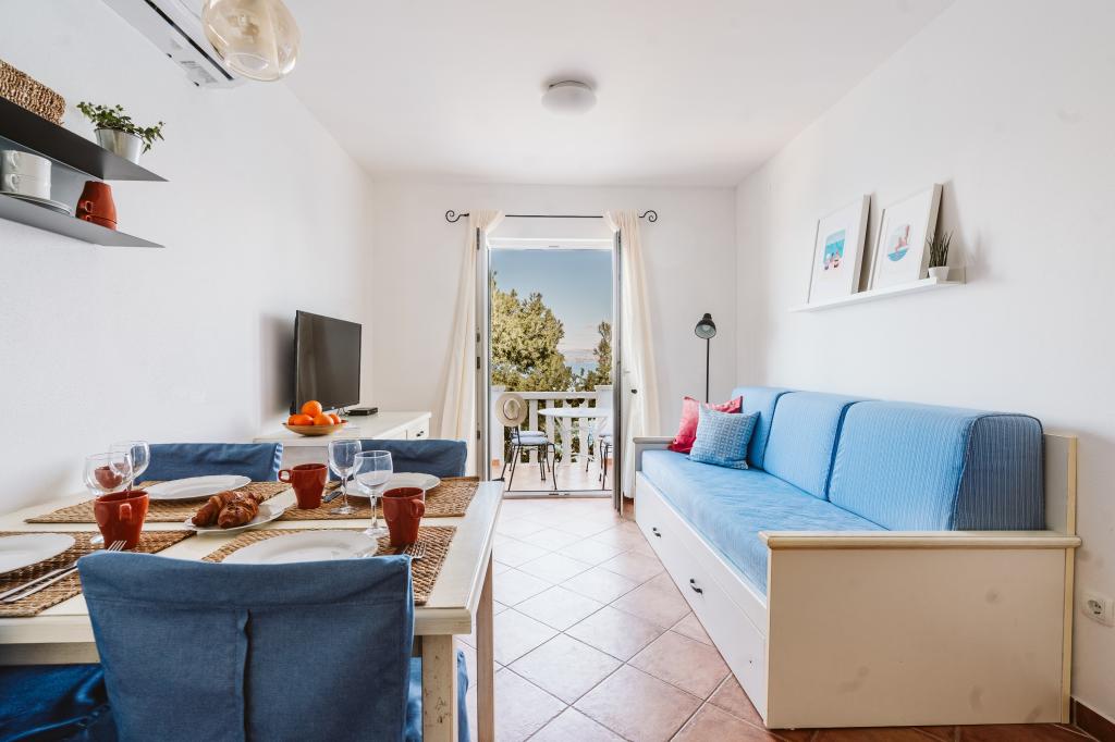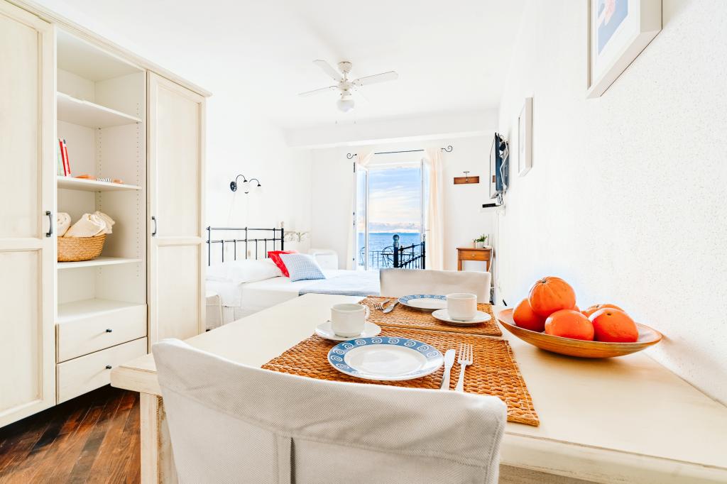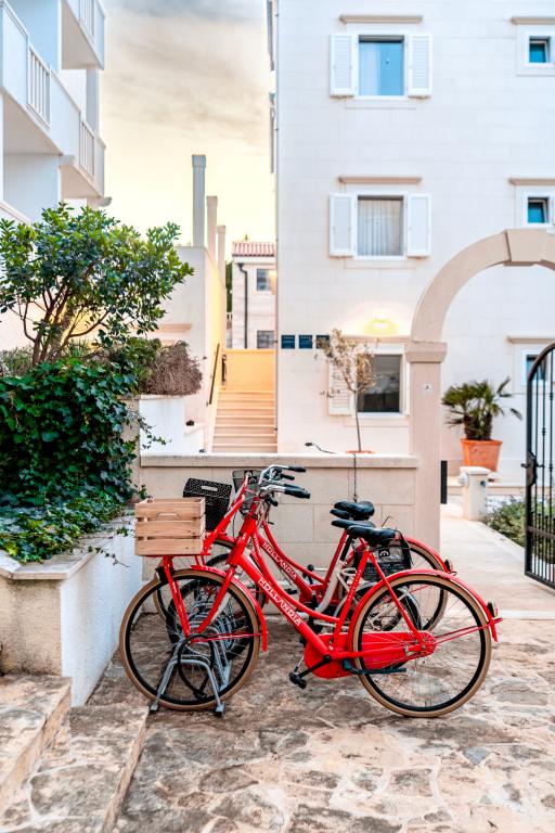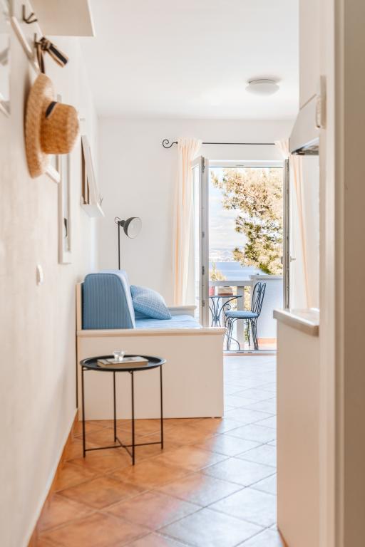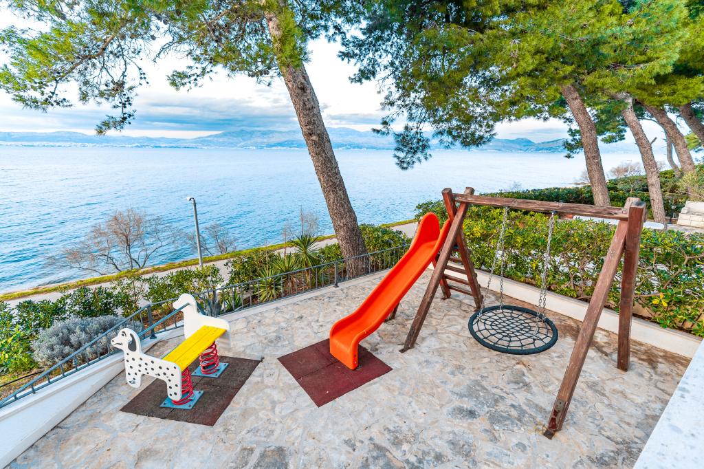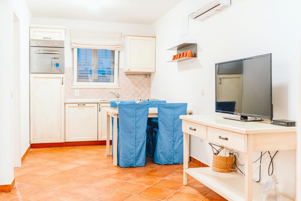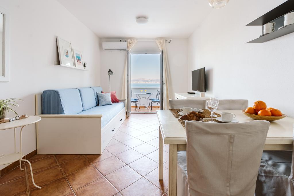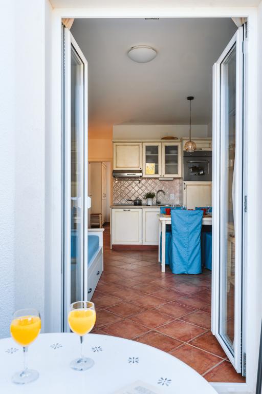 Taxe de sejour n'est pas incluse dans le prix.Tous les appartements sont climatisés et équipés de ventilateurs de plafond dans les chambres, de coffres-forts, de la télévision par satellite et d'une connexion Wi-Fi. Chaque appartement dispose d'une cuisine entièrement équipée (plaques vitrocéramiques, réfrigérateur, lave-vaisselle, four et vaisselle), d'une salle de bains (sèche-cheveux) et d'une terrasse avec vue imprenable sur la mer. Le mobilier, en bois massif, a été réalisé sur mesure et s'intègre harmonieusement à l'ambiance et à la décoration intérieure. La résidence met à disposition des vélos et une aire de jeux extérieure pour enfants.