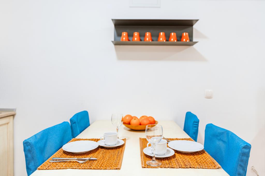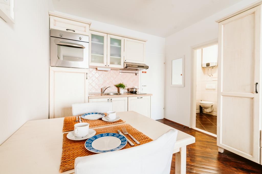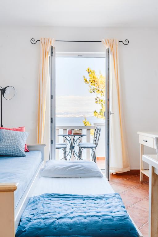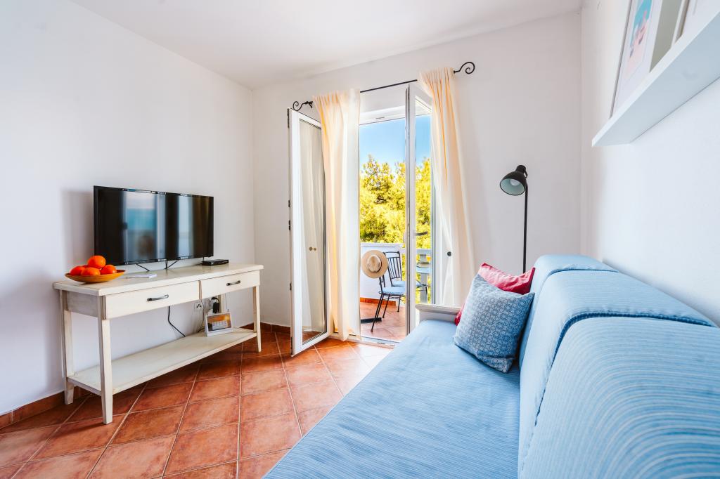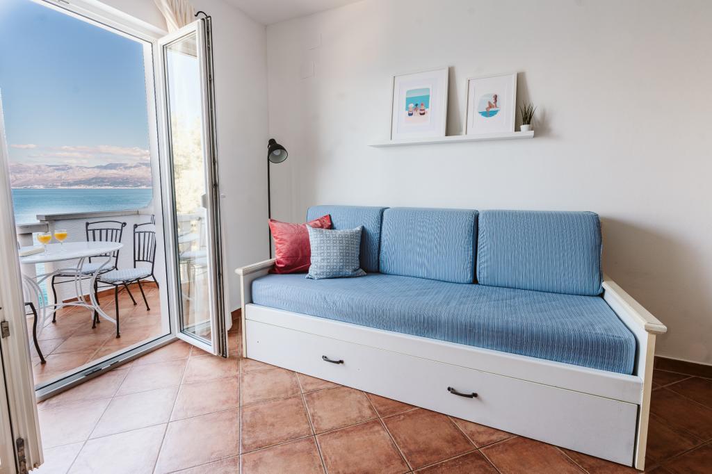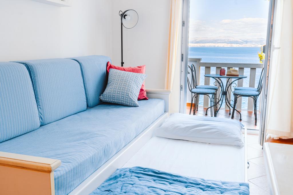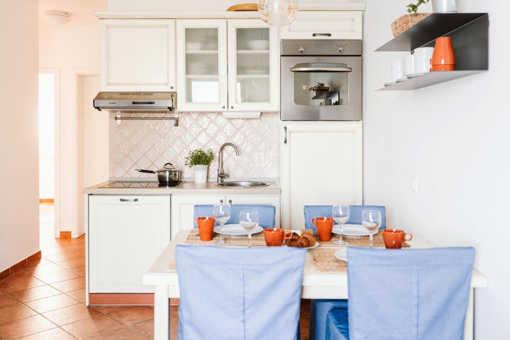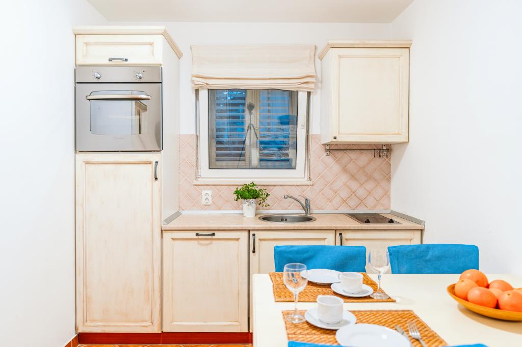 Taxe de sejour n'est pas incluse dans le prix.Tous les appartements sont climatisés et équipés de ventilateurs de plafond dans les chambres, de coffres-forts, de la télévision par satellite et d'une connexion Wi-Fi. Chaque appartement dispose d'une cuisine entièrement équipée (plaques vitrocéramiques, réfrigérateur, lave-vaisselle, four et vaisselle), d'une salle de bains (sèche-cheveux) et d'une terrasse avec vue imprenable sur la mer. Le mobilier, en bois massif, a été réalisé sur mesure et s'intègre harmonieusement à l'ambiance et à la décoration intérieure. La résidence met à disposition des vélos et une aire de jeux extérieure pour enfants.